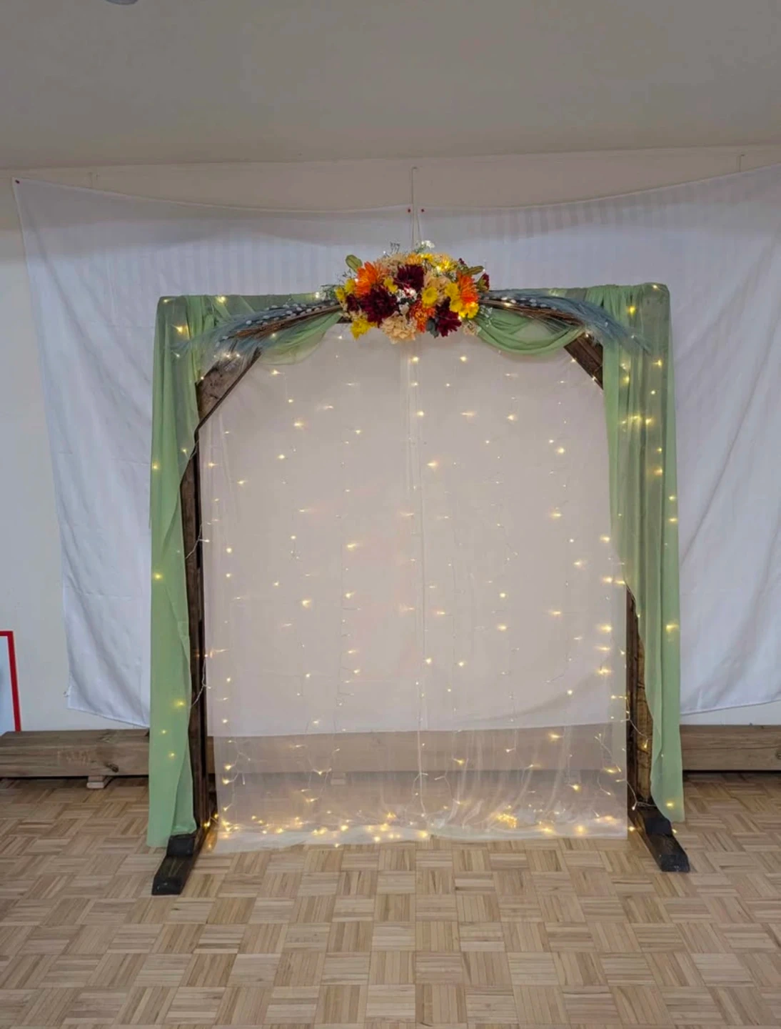 Selling a beautiful wedding arch, perfect for adding a touch of elegance to your special day! It comes with delicate fairy lights and lovely floral decorations. It's in great condition and ready to create a magical atmosphere for your wedding or event