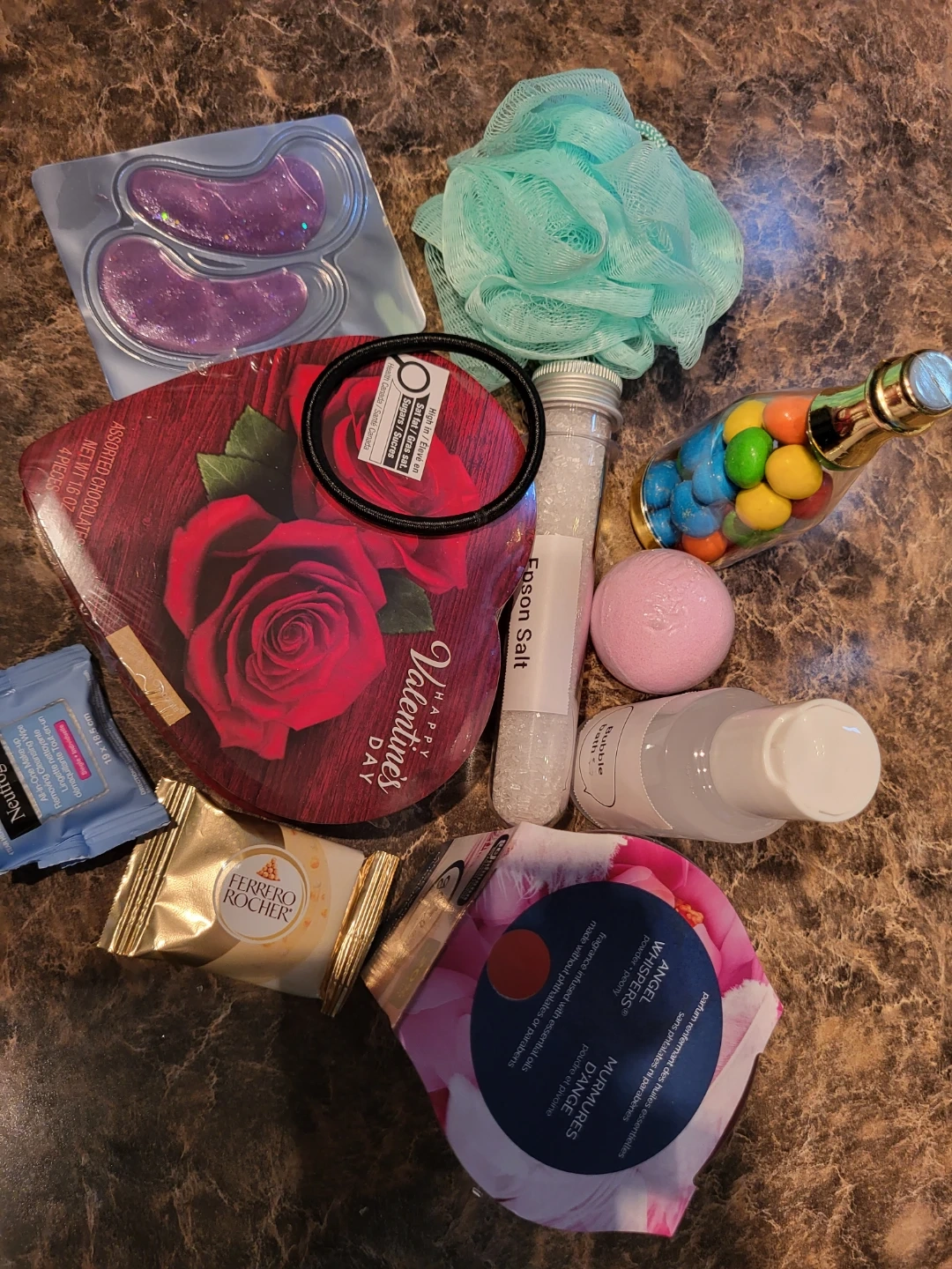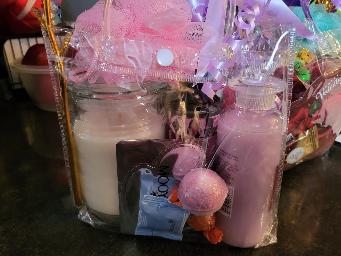 Valentine's Day gift basket filled with assorted goodies! Includes items such as a bath bomb, chocolates, a scented candle, and more! Perfect as a gift for a loved one or yourself