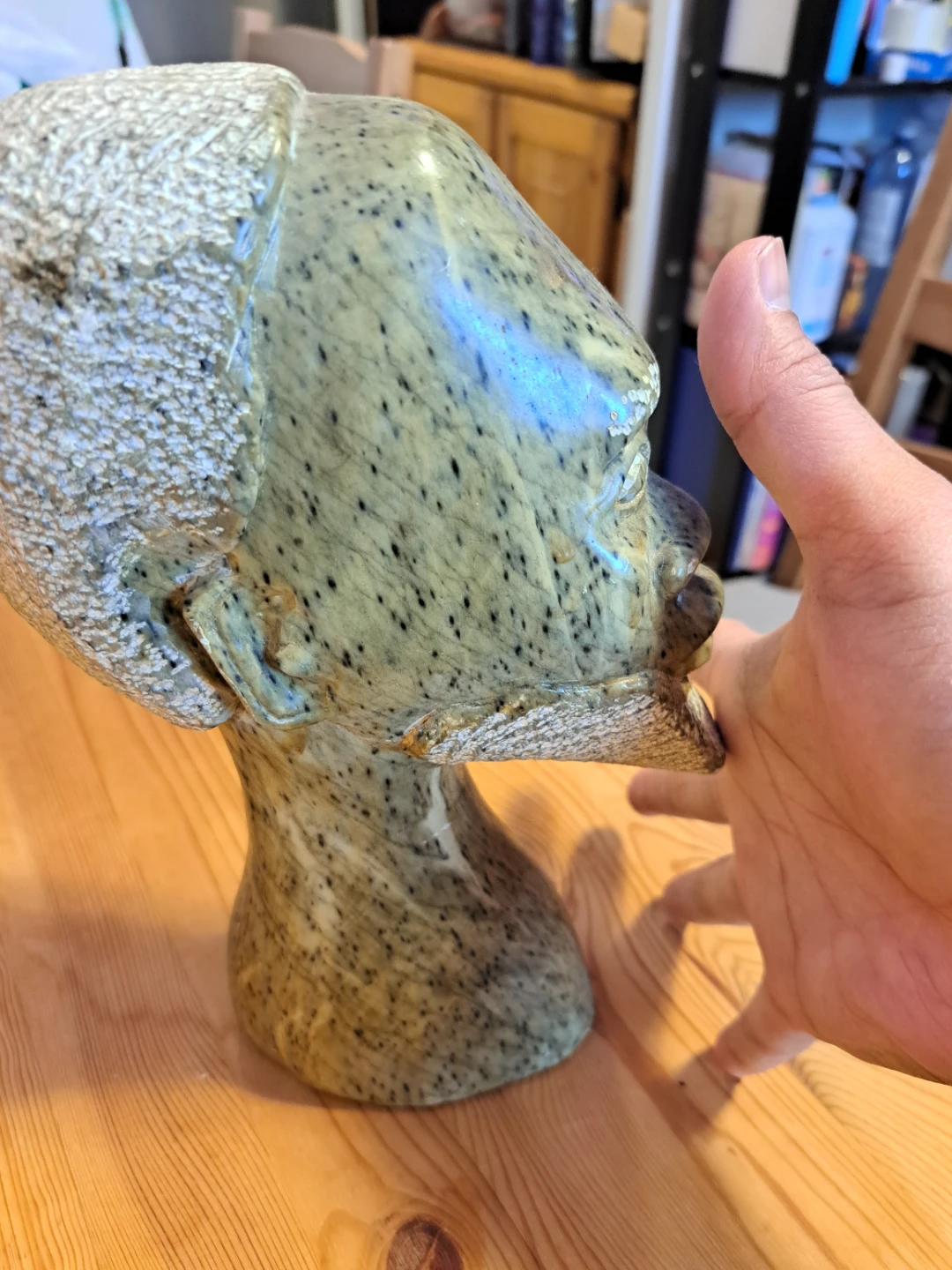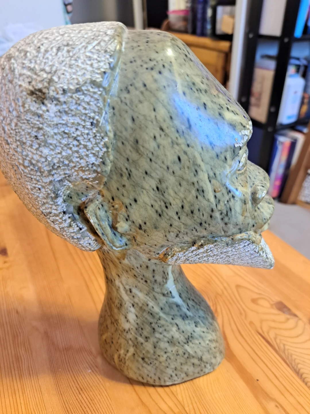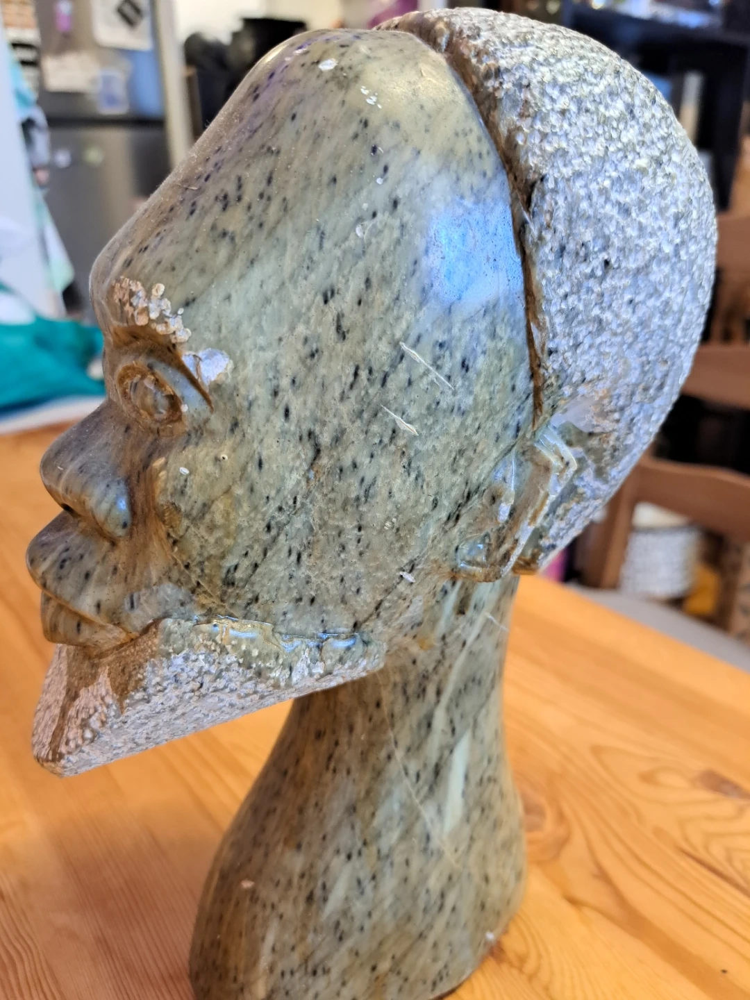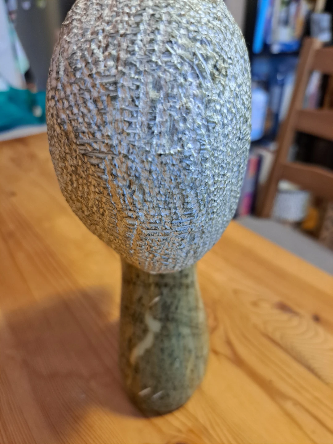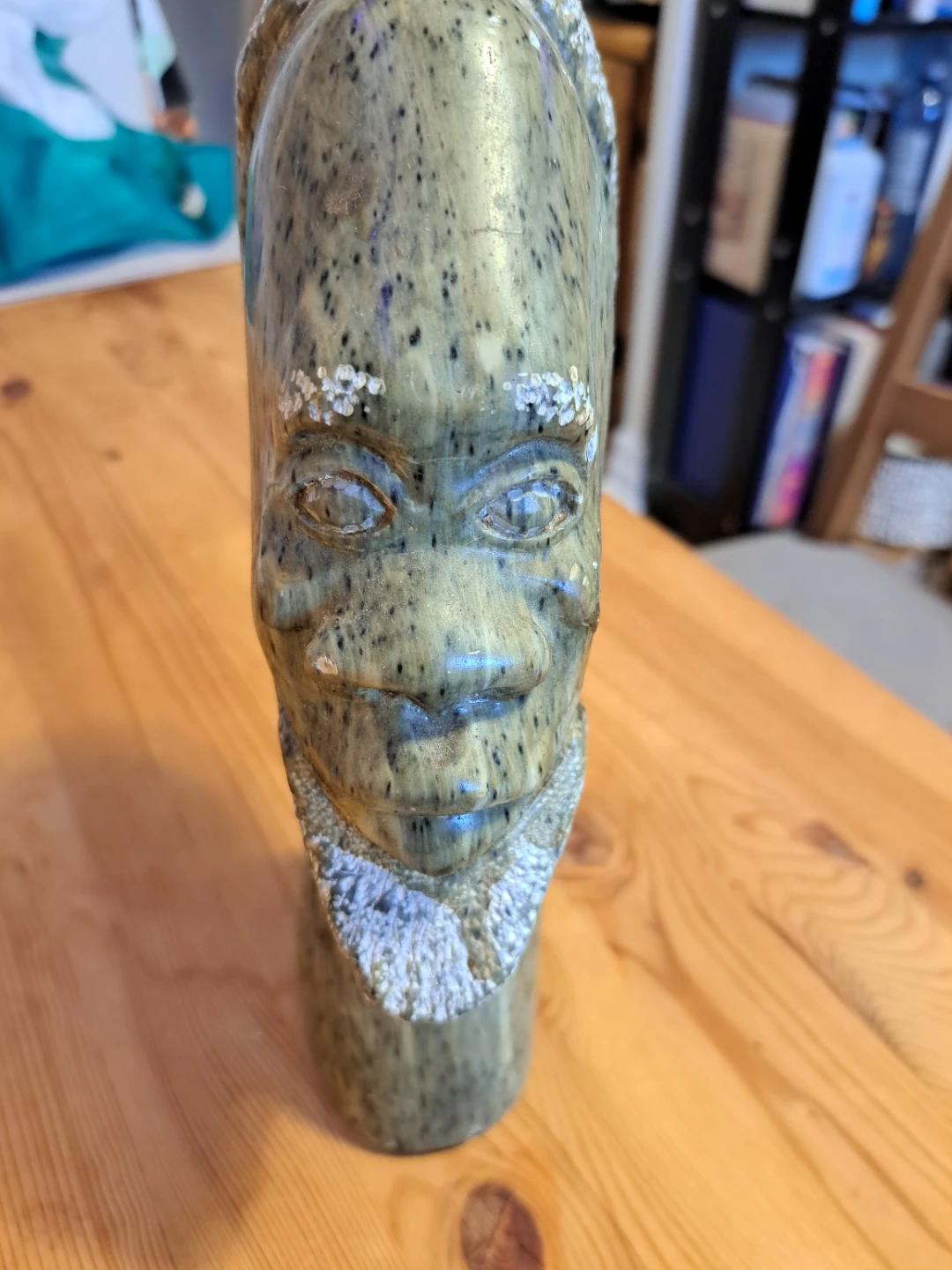 A beautiful African stone carved head sculpture. The sculpture has a unique design and texture, with a speckled grey-green colour. It would make a great addition to any home decor!
