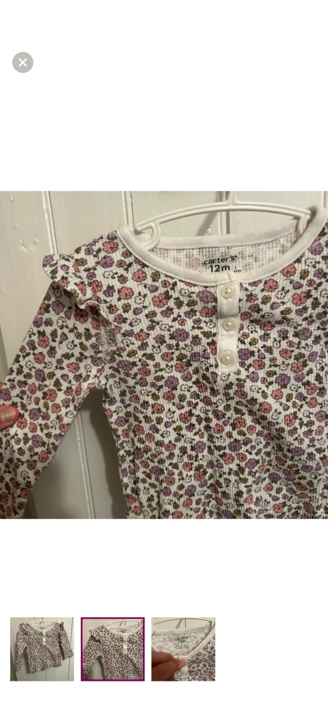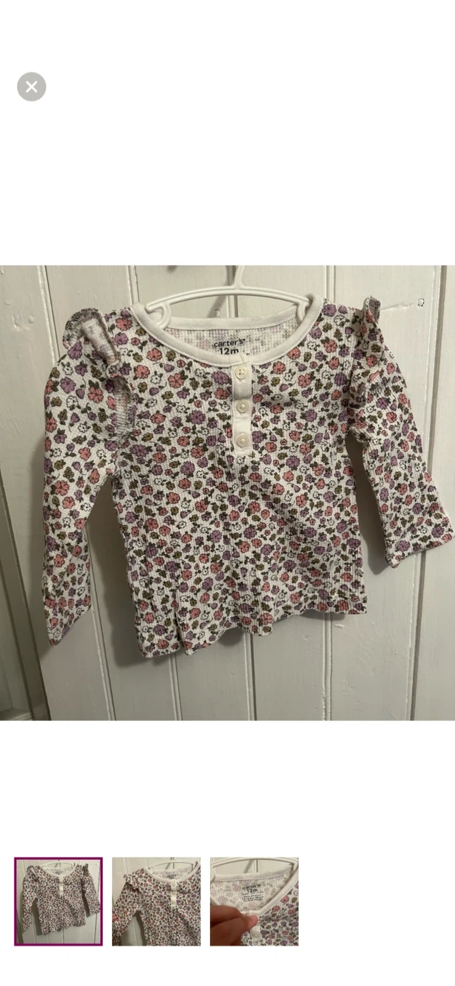 Carters brand. Long sleeve ruffle waffle knit top. White with pink & purple floral. Size 12m. Brand new condition
