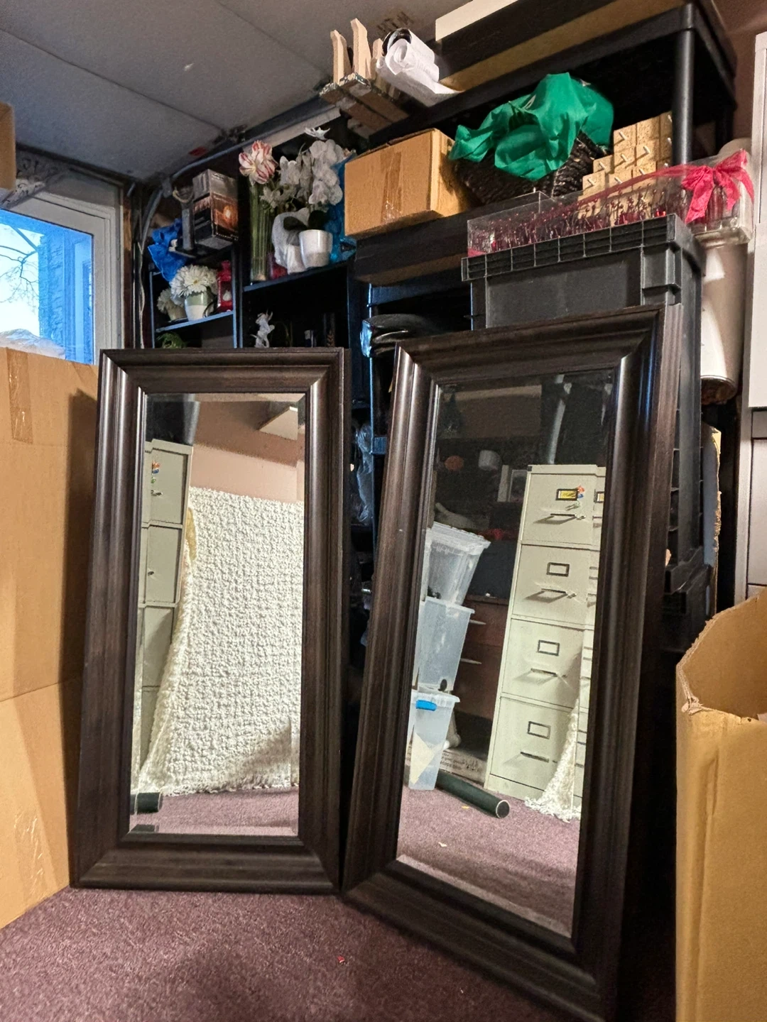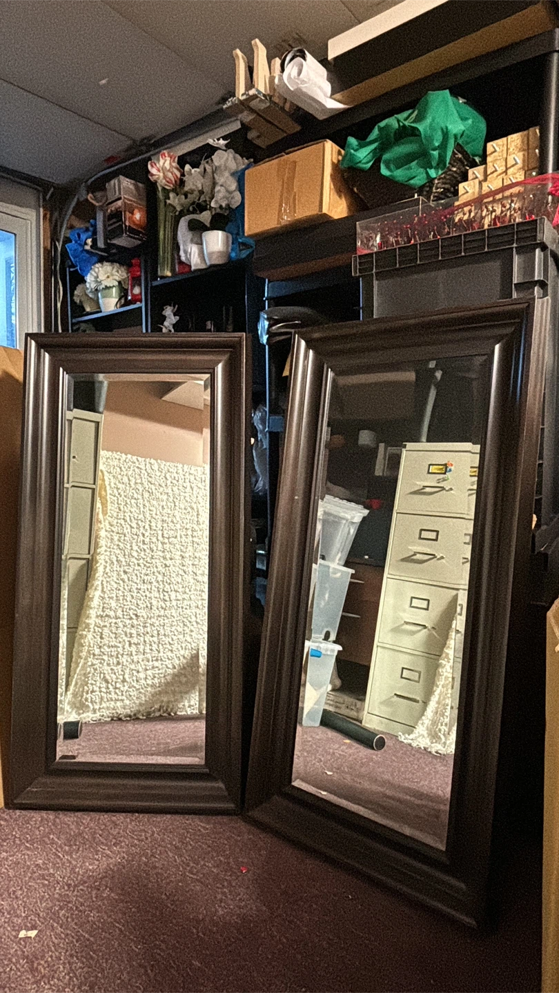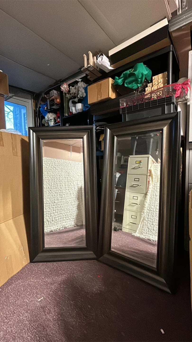 Selling a set of two framed wall mirrors! They're in great shape and ready to brighten up your space. The frames have a nice dark finish that would complement many decor styles. Perfect for adding a touch of elegance to any room