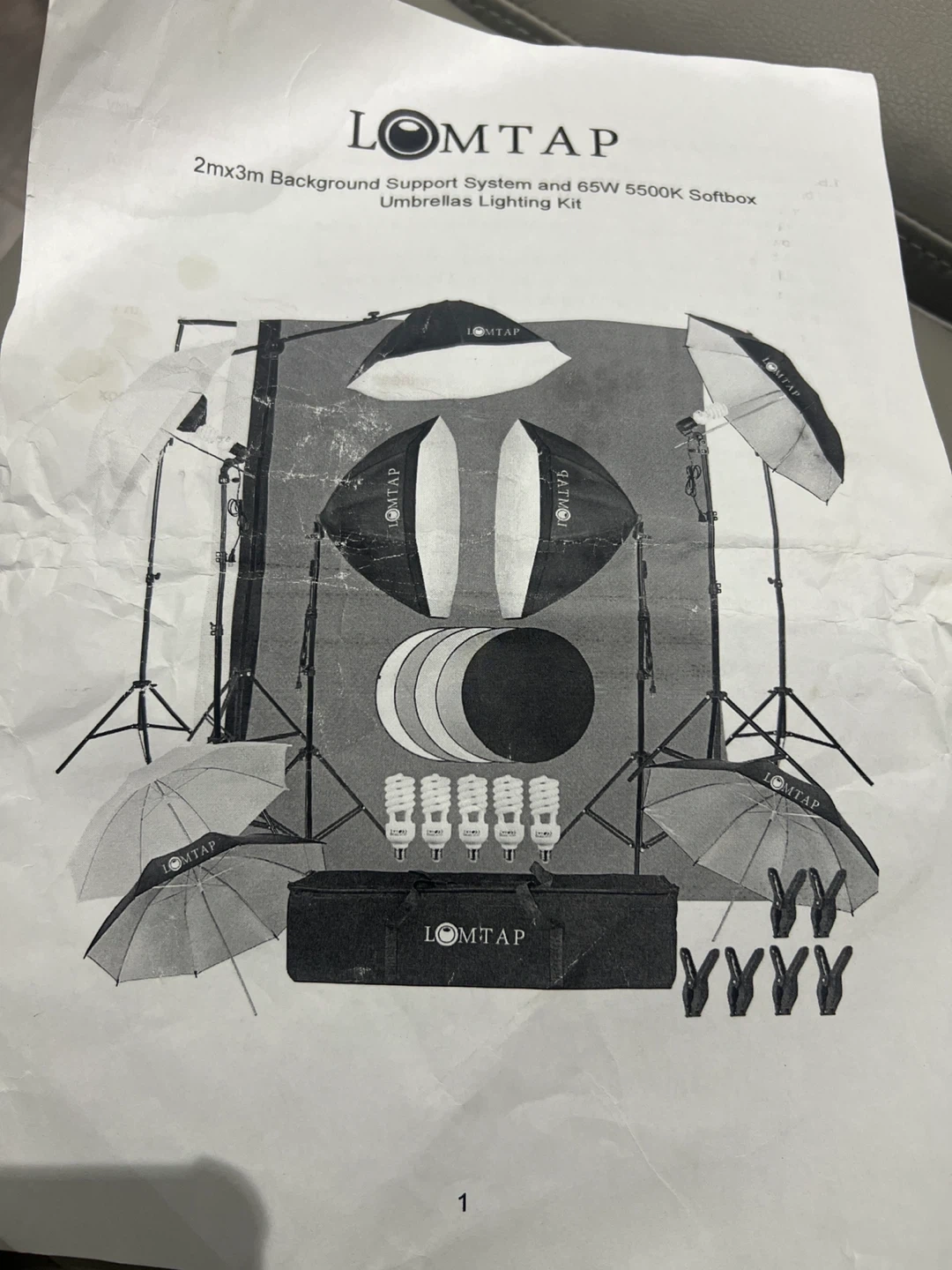 Selling a LOMTAP 2mx3m background support system and 65W 5500K softbox umbrellas lighting kit. The kit includes: