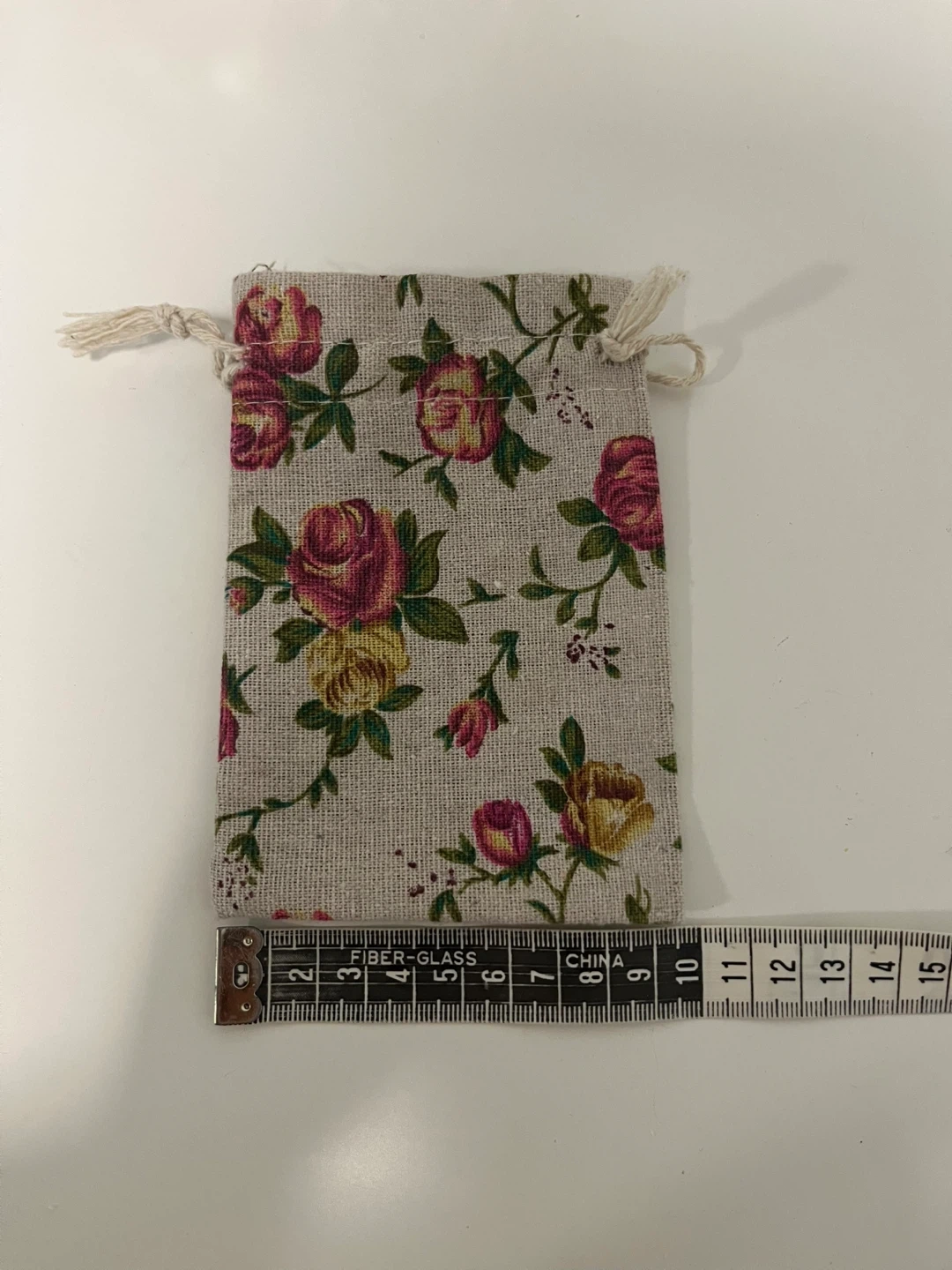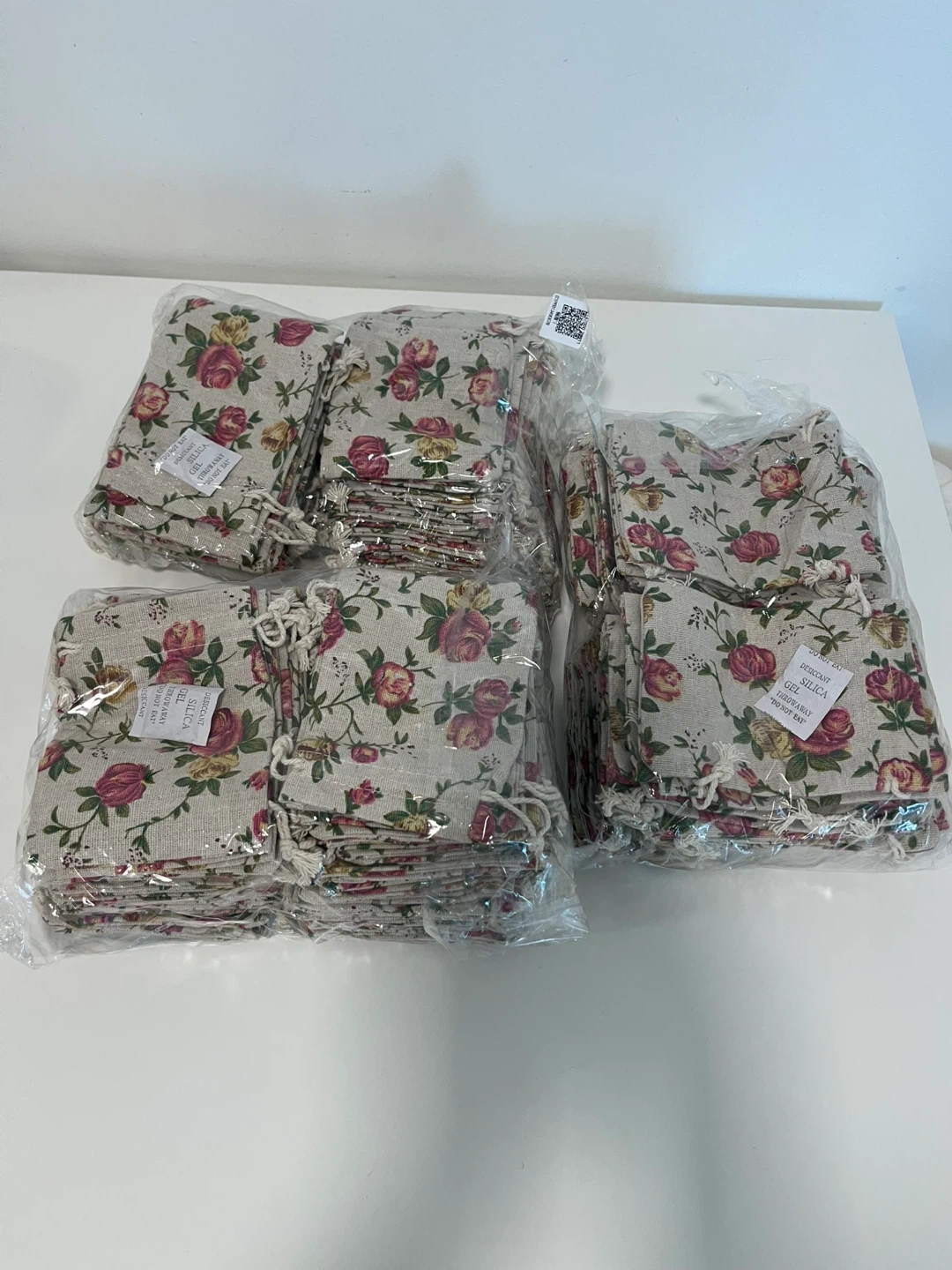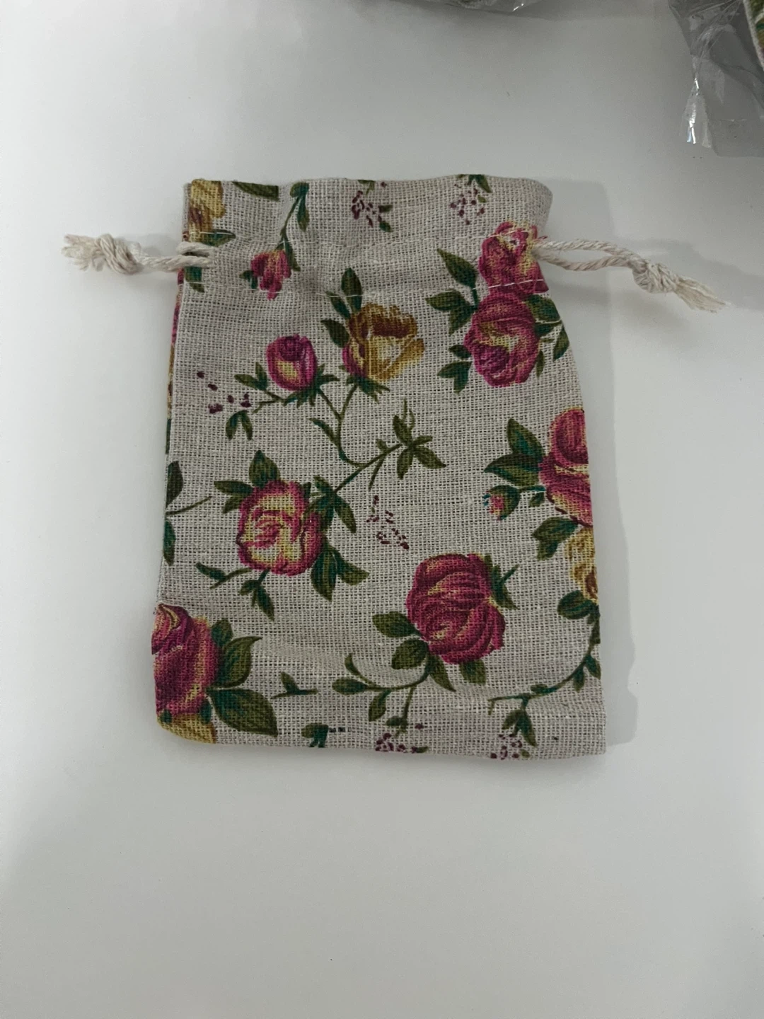 I'm selling a set of floral jute drawstring pouches! These are perfect for small gifts, party favours, or organizing your little things. The pouches have a charming rose pattern and a simple drawstring closure. There are 150 pieces in total.