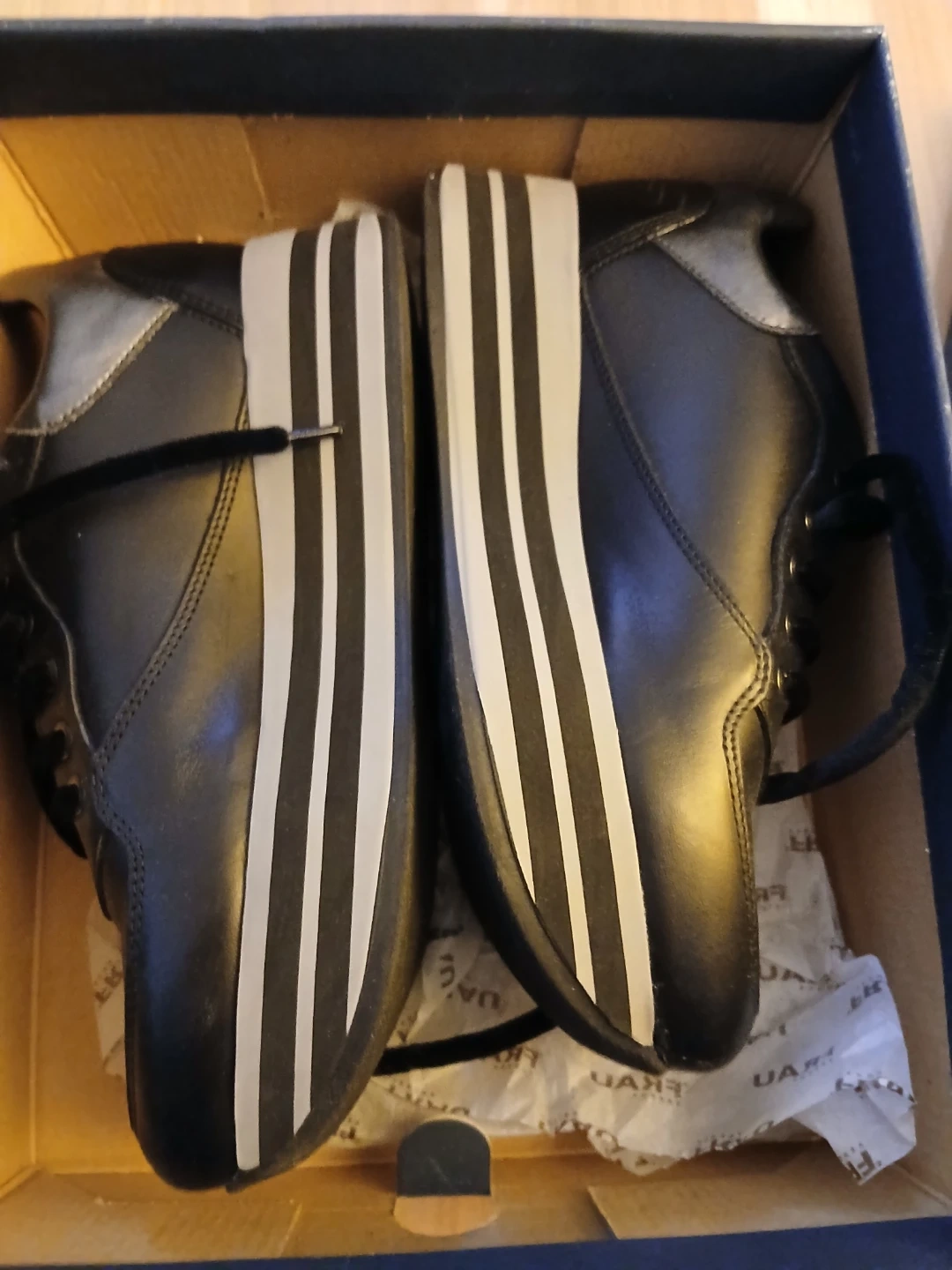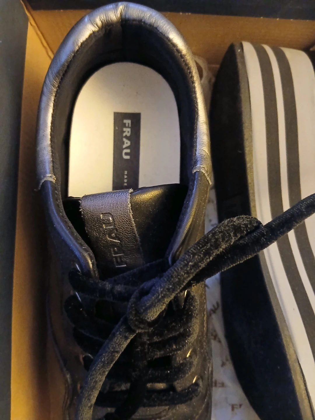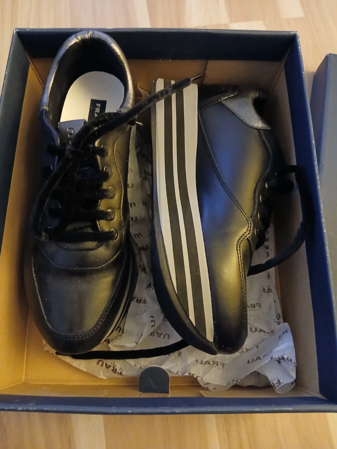 Selling a pair of FRAU black leather sneakers in box. They come with the original box. The sneakers have a unique design with white stripes on the platform sole. Size 37.