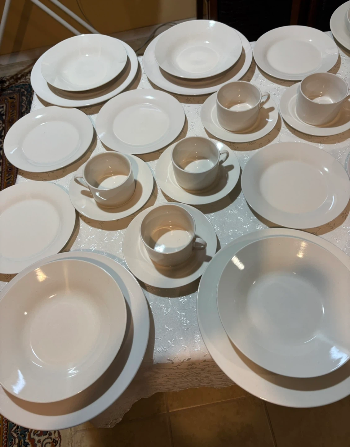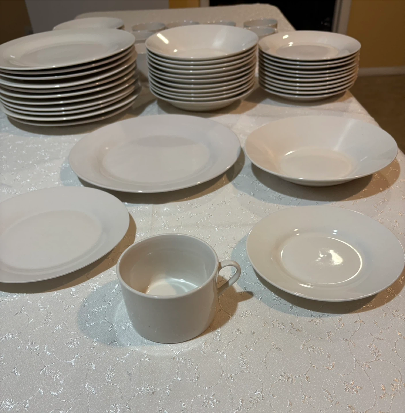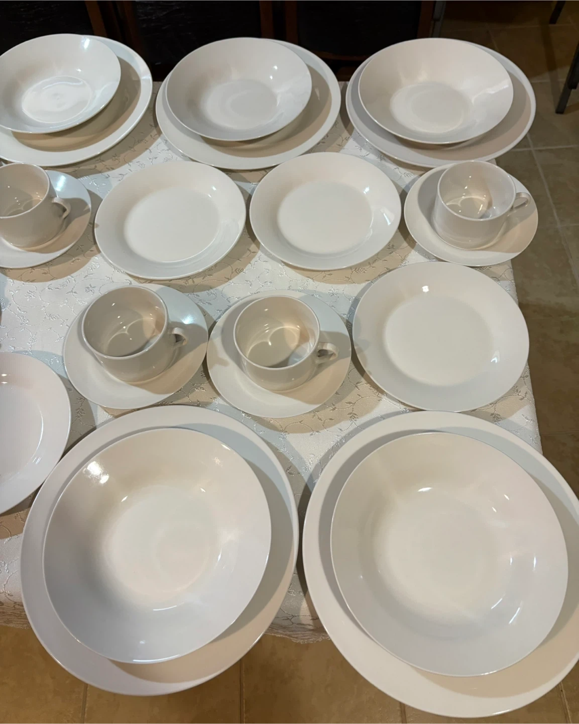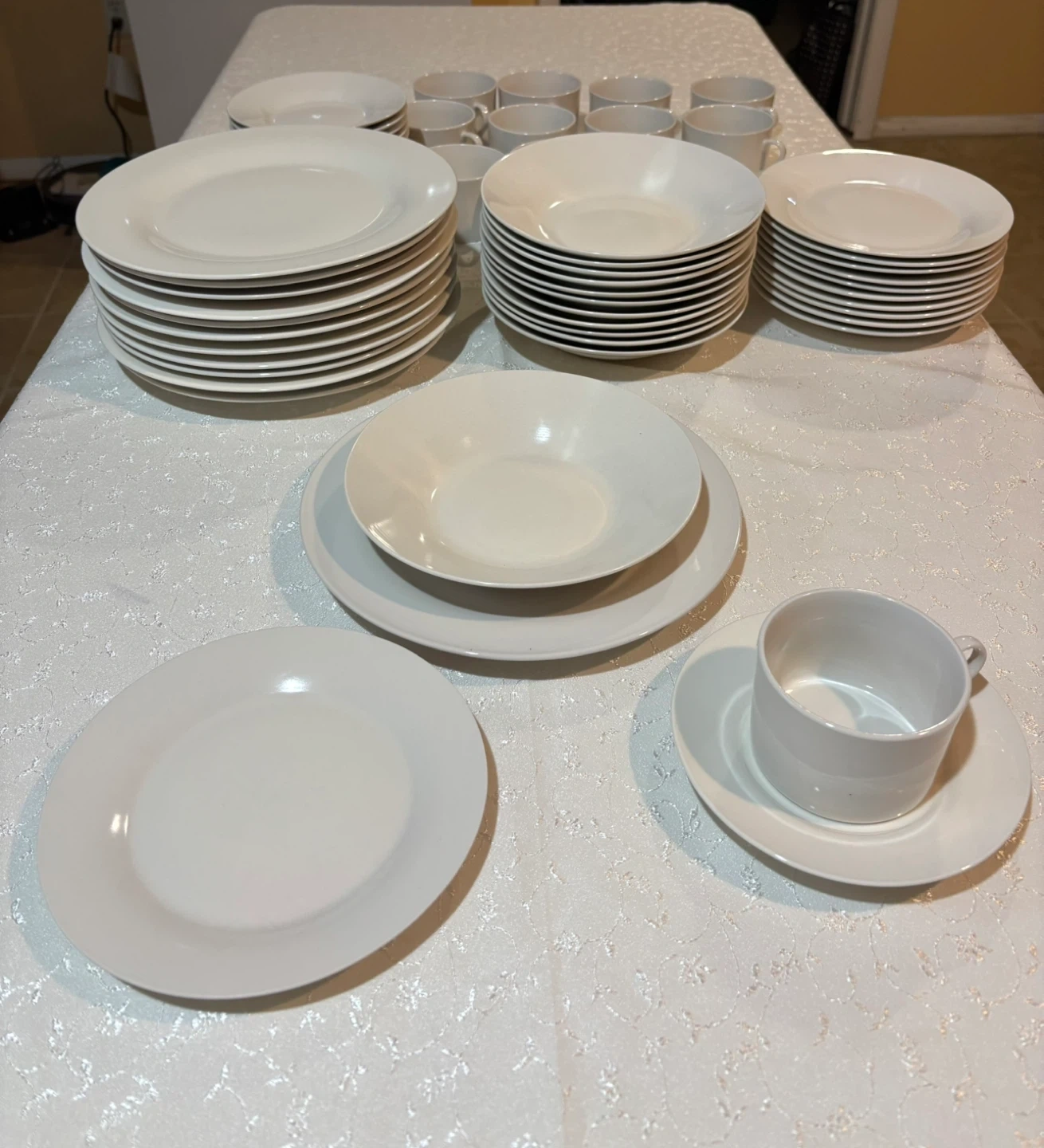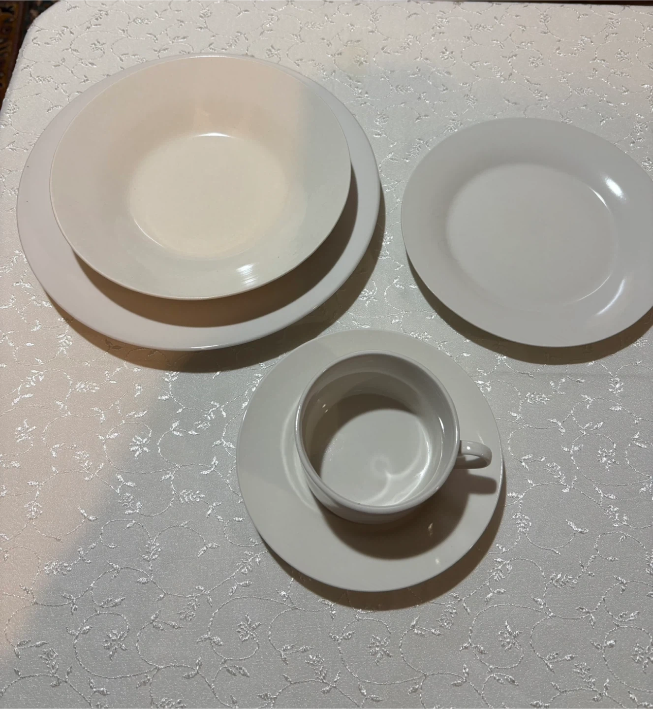 Selling a set of white dinnerware. Includes plates, bowls, and cups with saucers. Great for everyday use or special occasions.