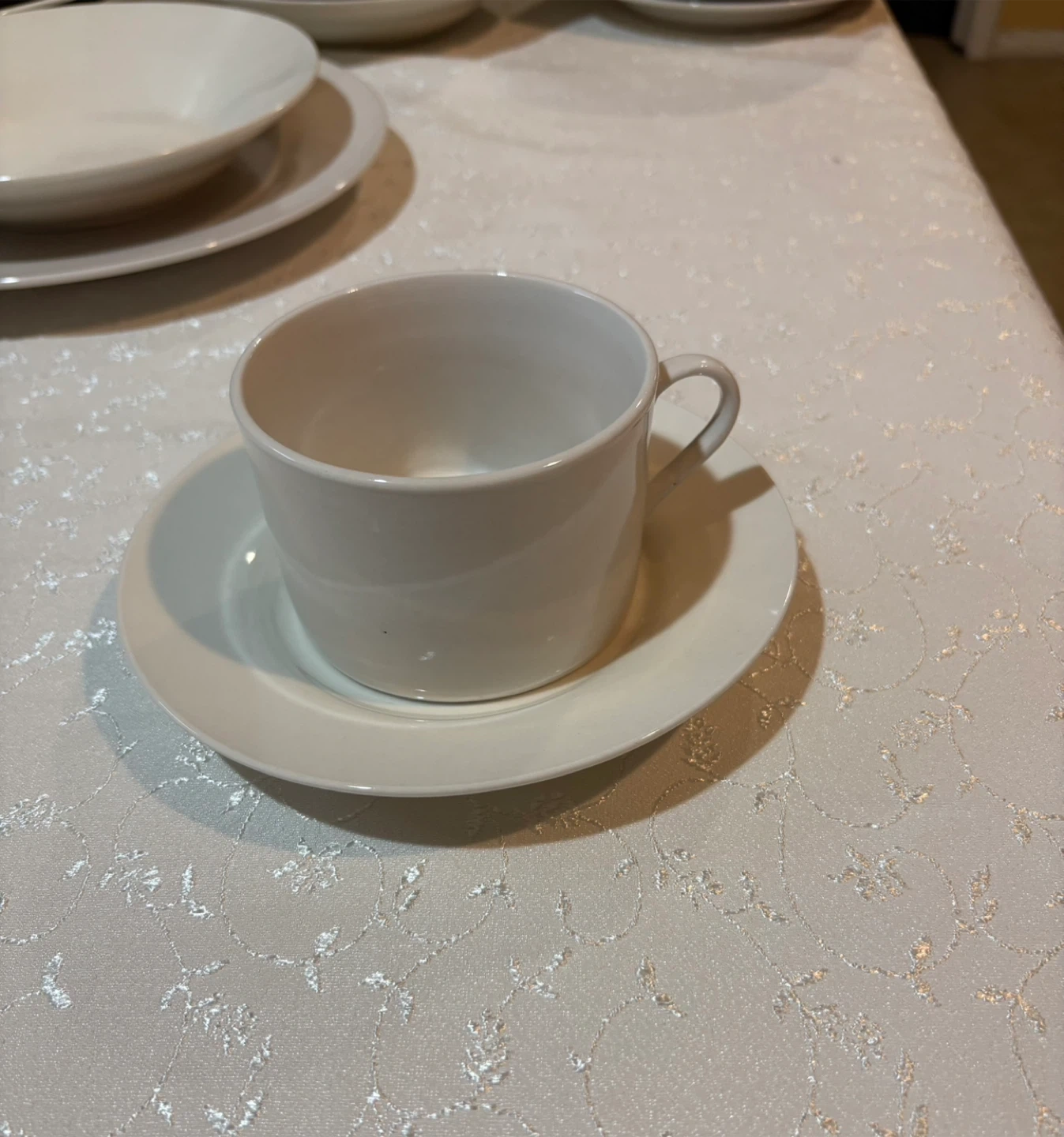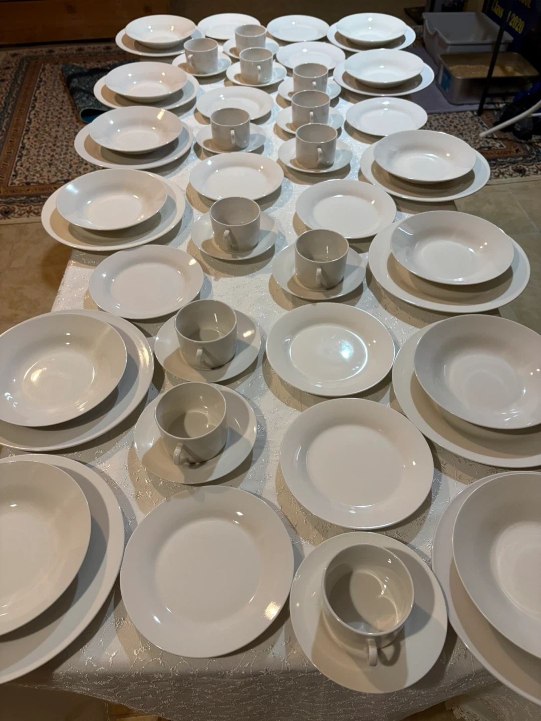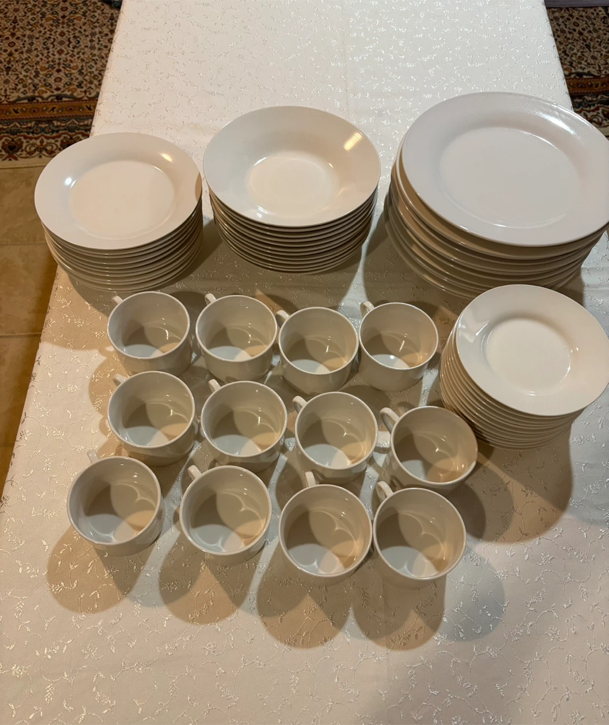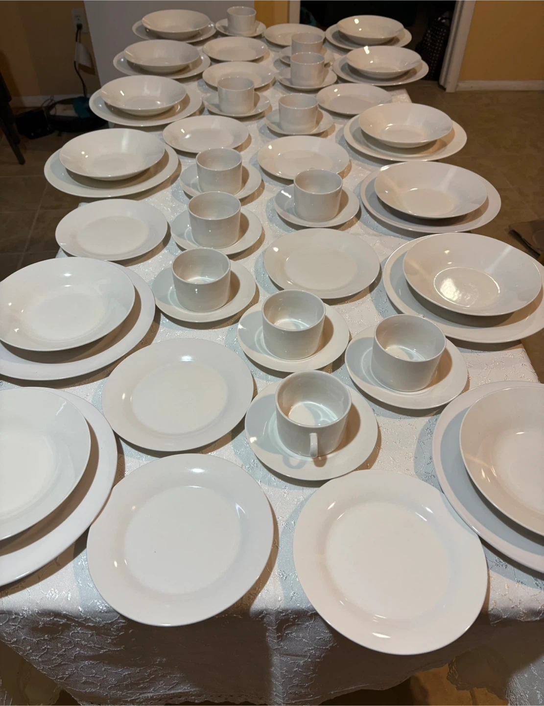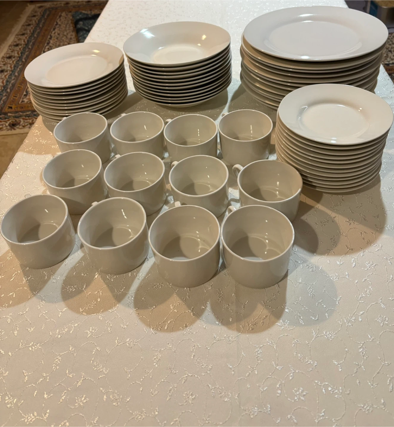 Selling a set of white dinnerware. Includes plates, bowls, and cups with saucers. Great for everyday use or special occasions.