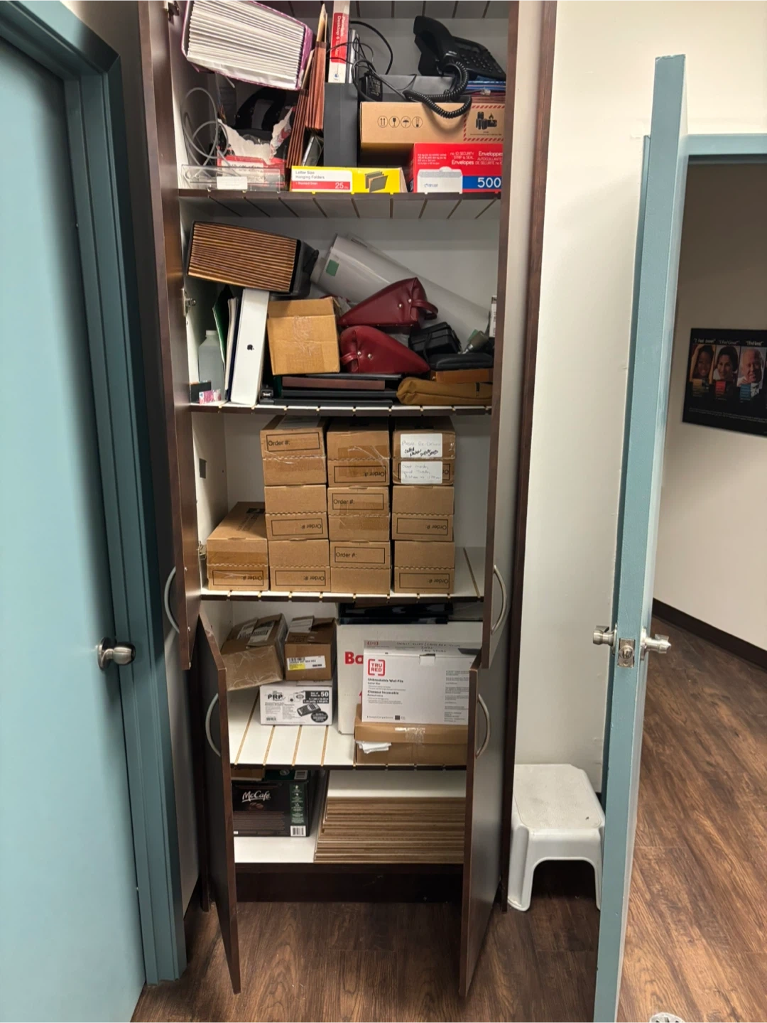 Selling a tall wooden storage cabinet. It's in good condition and perfect for adding extra storage space to any room. The cabinet is a dark brown colour and has four doors with silver handles. Great for organizing your belongings. Build by Canaan Cabinetry in Niagara Falls. Was used originally for old school X-ray film storage. Bolts against the wall for support and safety.