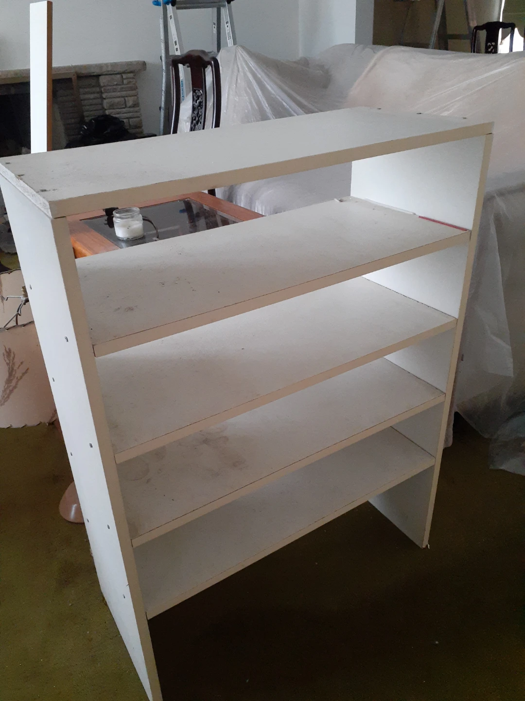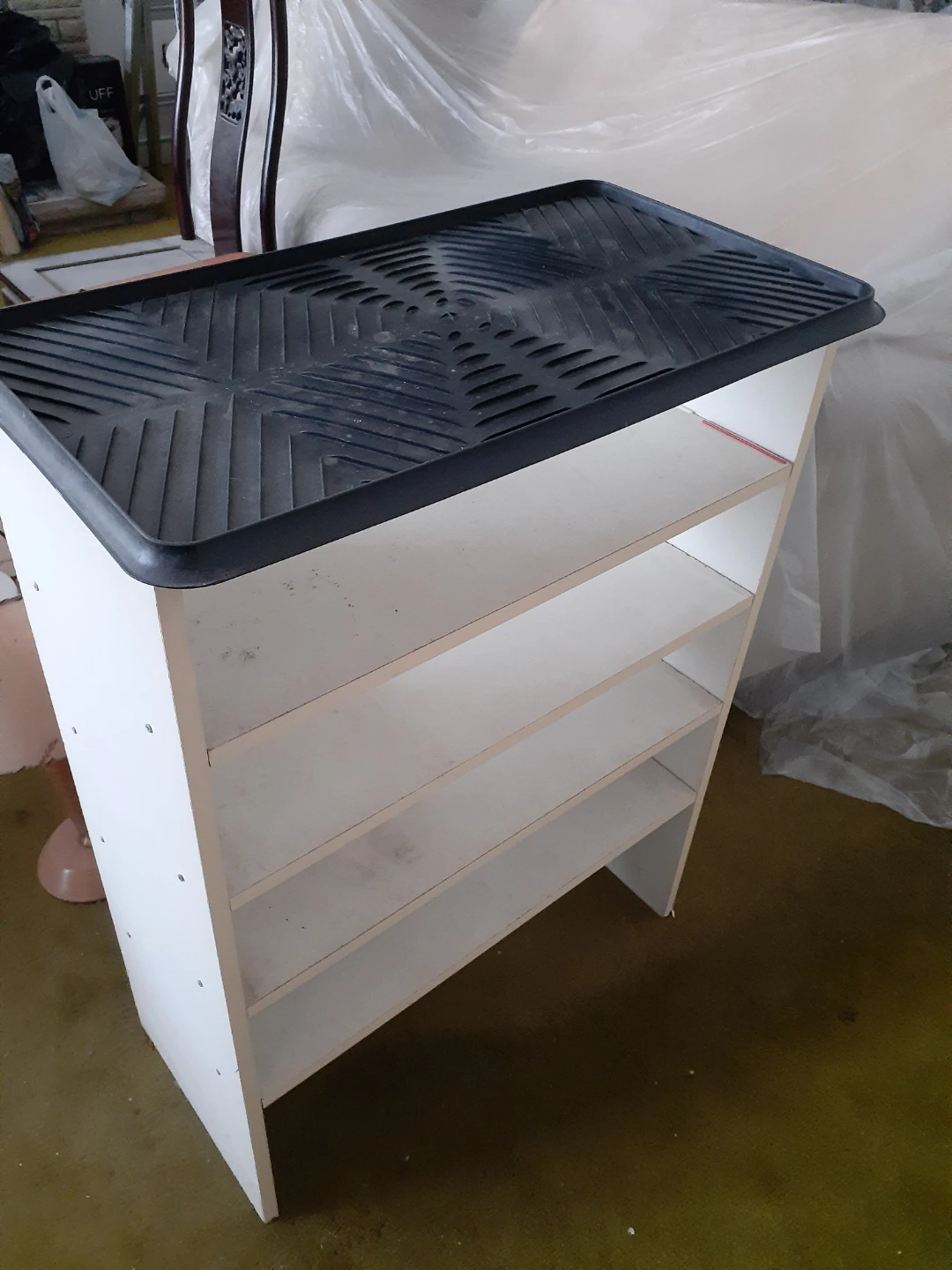 Selling a white wooden shelf unit. It has multiple shelves for storage. I used for shoe rack and place additional mat on top for more shoes.