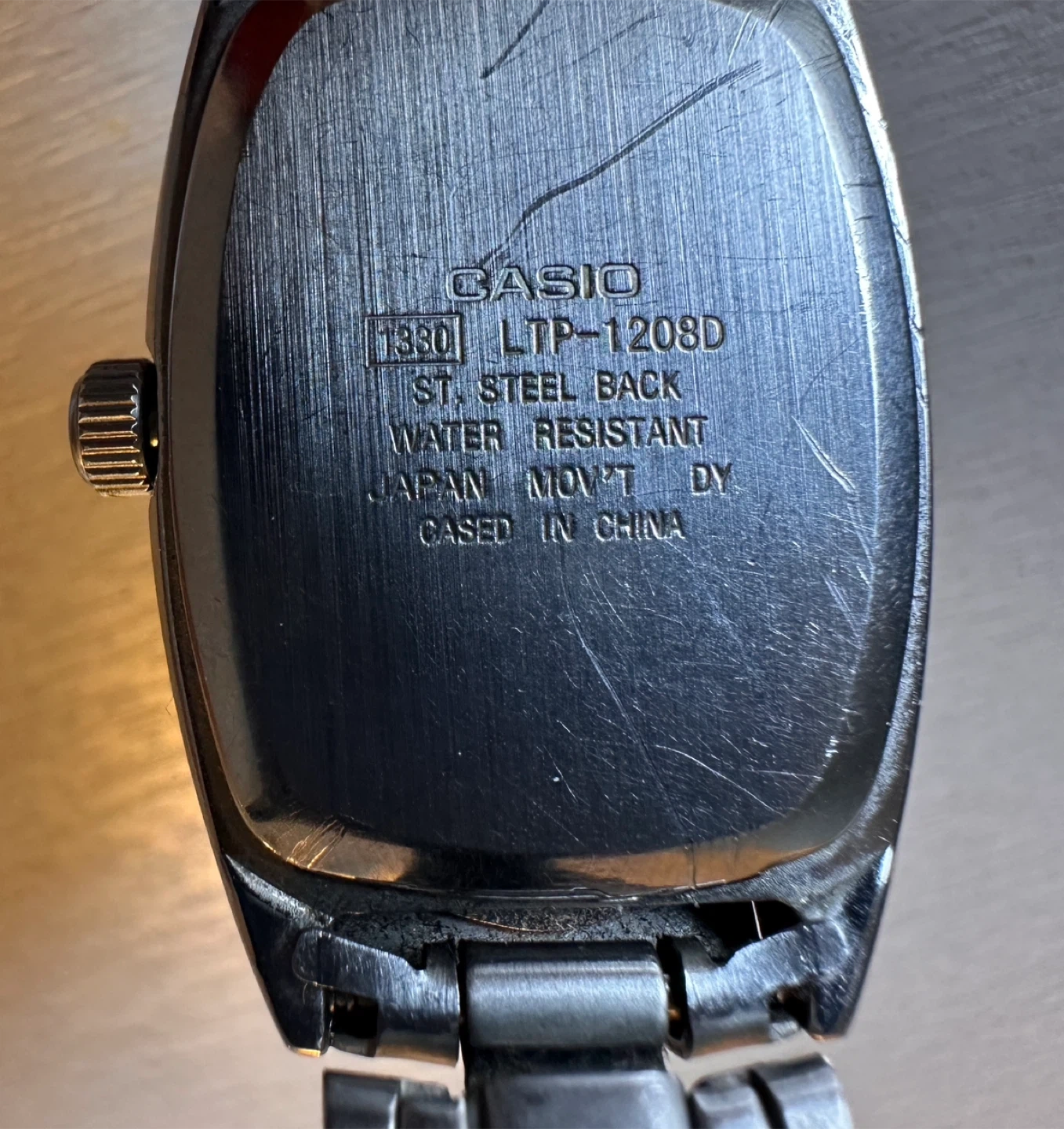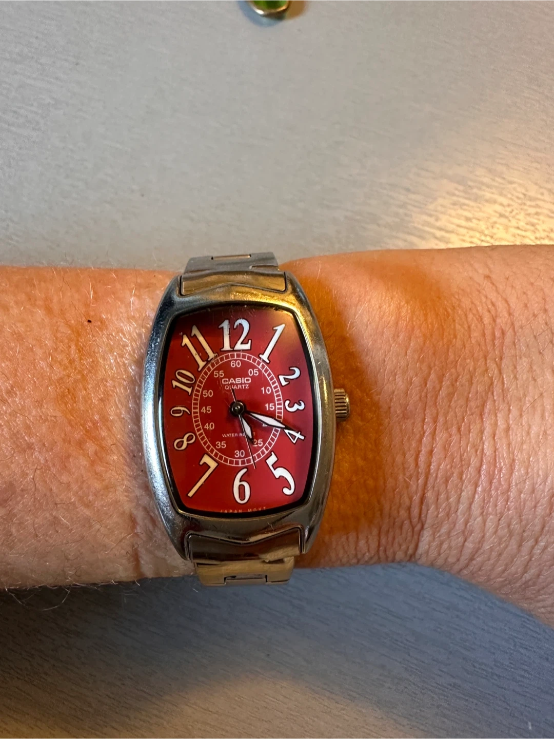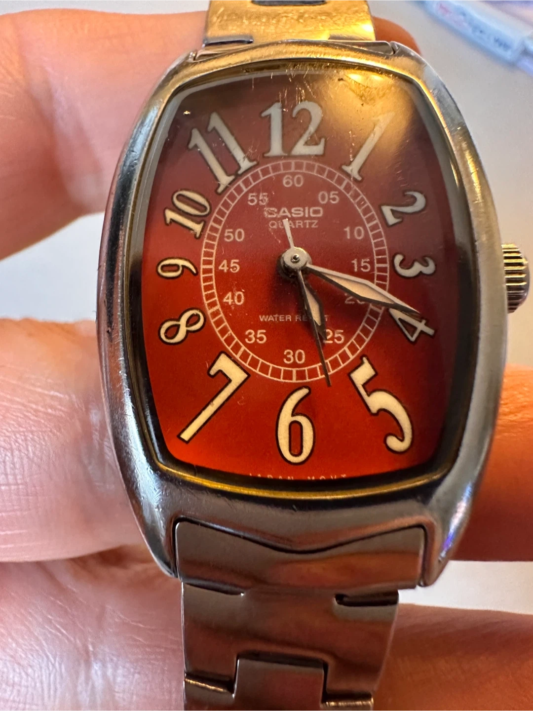 Selling a Casio ladies watch, model LTP-1208D. It features a stainless steel back and is water resistant. The watch has a red face with silver-tone detailing. Adjustable wrist band. Some small scratches but not very noticeable. It’s a vintage timeless classic that goes with any outfit