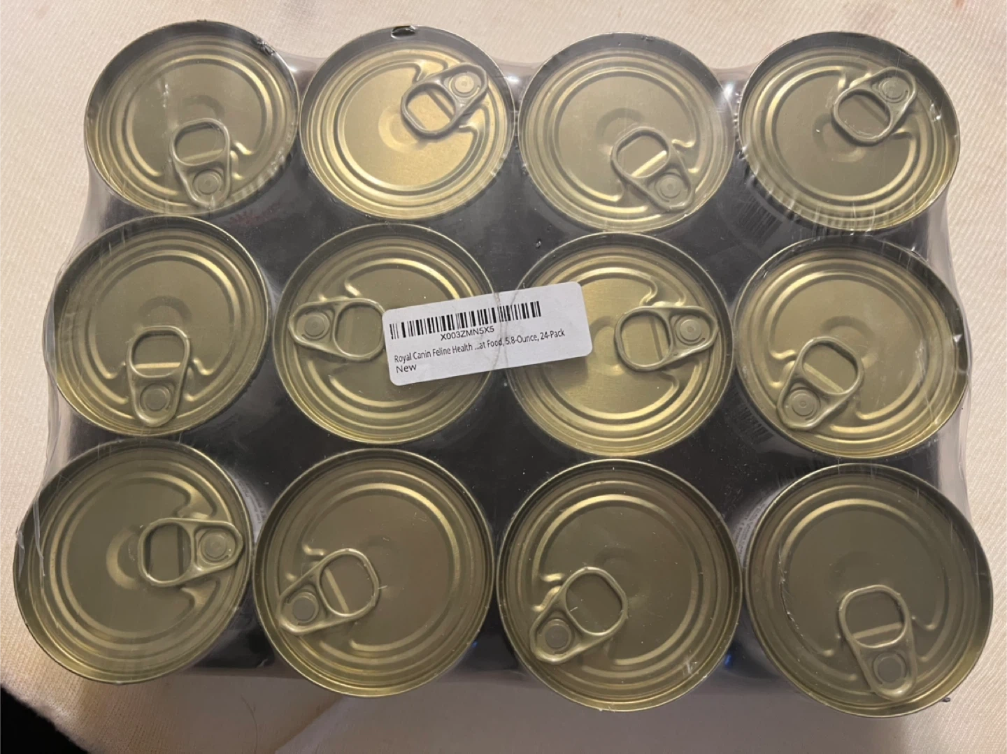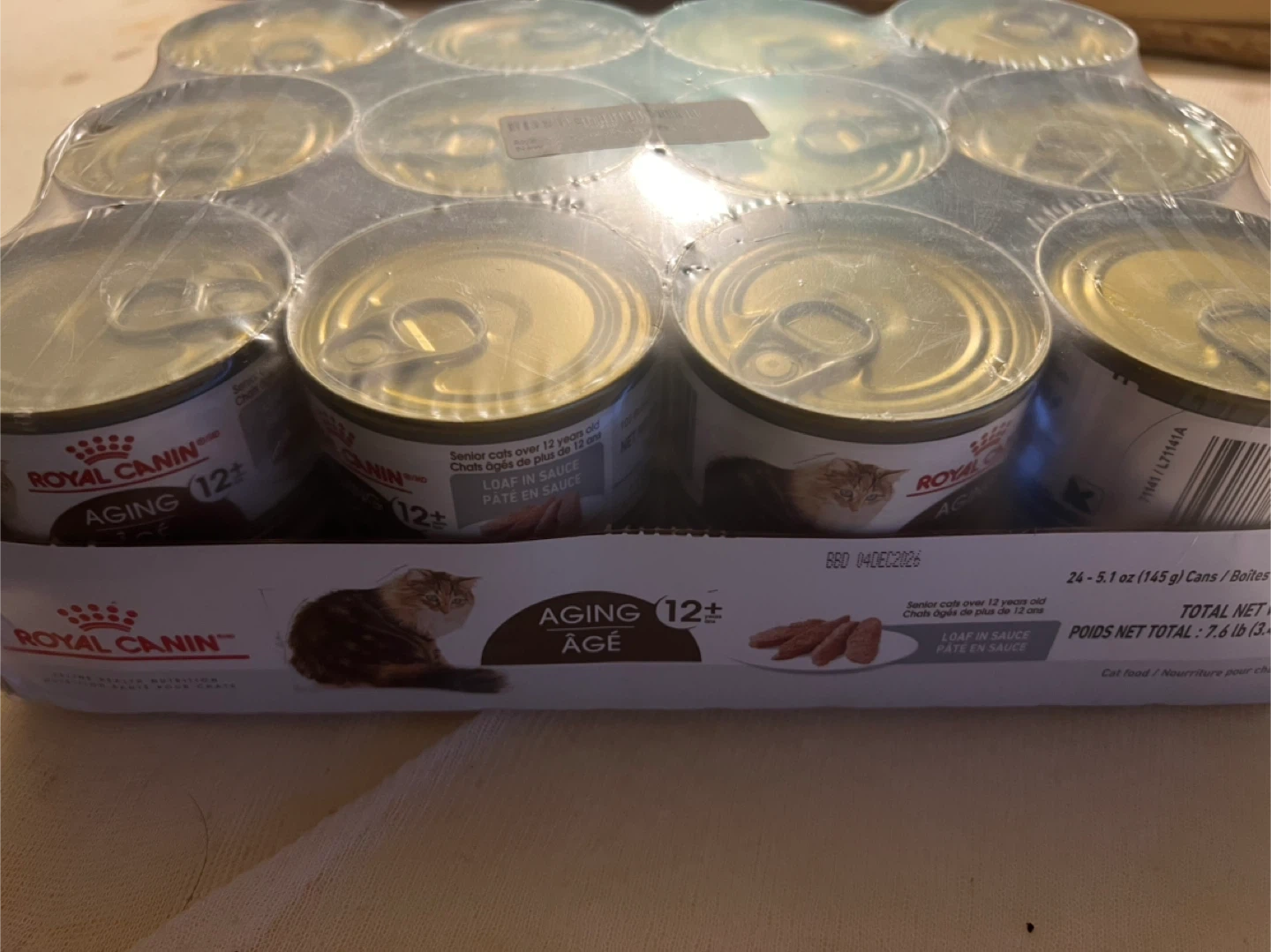 I'm selling a brand new pack of Royal Canin Senior wet cat food. It's a 24 pack of 5.1 oz cans, perfect for cats over 12 years old. The food is loaf in sauce and pate style. Expiry date is 2026 December 06