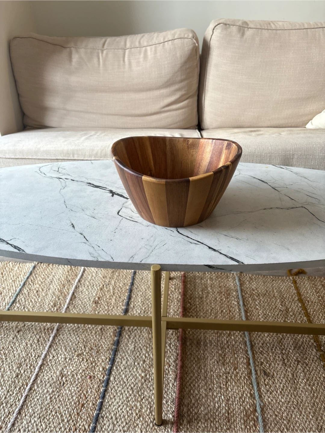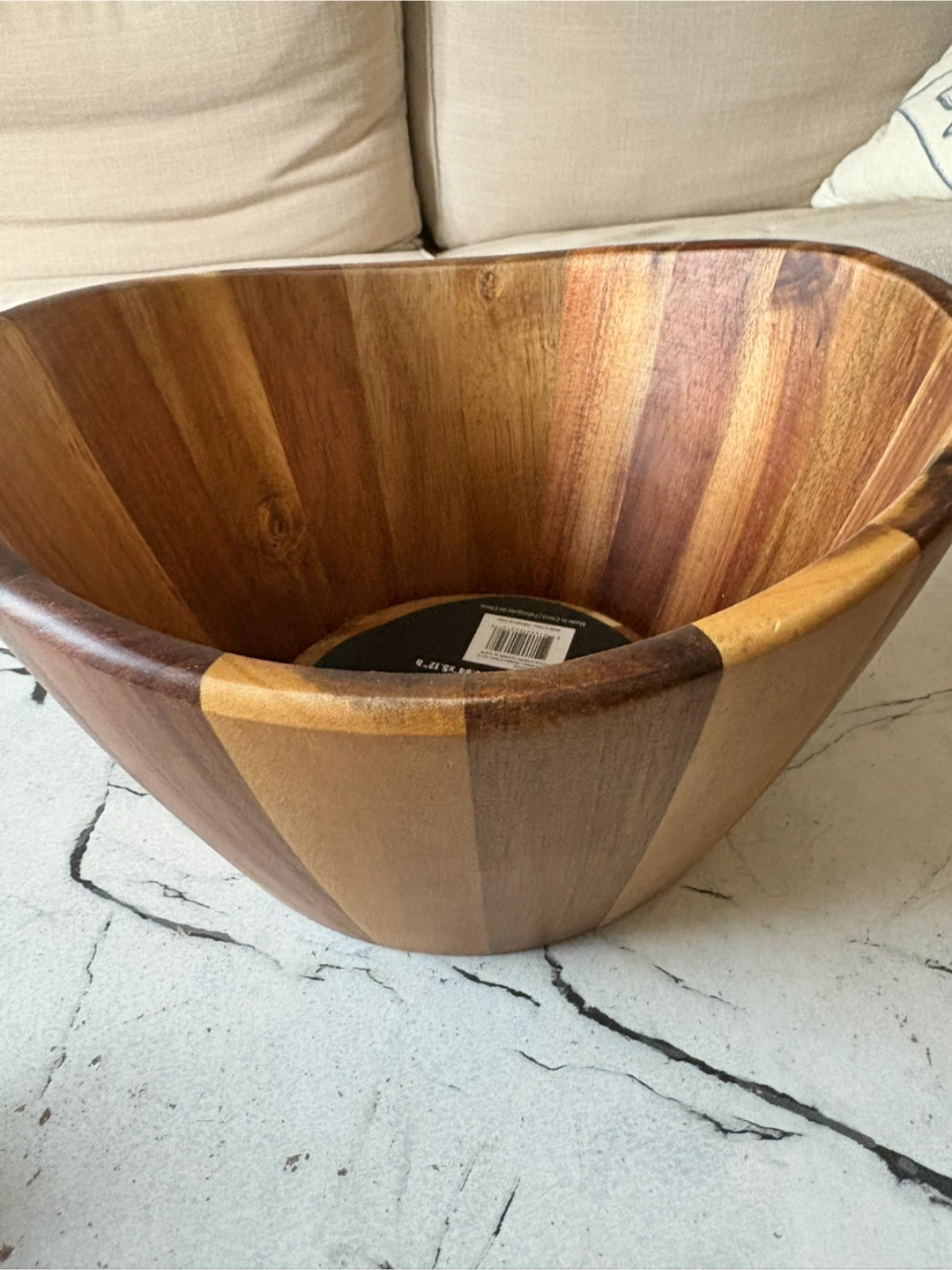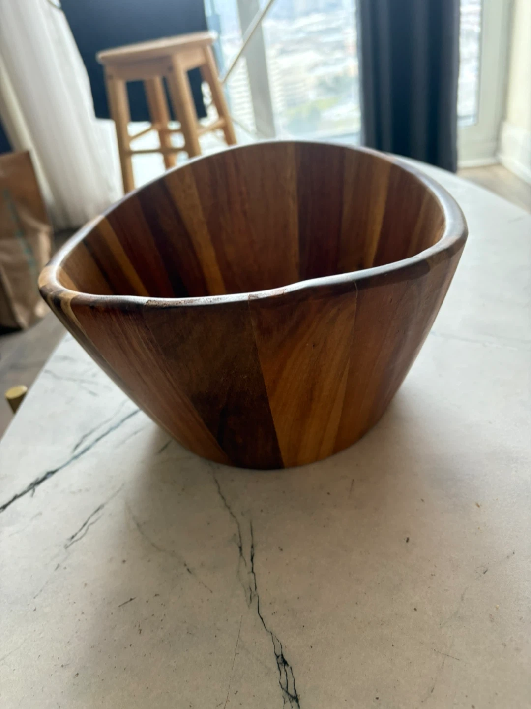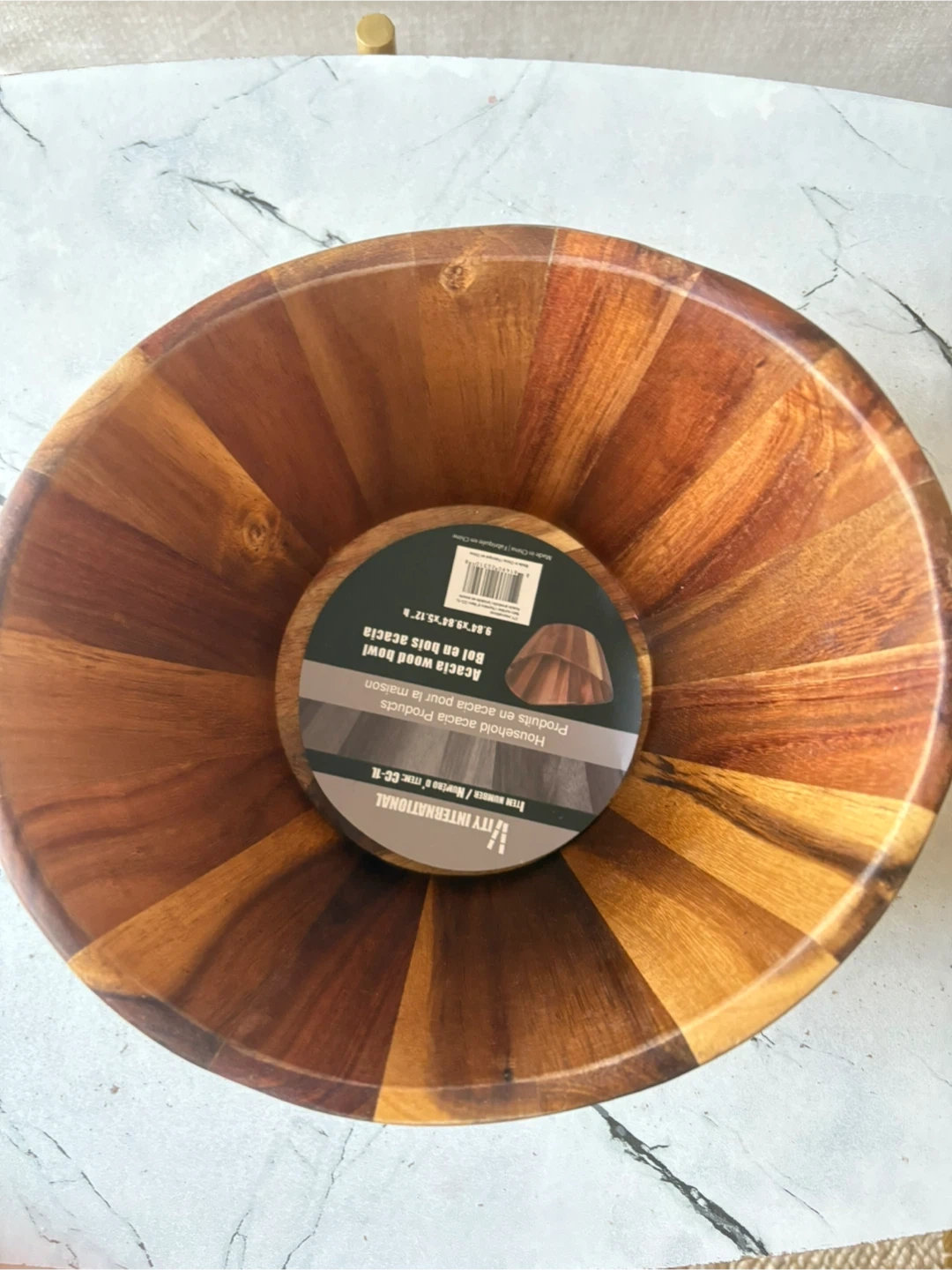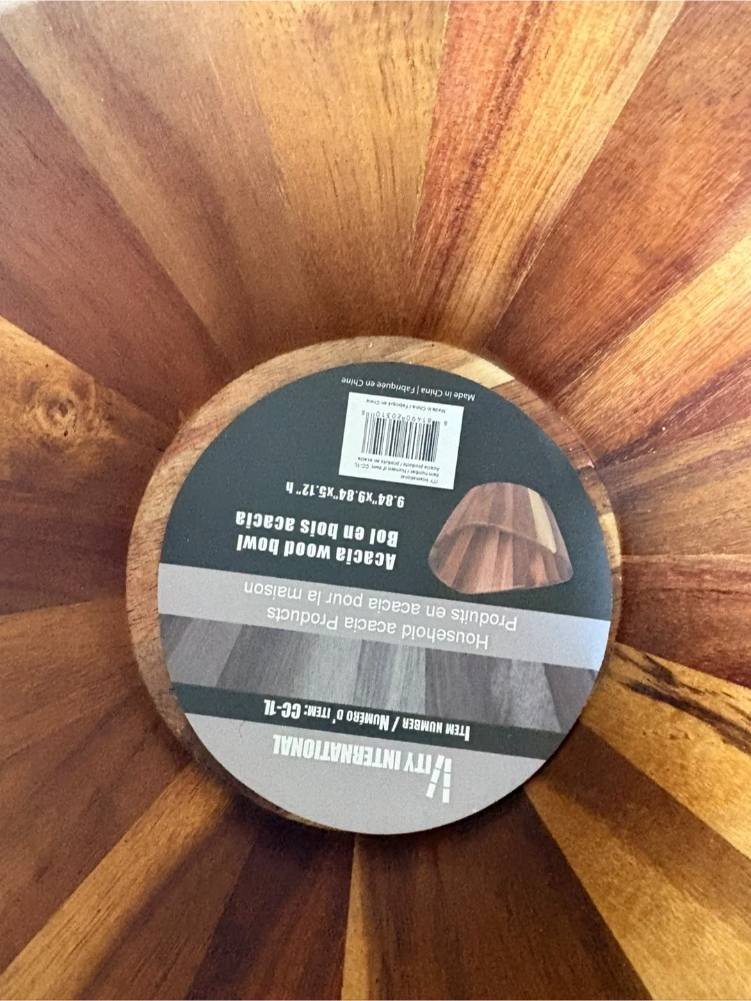 Here's a lovely acacia wood bowl from ITY International! It's perfect for salads or as a decorative piece. The bowl measures approximately 9.84" x 9.84" x 5.12". It's in great condition and ready for a new home!