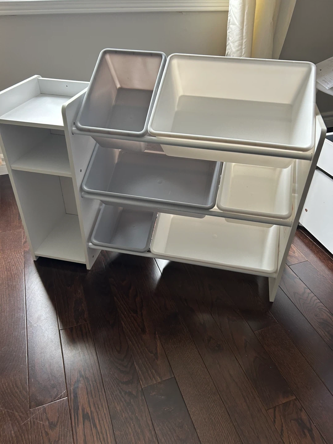 Selling a toy storage organizer in great condition! It features a combination of shelves and bins, perfect for keeping your little one's play area tidy and organized. The unit is white and includes both grey and white bins.