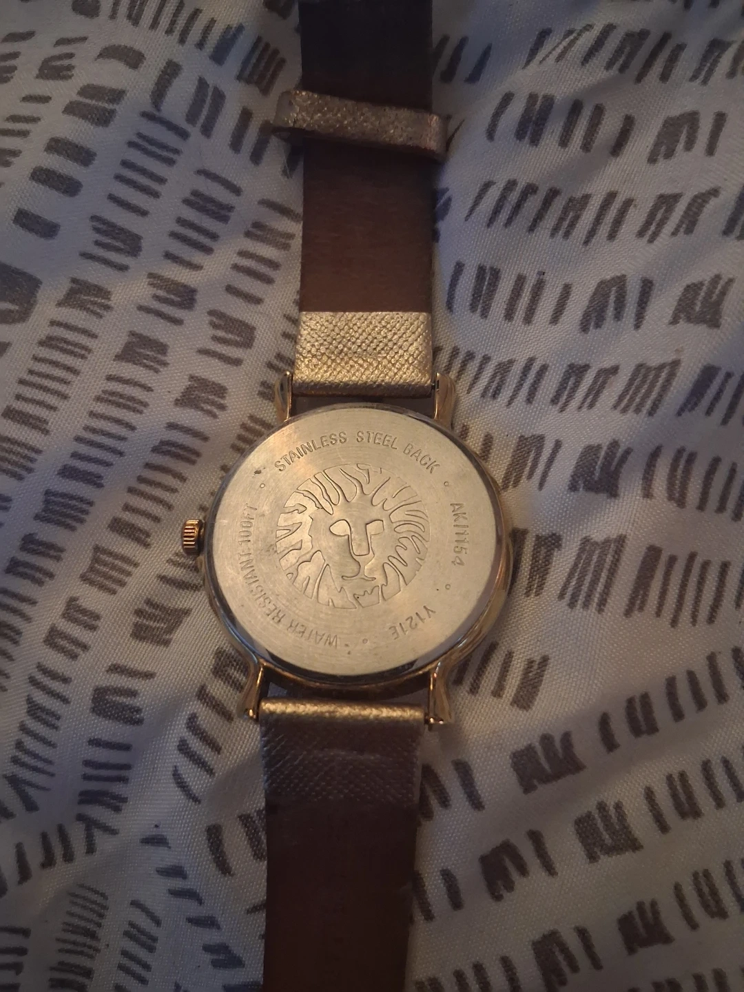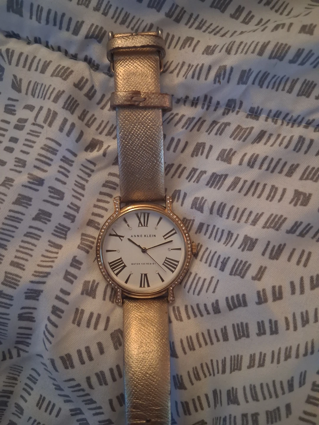 Selling a gold Anne Klein watch. It has a stainless steel back and is water resistant. The band and face are gold, and the face has Roman numerals.