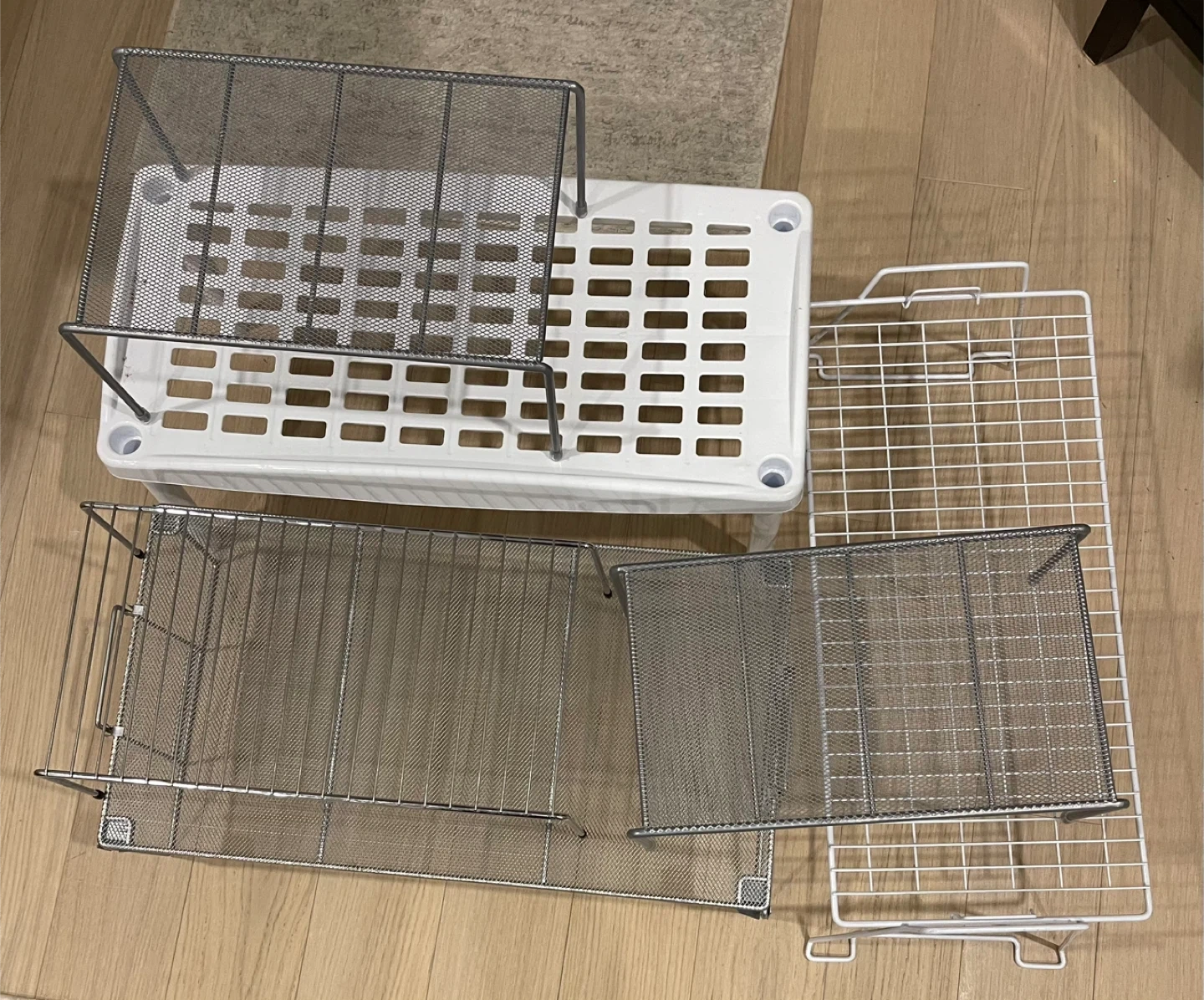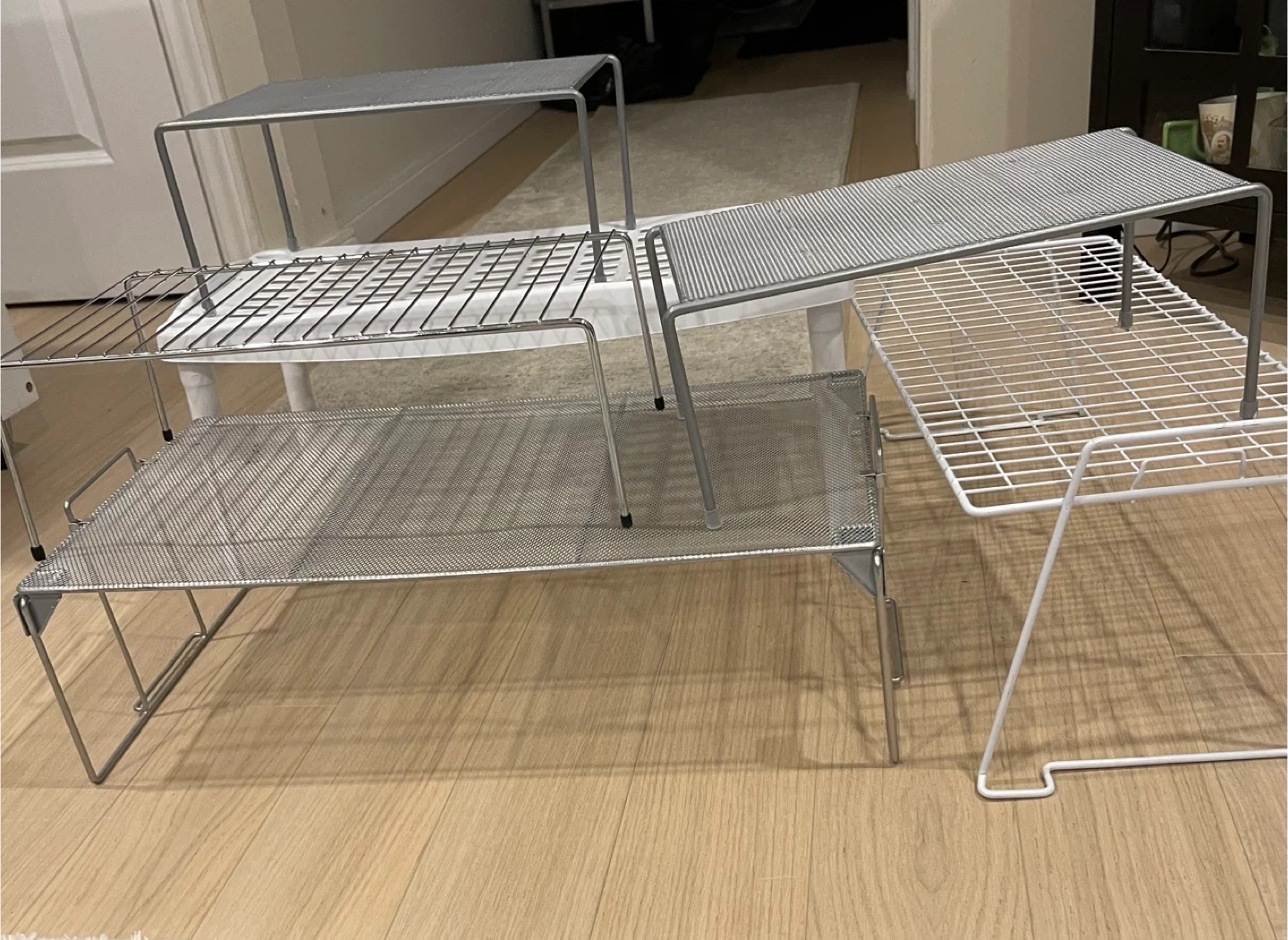 Six stand-alone shelves for additional storage/organization in cupboards. 5 are metal and one is plastic. Sizes are approximately 28” x 9” (2 shelves); 28” x 12” (1 shelf); 24” x 9 ” (1 shelf); 18” x 9” (2 shelves).