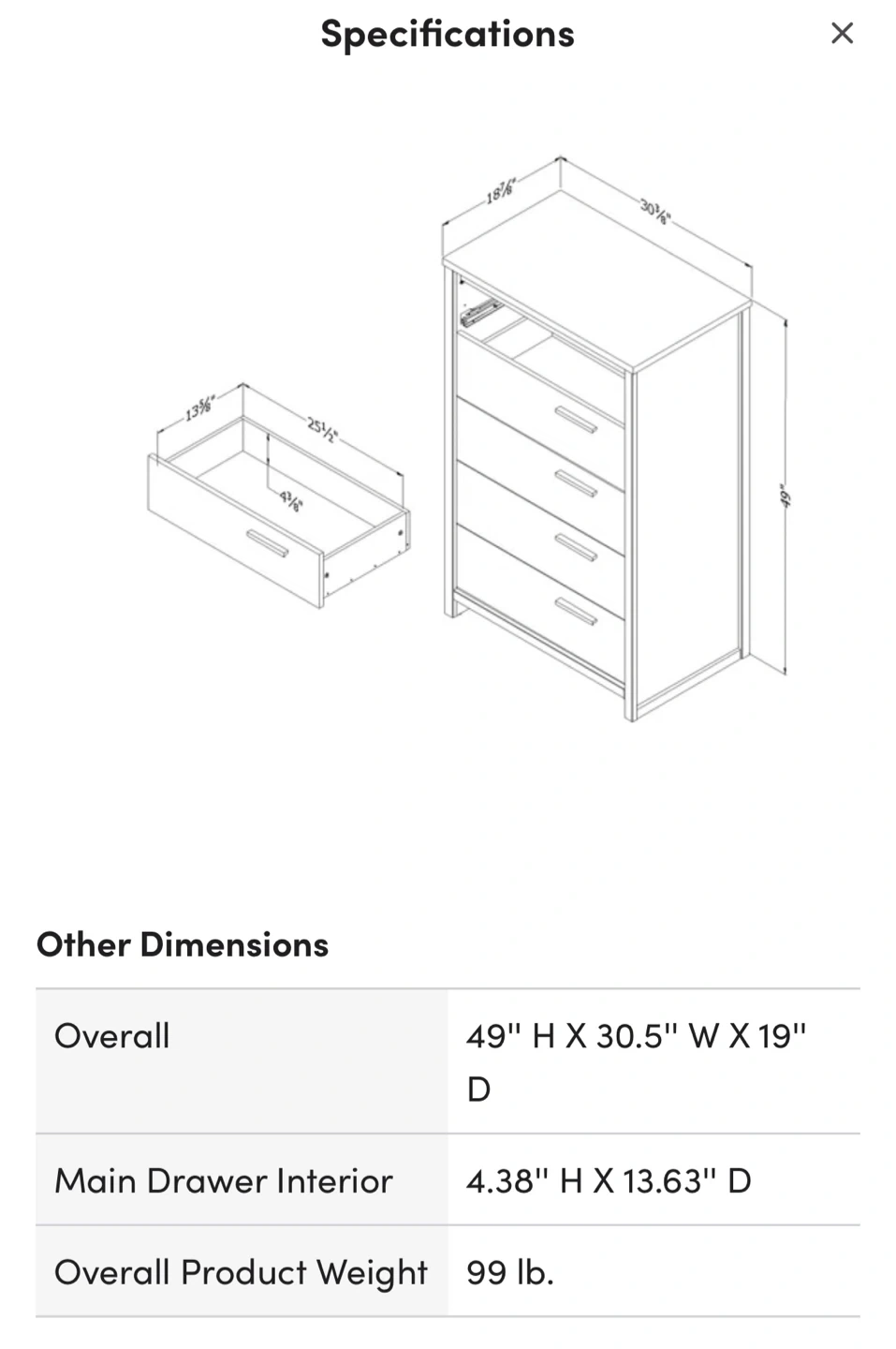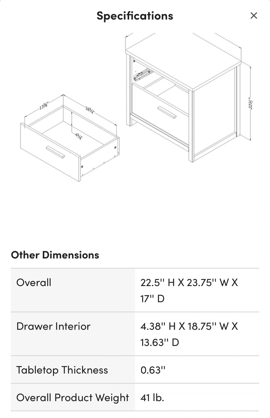 - Drawer Interior: 4.38" H x 18.75" W x 13.63" D