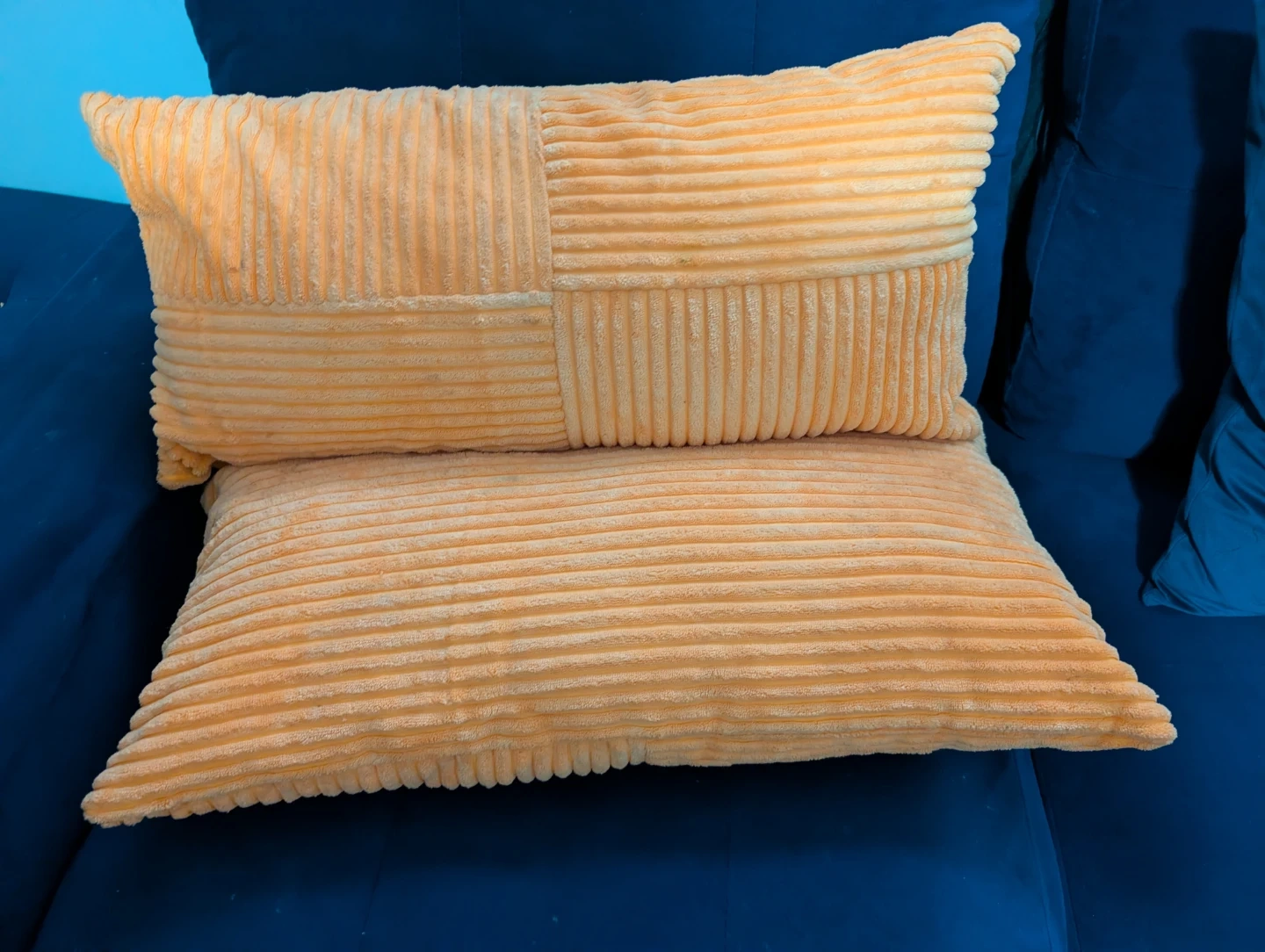 Add a pop of colour and texture to your space with these corduroy throw pillows! There are two square pillows in green and orange, and two rectangular pillows in orange. They're in great condition and ready to brighten up your living room or bedroom. Total 8 cushions.
