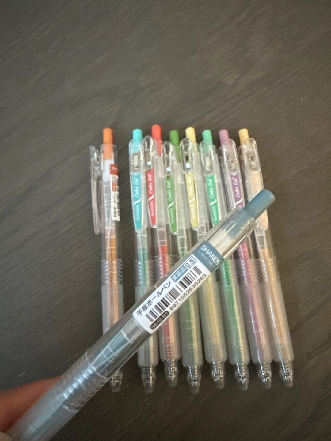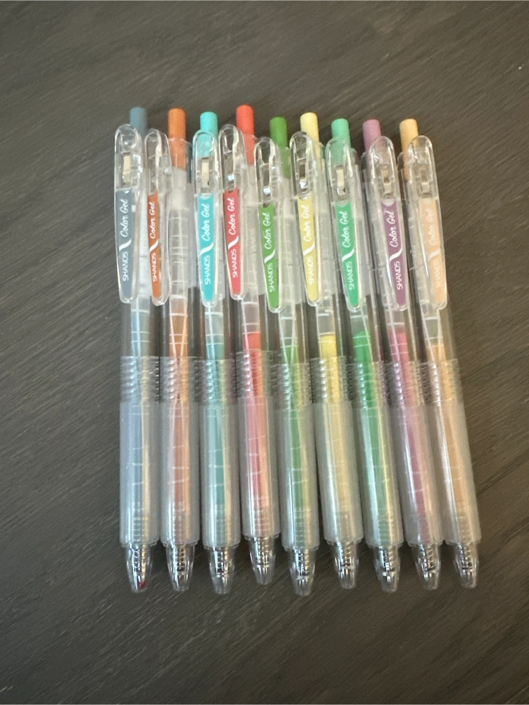 Selling a set of 10 Shanos Color Gel pens! These pens have a smooth gel ink that makes writing and drawing a breeze. They are perfect for adding a pop of color to your notes, artwork, or journaling
