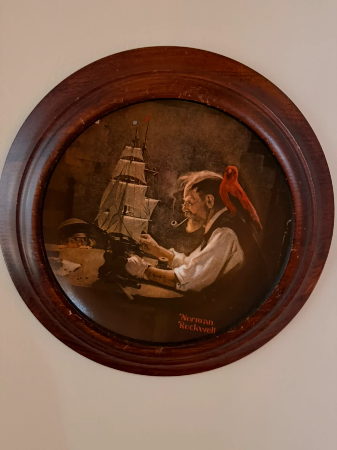 Framed print featuring a painting by Norman Rockwell. It depicts an older man with a ship and a red bird. The frame is wooden and round.