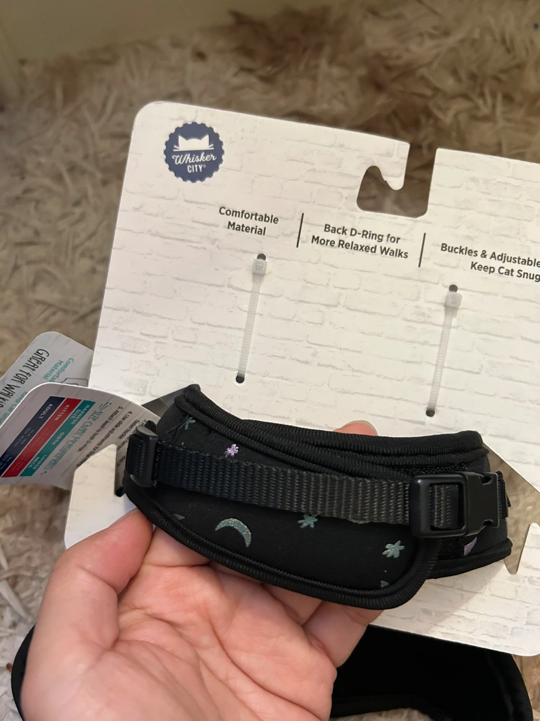 This is a brand new Whiskers City cat harness and leash! It features a comfortable material and a back D-ring for more relaxed walks. The buckles and adjustable straps help keep your cat snug. The neck size is 9-11 inches (22.9-27.9 cm), the girth is 14-18 inches (35.6-45.7 cm), and the leash is 6 feet (182.9 cm)