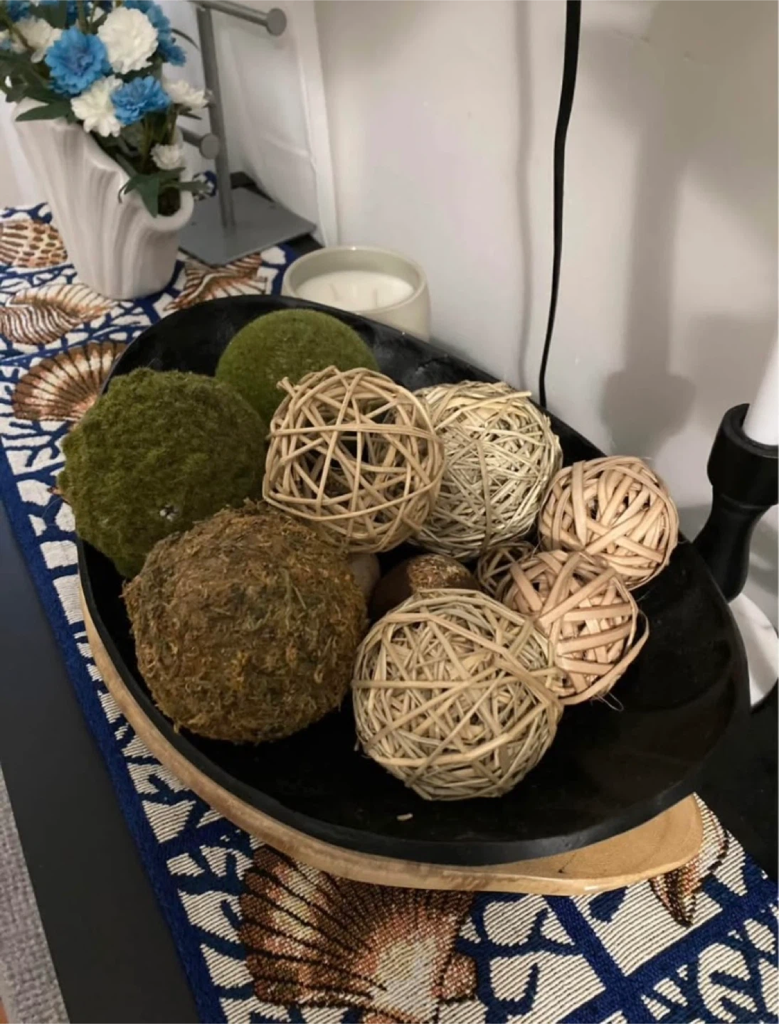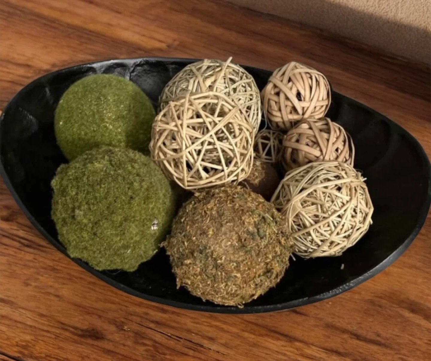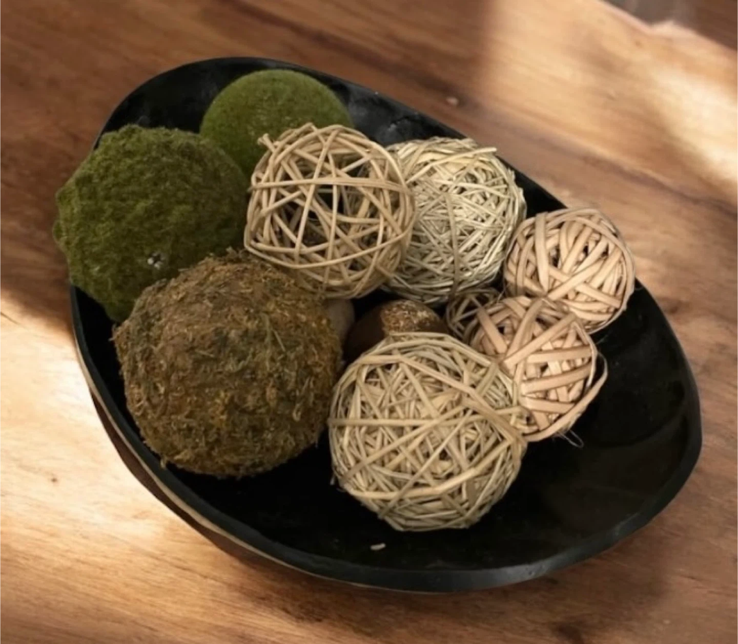 Selling a set of decorative orbs! These are perfect for adding a touch of natural texture to your home decor. They come in a variety of materials and colors, including mossy green and woven natural fibers. They are in great condition and would look lovely in a bowl or tray on a coffee table or shelf