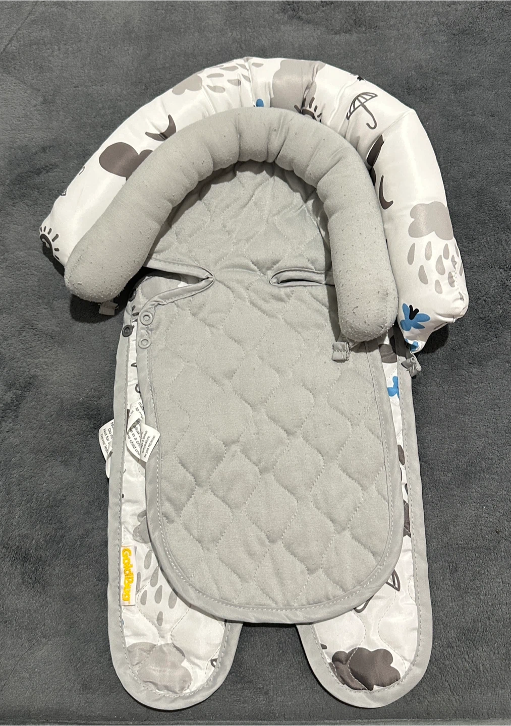 I'm selling a Goldbug infant car seat head support. It's in good condition and ready for a new little one! It features a soft grey quilted fabric with a cloud and umbrella pattern. Paid $20. Want $10.