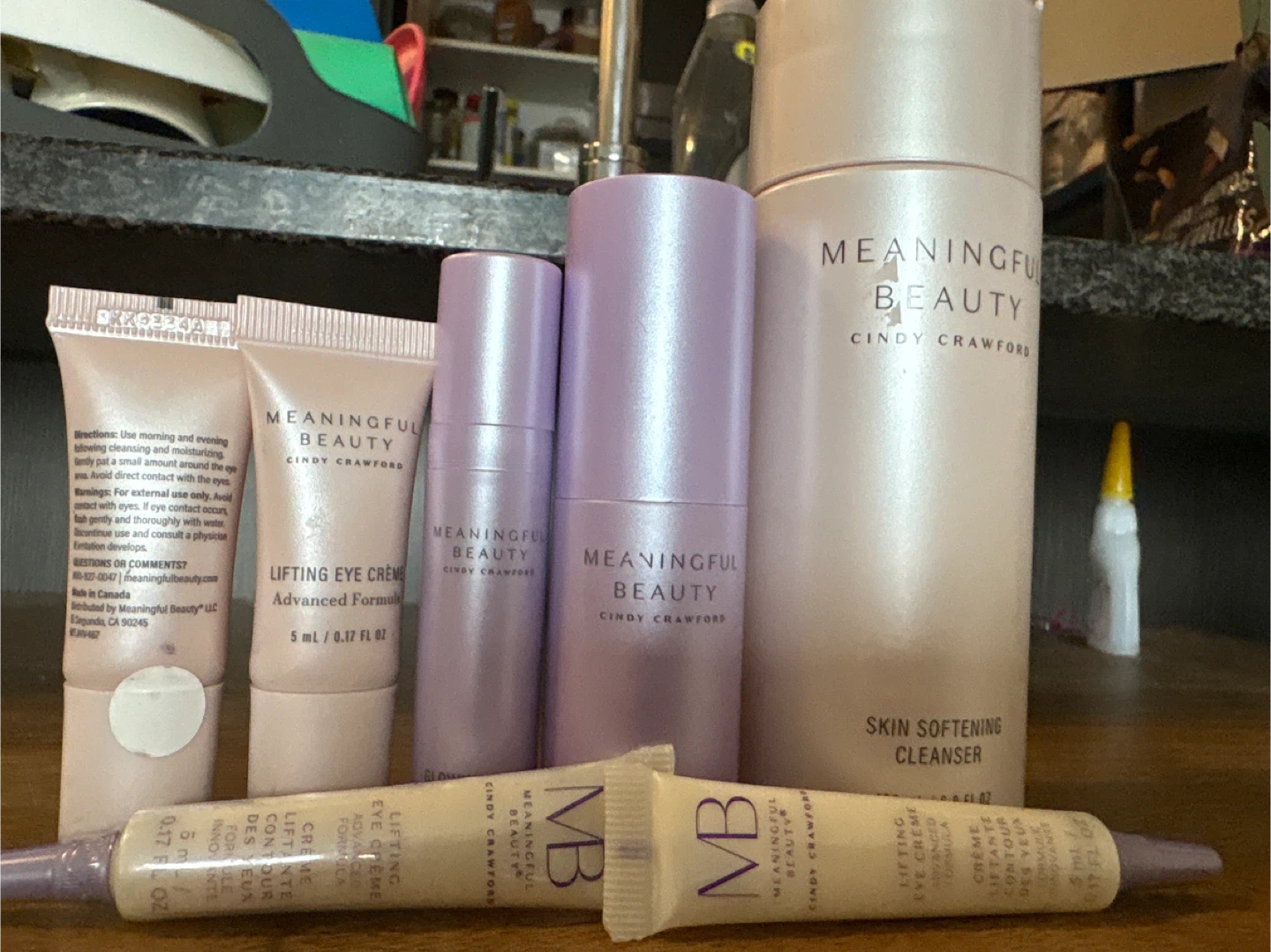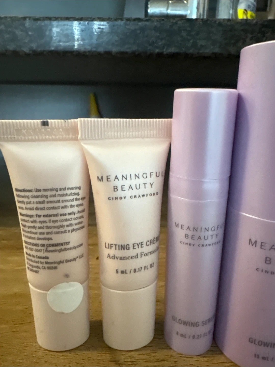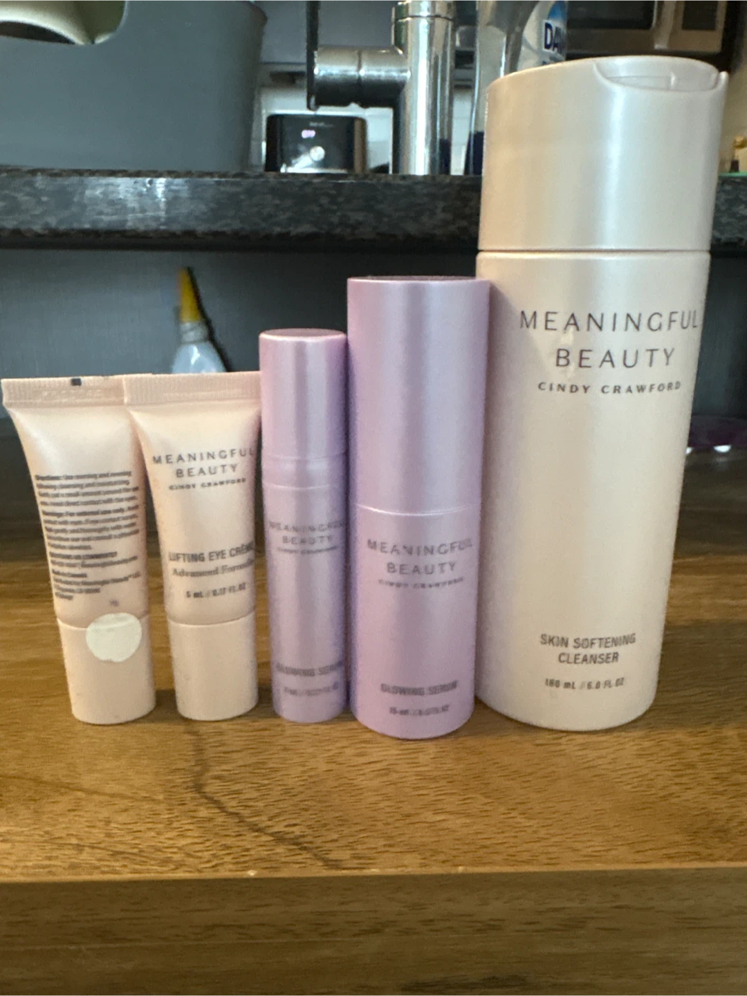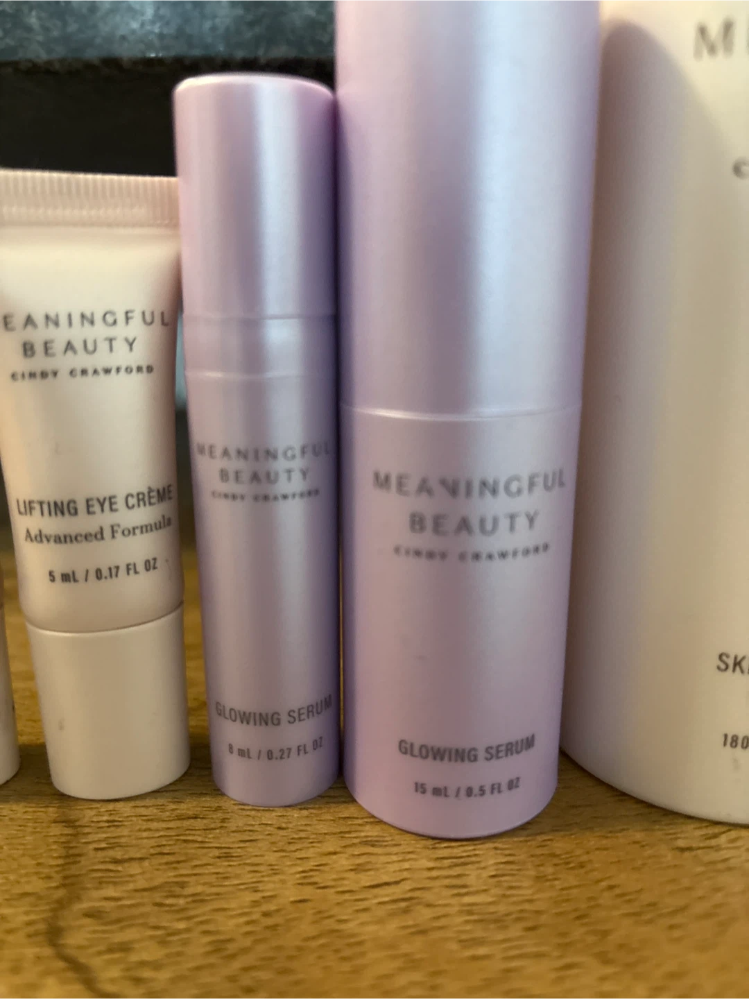 Selling brand new set of Meaningful Beauty products by Cindy Crawford! This includes the Skin Softening Cleanser (180 ml / 6.0 FL OZ), Lifting Eye Creme (5 ml / 0.17 FL OZ), and Glowing Serums (8 ml / 0.27 FL OZ and 15 ml / 0.5 FL OZ).