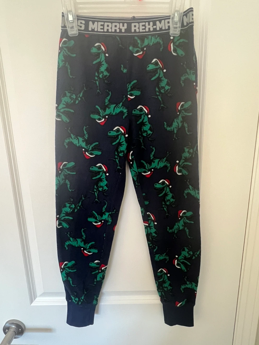 These are some fun pajama pants with a festive dinosaur print! The waistband says 'Merry Rex-Mas'. They're perfect for the holidays and keeping coz