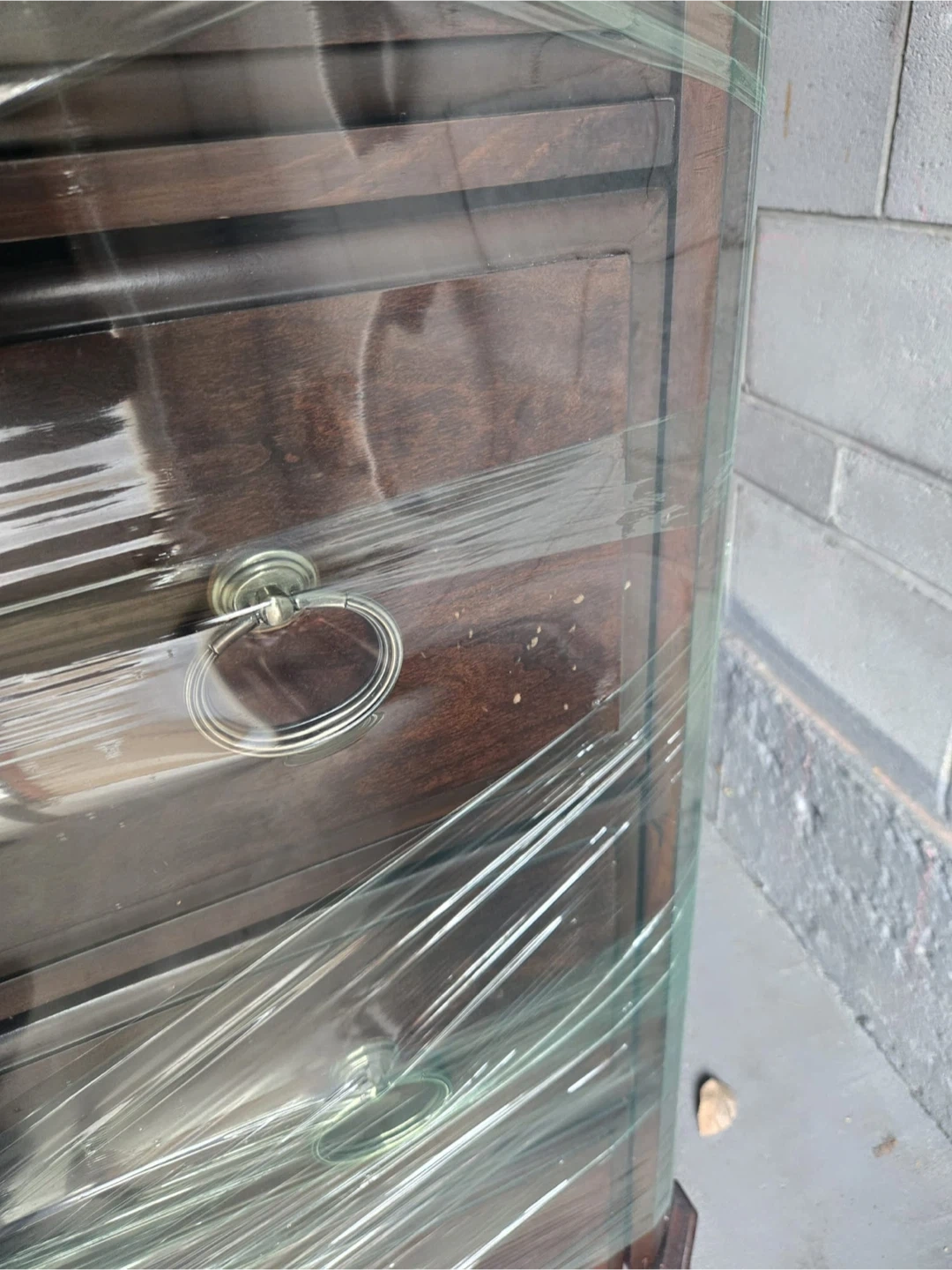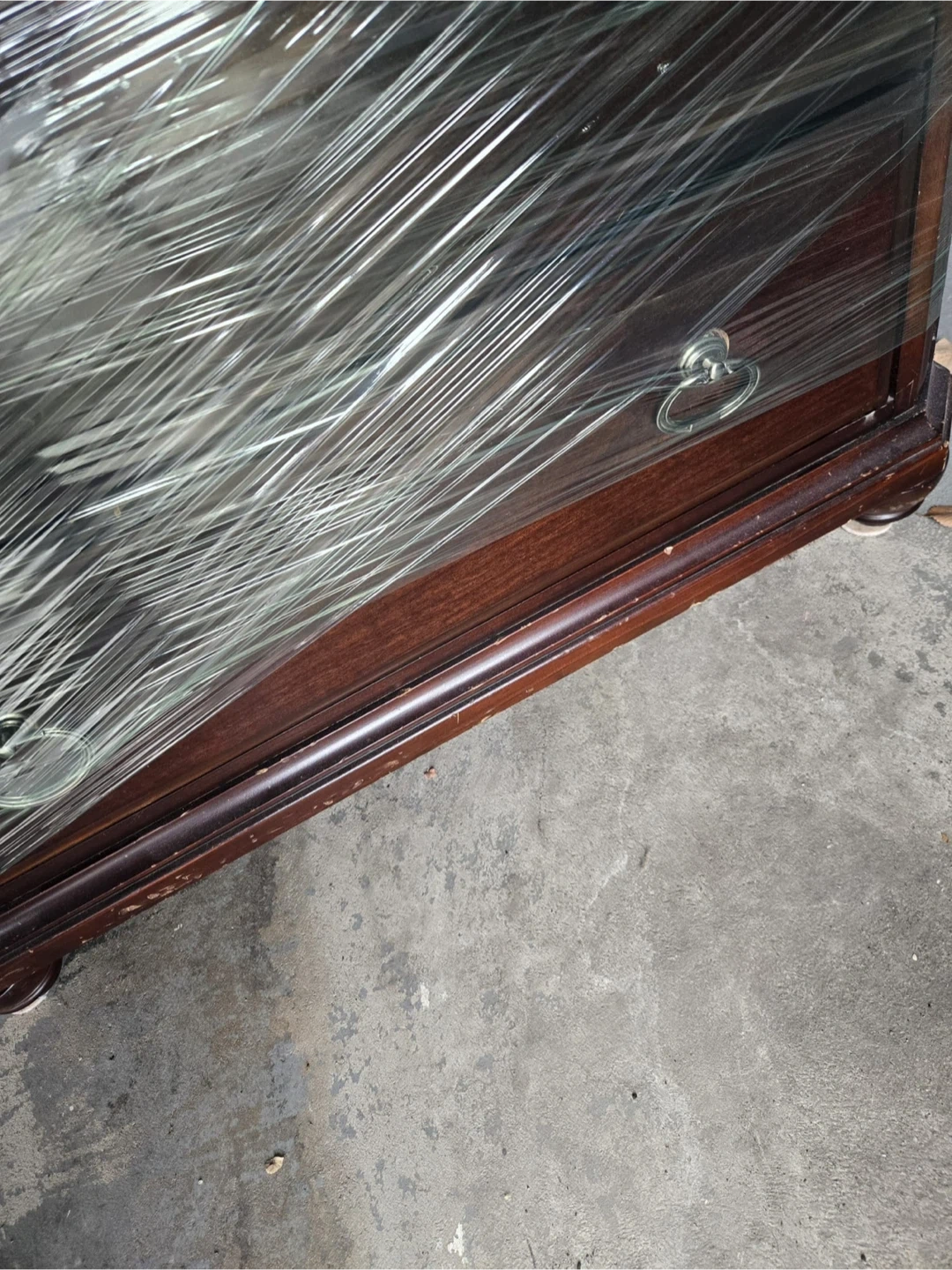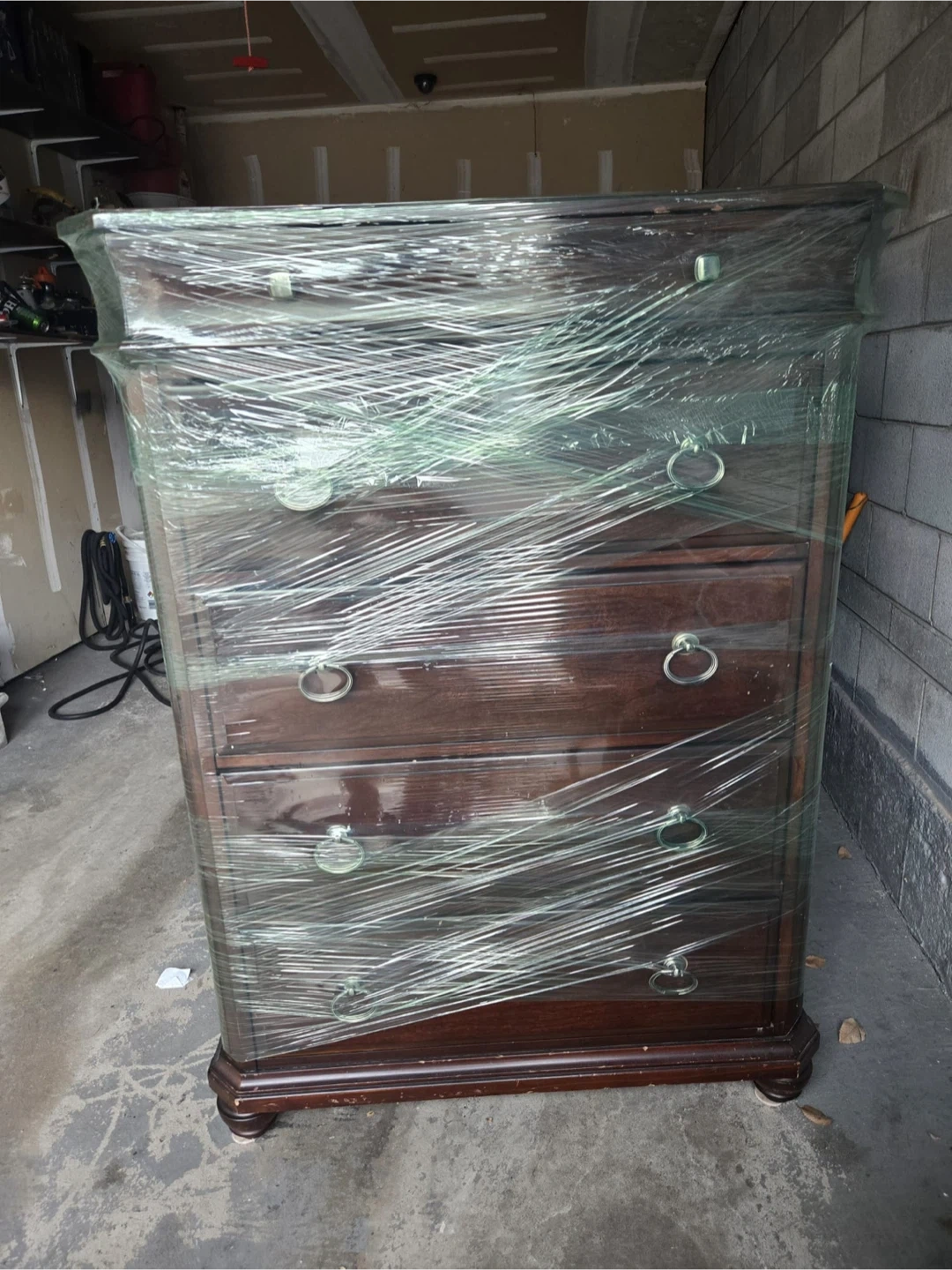 Selling a wooden 5-drawer chest. It's wrapped in plastic for protection during transport. The chest features a classic design with ring-pull handles. Perfect for adding storage to any room. small scratches no damage and drawers all works perfect. Selling as is.