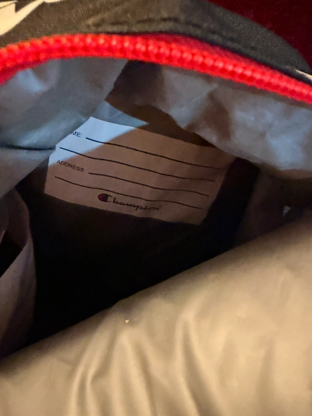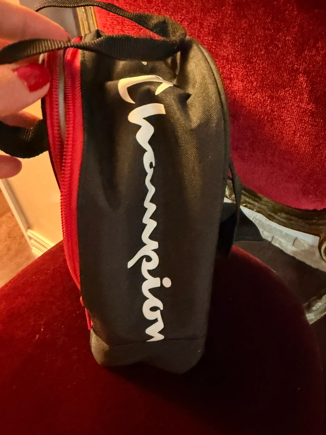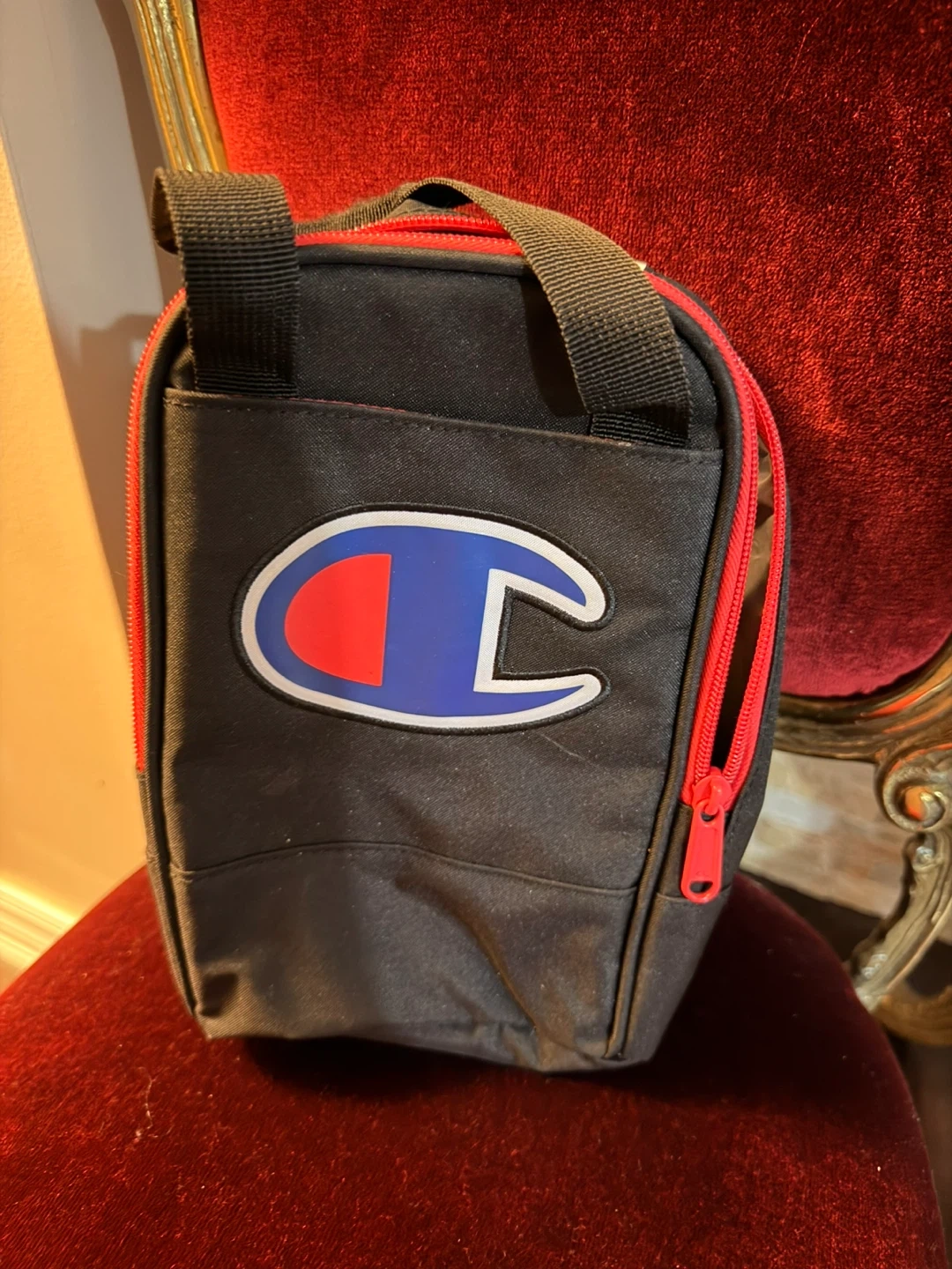 Champion lunch bag in great condition! It's black with a red zipper and the Champion logo on the front. There's also a space inside to write your name and address so it doesn't get lost.