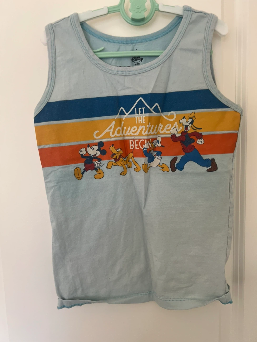 Cute Disney tank top featuring Mickey Mouse, Pluto, Donald Duck, and Goofy! The shirt is a light blue with colourful stripes and says "Let the adventures begin". Size is M (7/8). Perfect for any Disney fan!