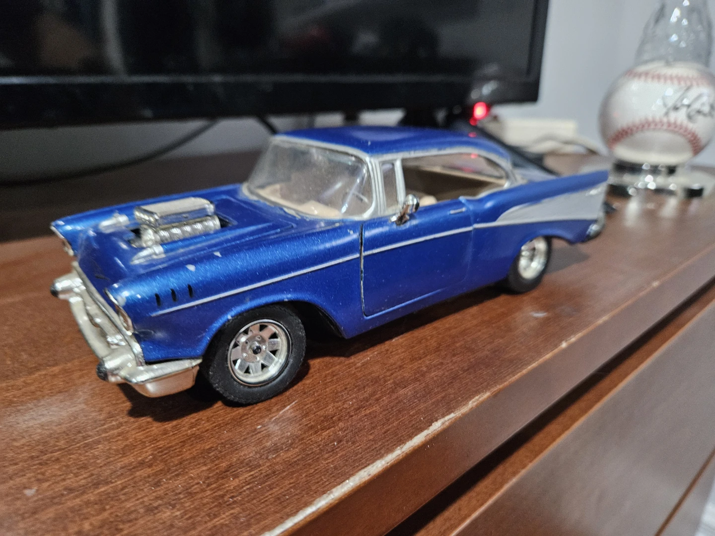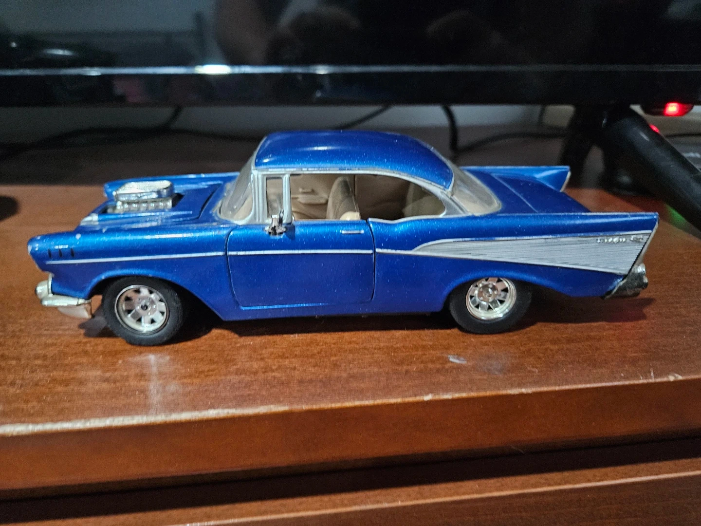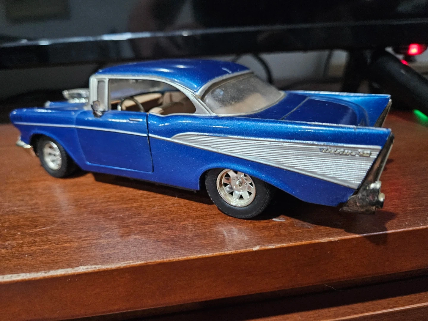 Selling a 1:24 scale blue diecast model of a 1957 Chevy Bel Air.