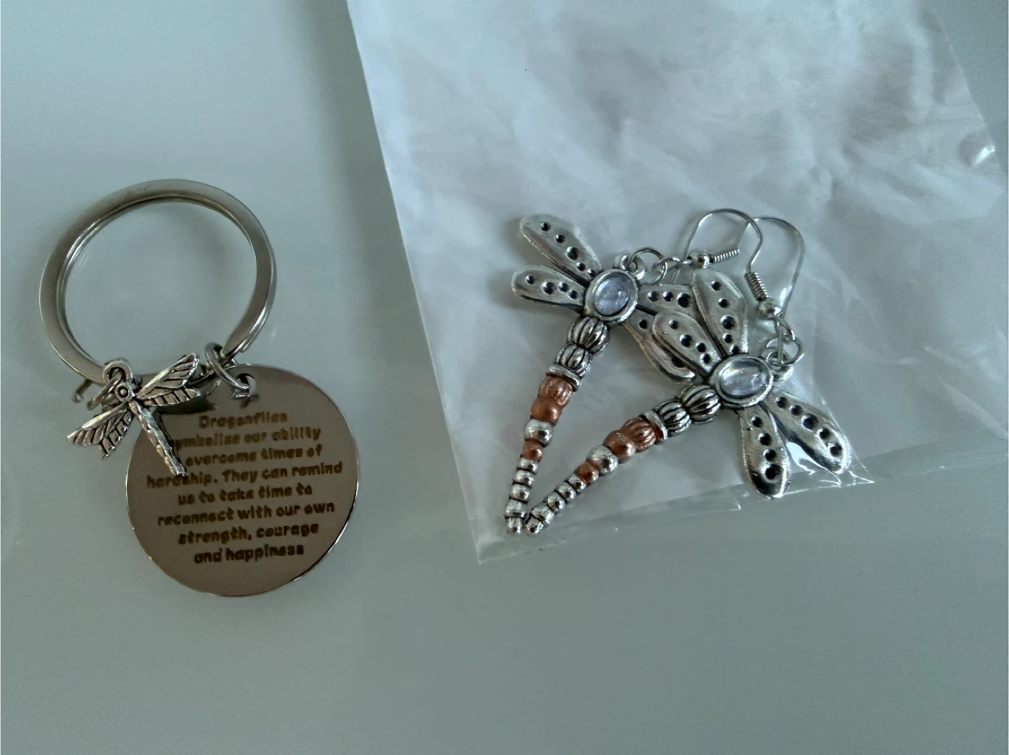 Dragonfly earrings and keychain set! The keychain has a lovely message about strength, courage, and happiness. The earrings are silver with copper-coloured accents. Perfect for a gift or to treat yourself