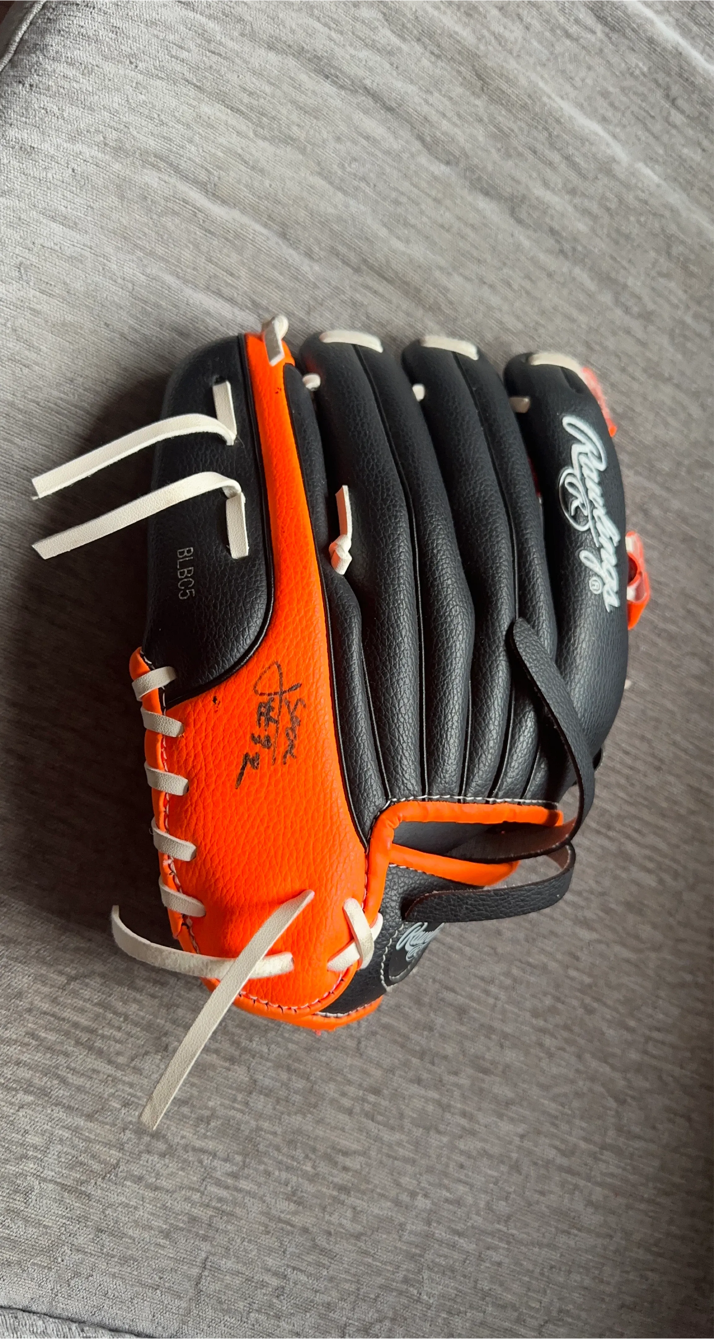 Selling a Rawlings baseball glove in great condition! It's black and orange, perfect for the upcoming season. The model number appears to be BLBC5. I have collected 3 signatures on there as well