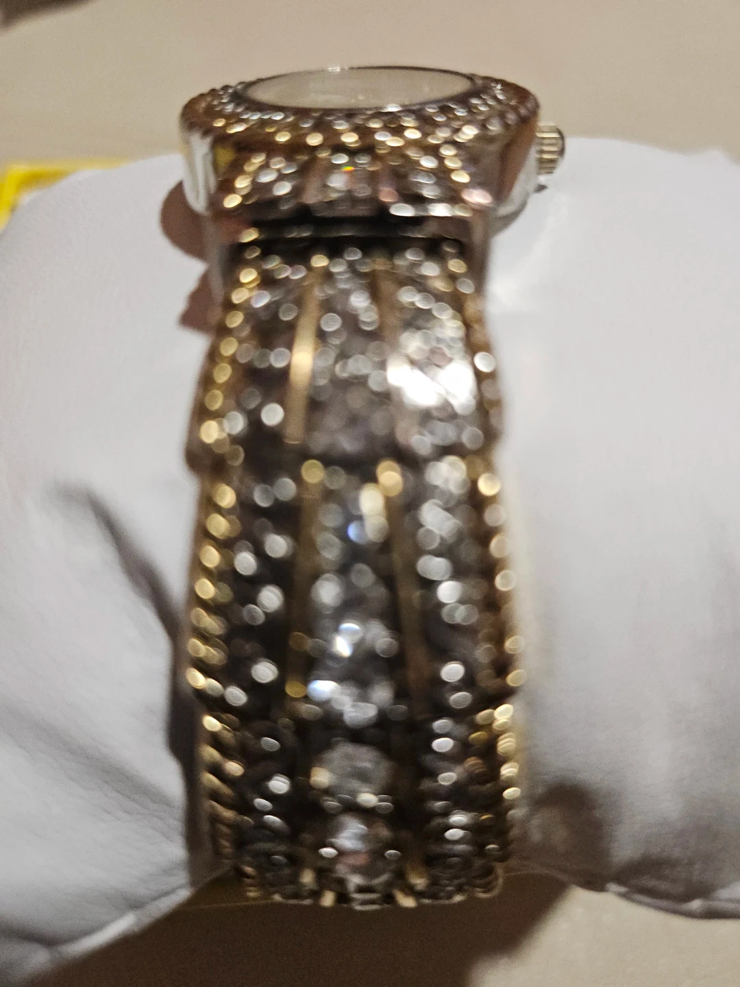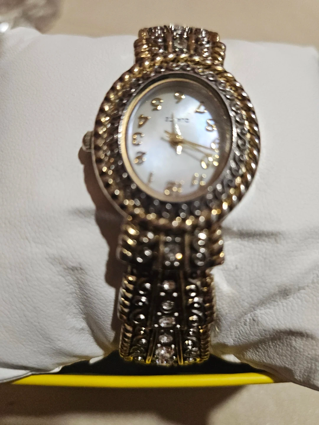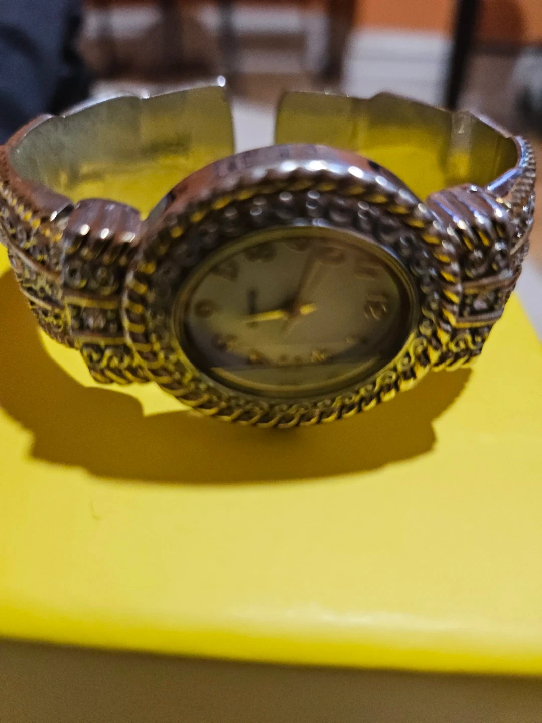 Selling a Accutime bangle watch. It's in good condition and has a unique design. The watch features a decorative bangle-style bracelet with intricate details. The watch face is easy to read. Perfect for adding a touch of elegance to any outfit
