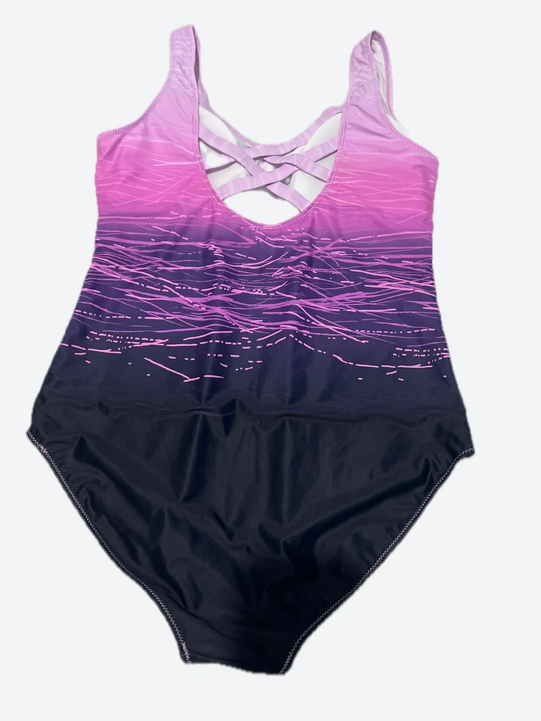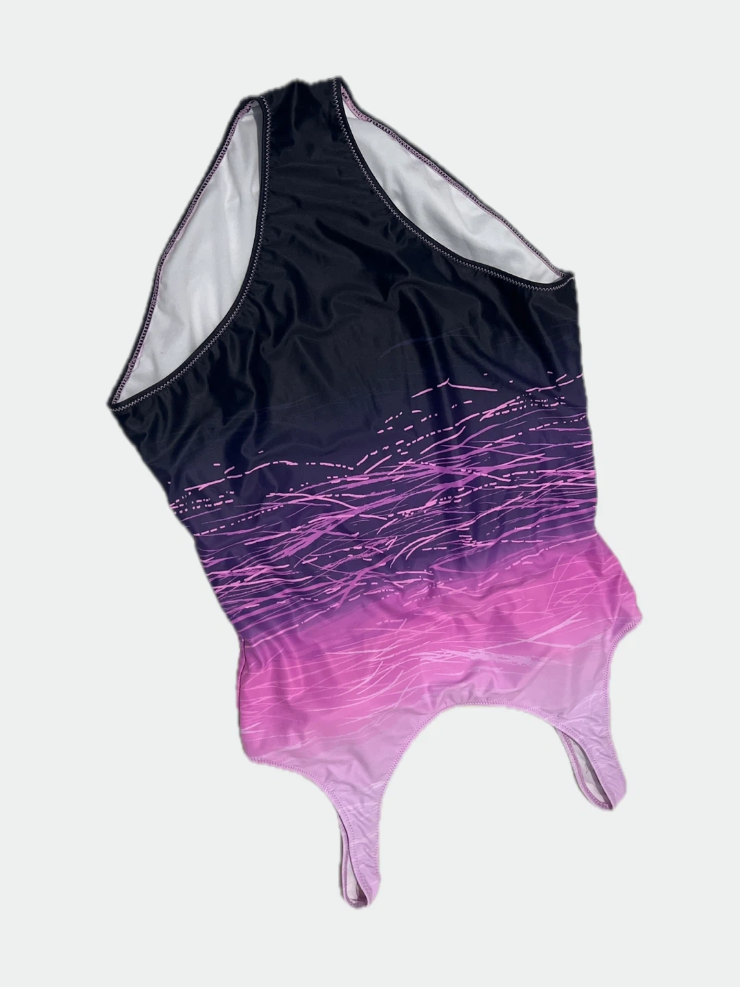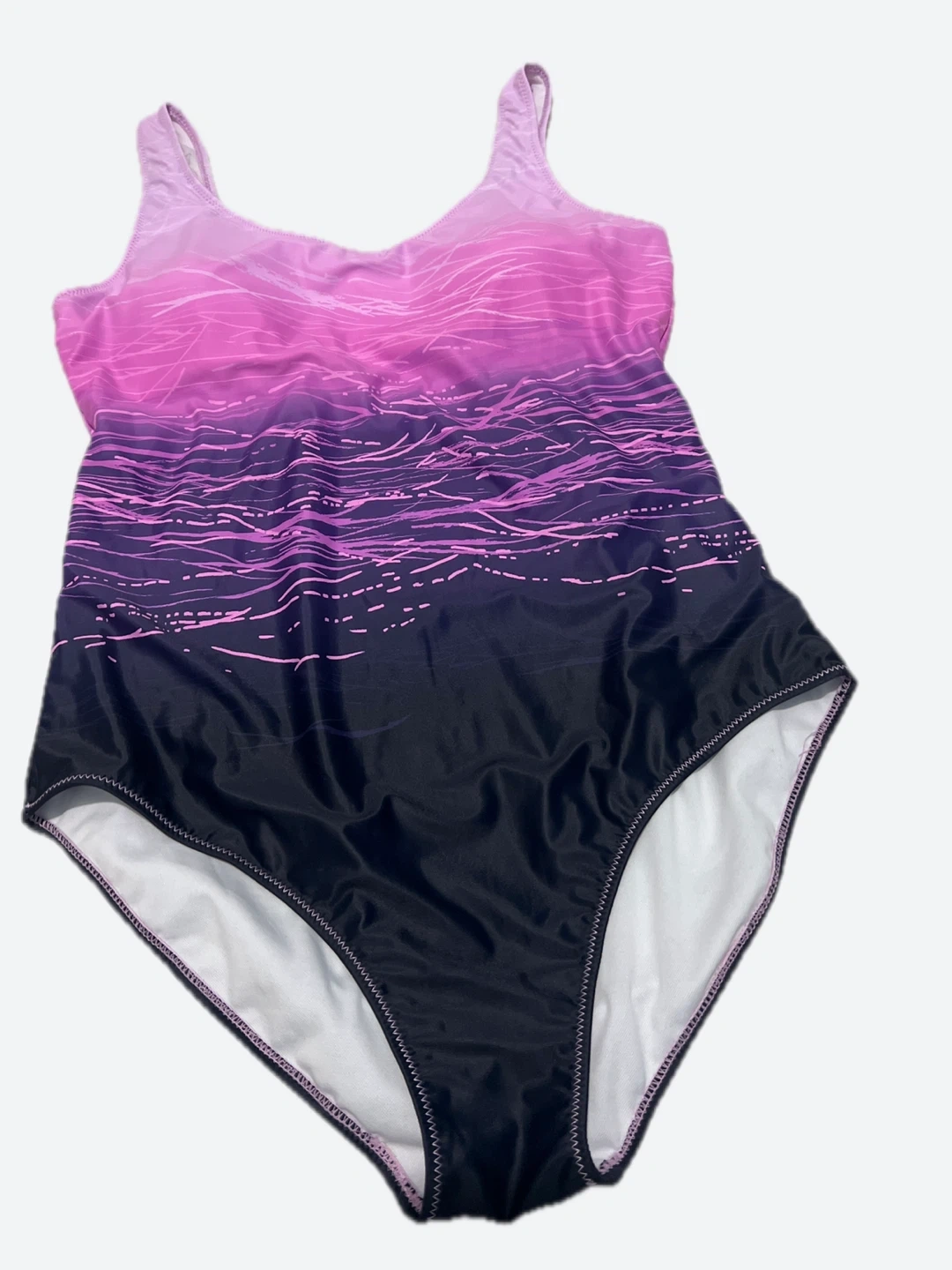 Cute swimsuit featuring a pink, purple, and black colour gradient and a unique pattern. It's in great condition and ready for the summer! Padded and extra layers of lined in the chest area.