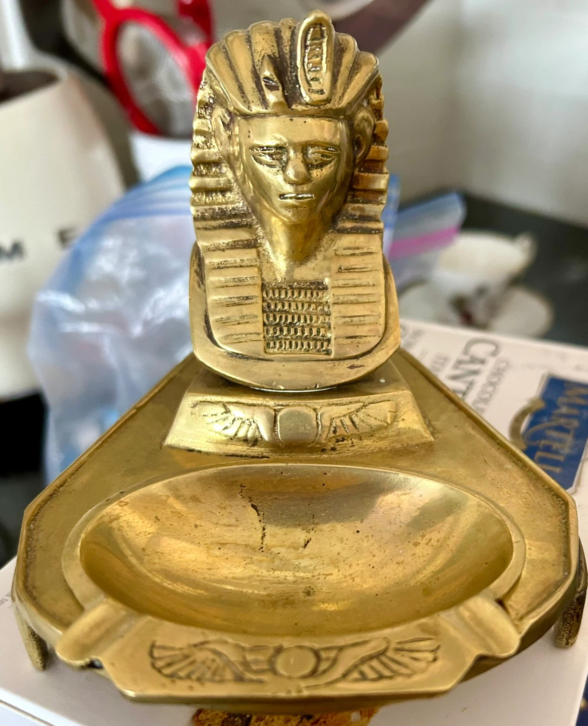 This is a vintage brass ashtray featuring an Egyptian pharaoh design. It has a unique look and is made of brass, with some signs of use.