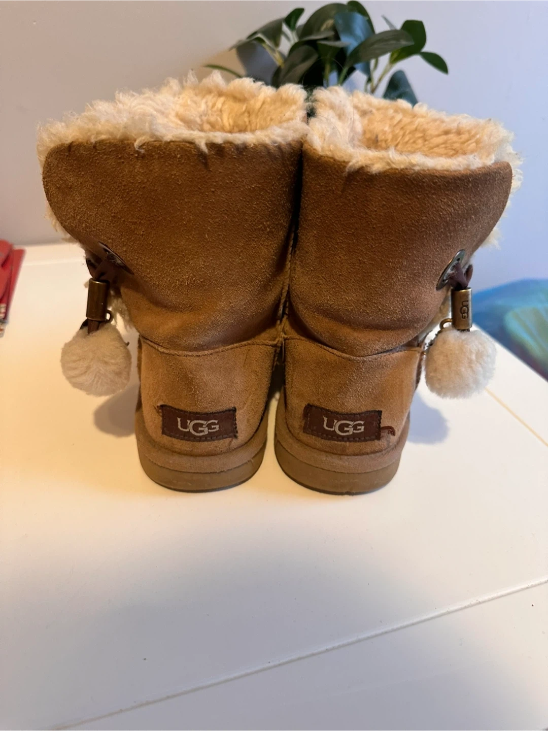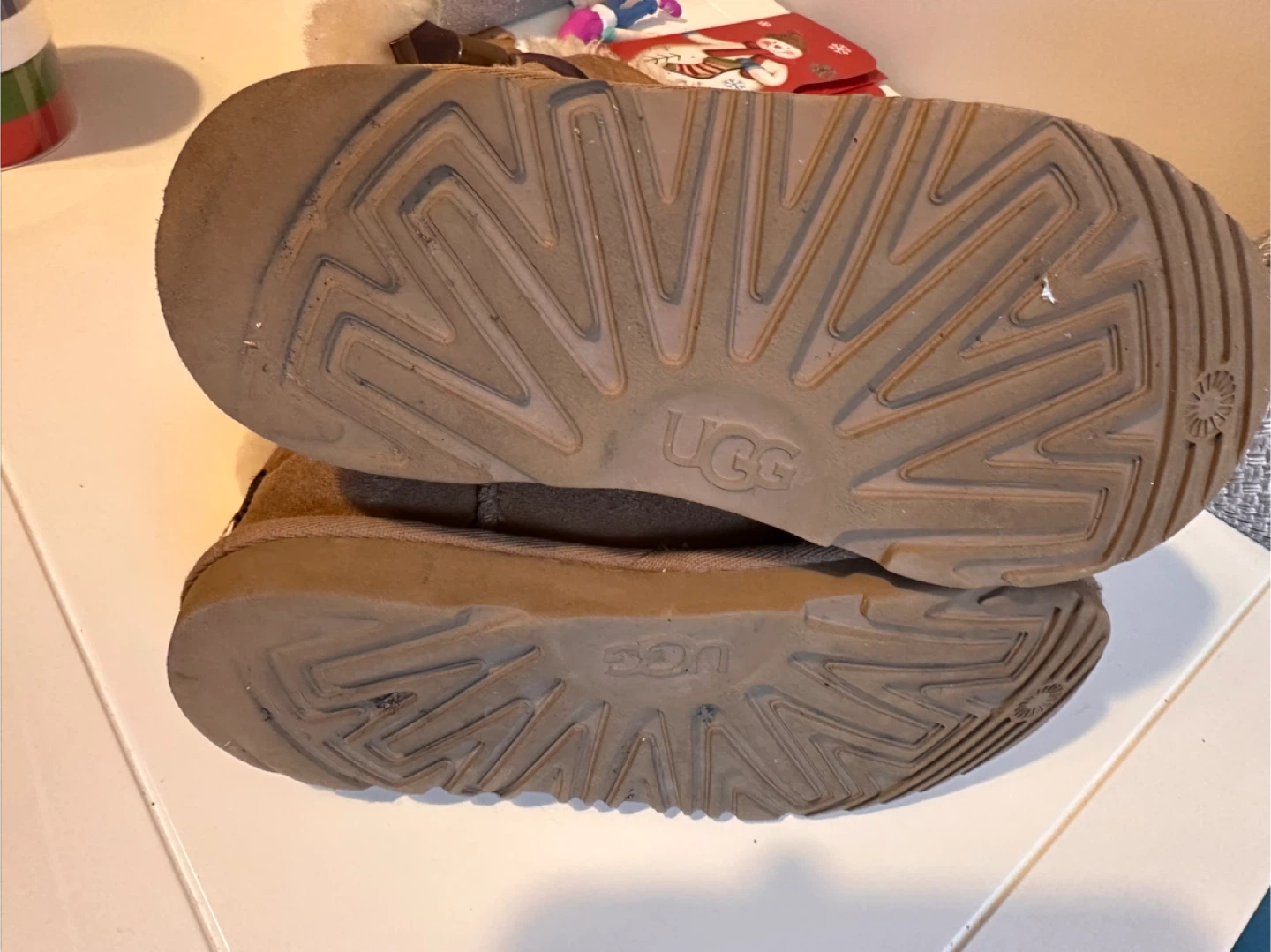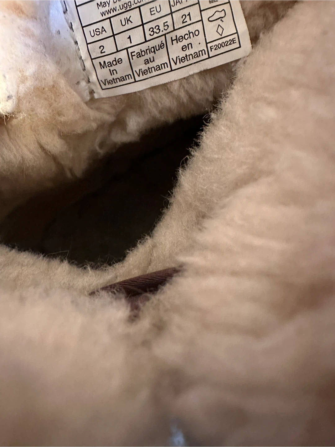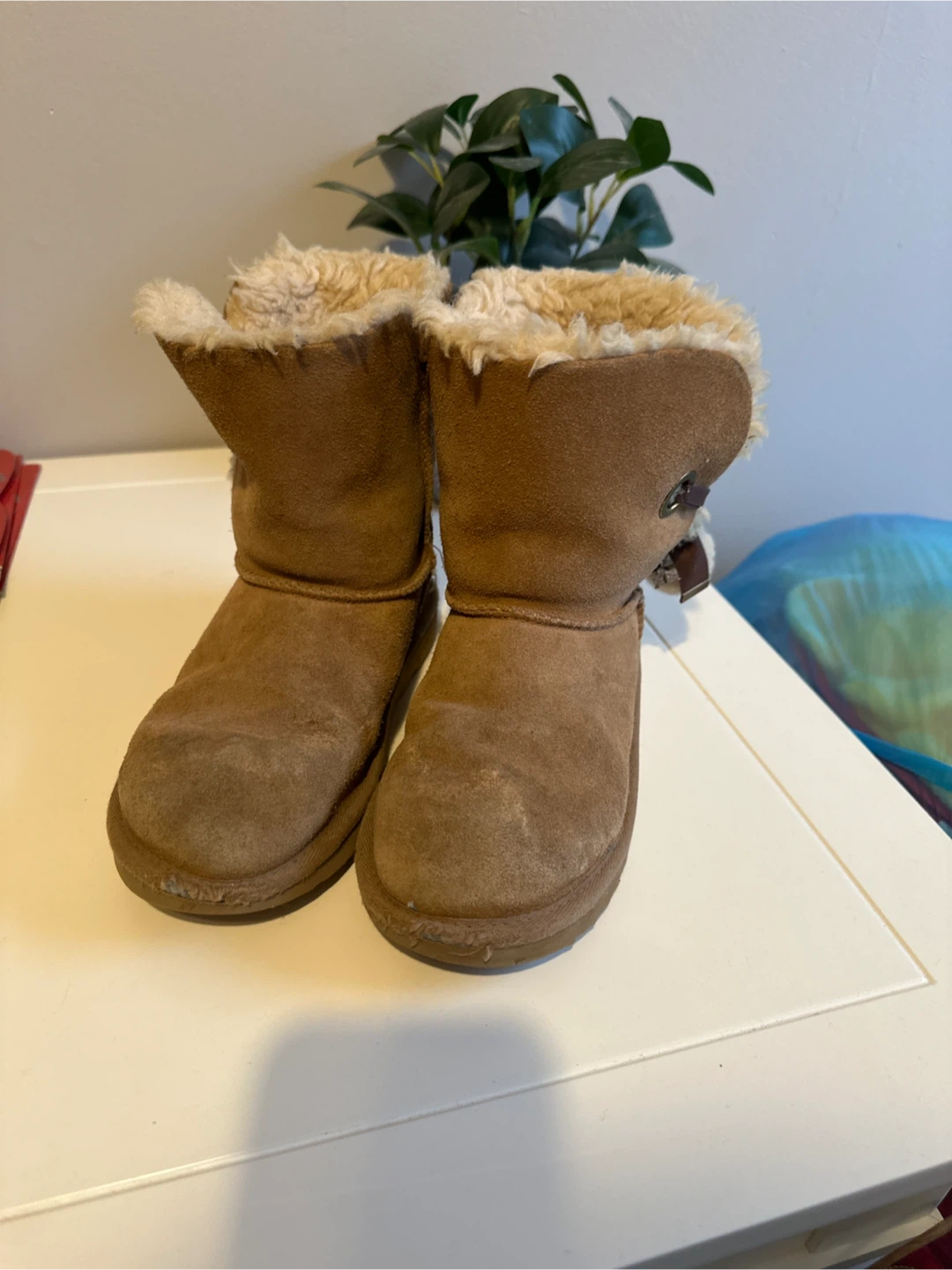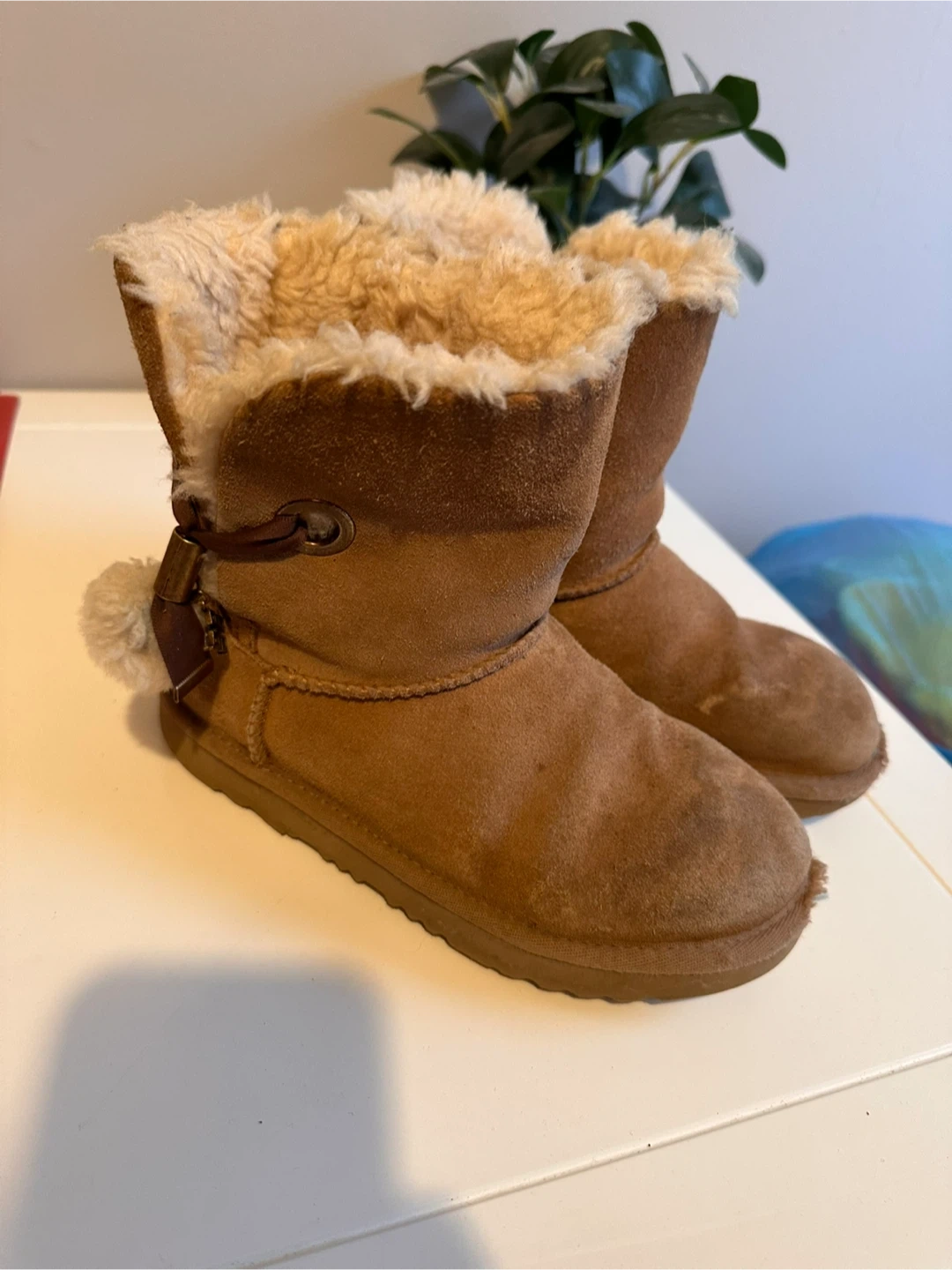 Selling a pair of UGG boots in size 2 girls They are in used condition, as shown in the pictures. They are a beautiful brown colour with a soft, furry lining to keep your feet warm and cozy!