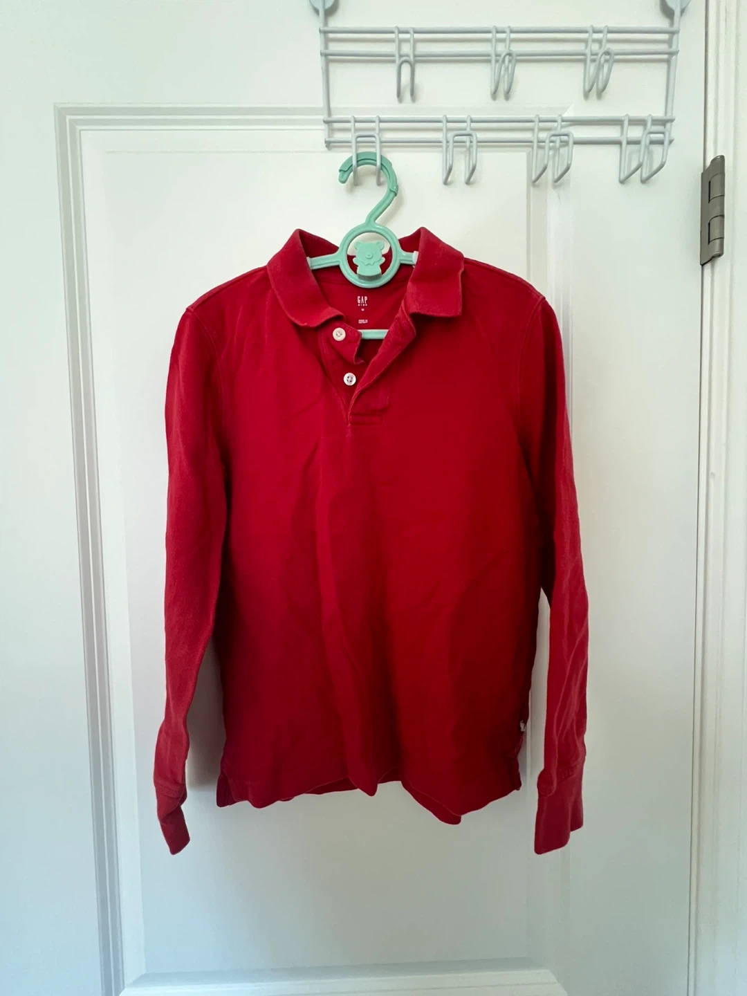 Selling a red long sleeve polo shirt from GAP. It's in good condition and perfect for layering or wearing on its own. The shirt features a classic polo collar with a button-up placket and long sleeves