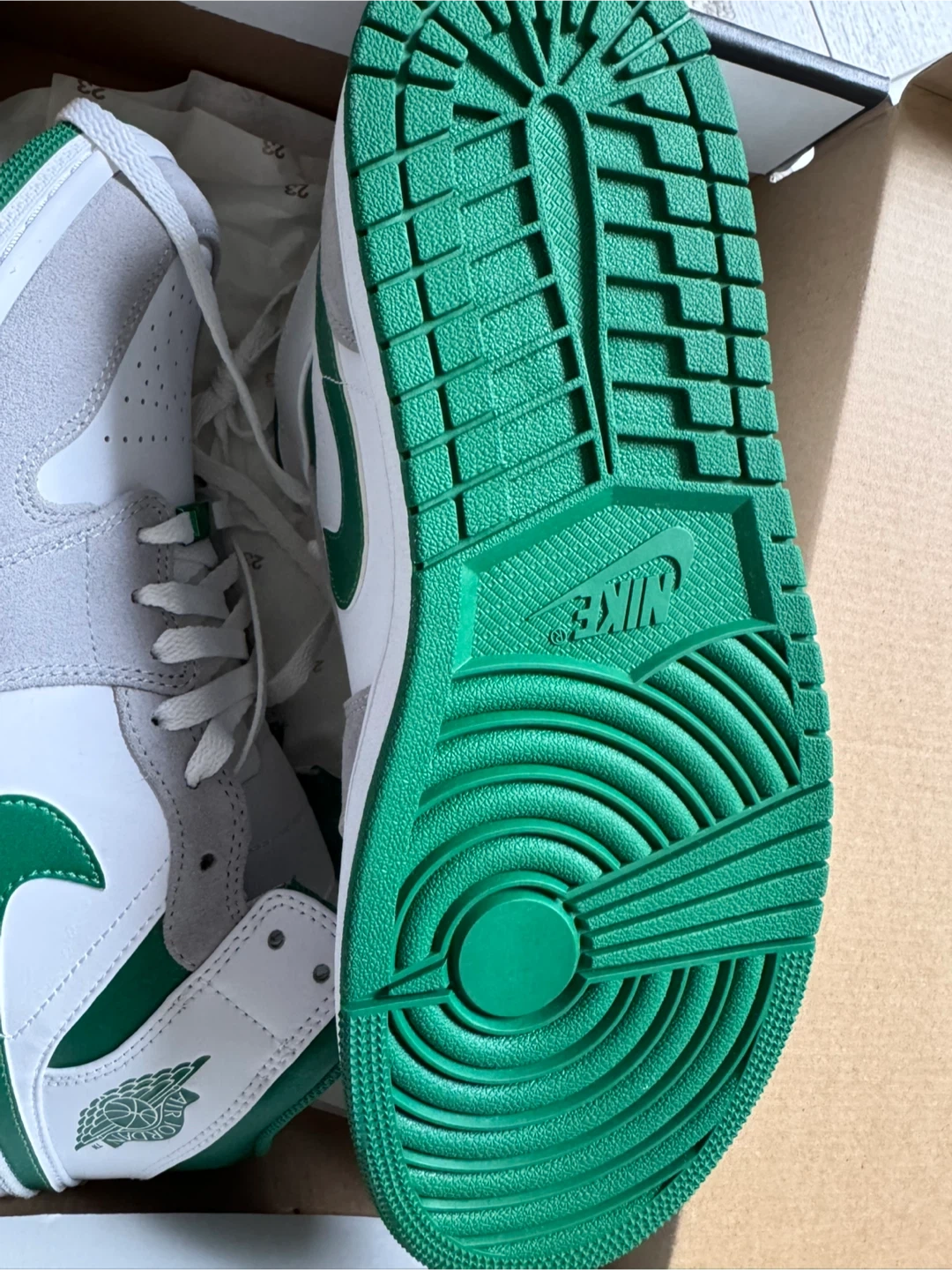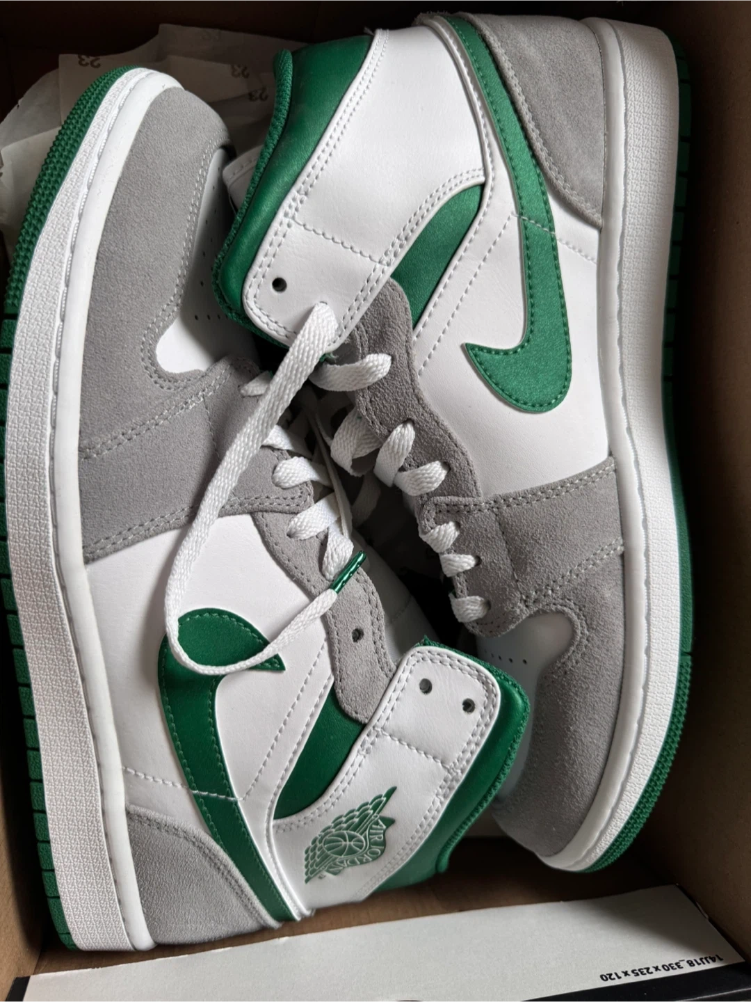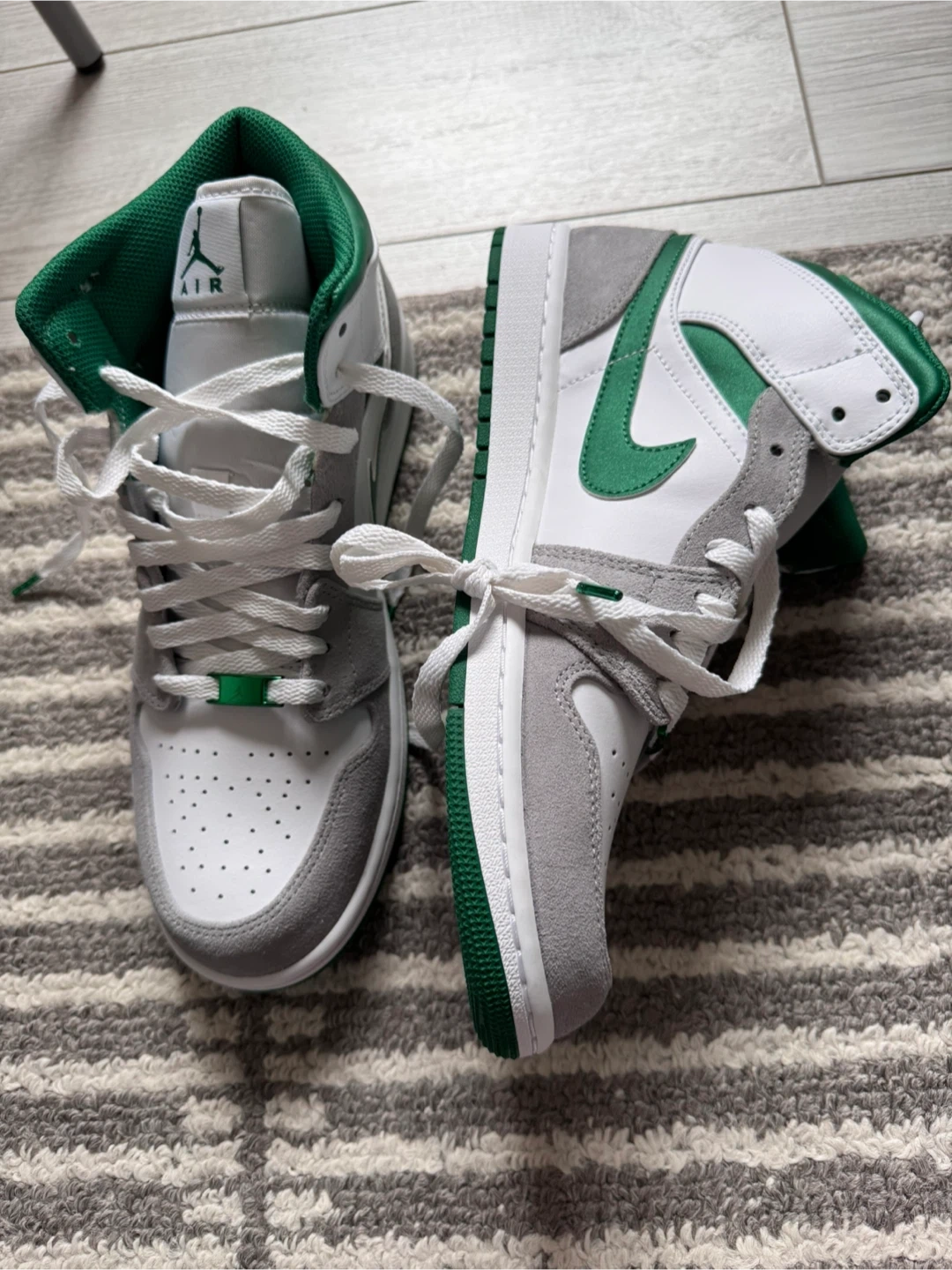 Selling a pair of Nike Air Jordan 1 mid in the Lucky Green colourway! These are in great condition and come with the original box. The shoes feature a white leather upper with grey suede accents and green detailing. A stylish addition to any sneaker collection!