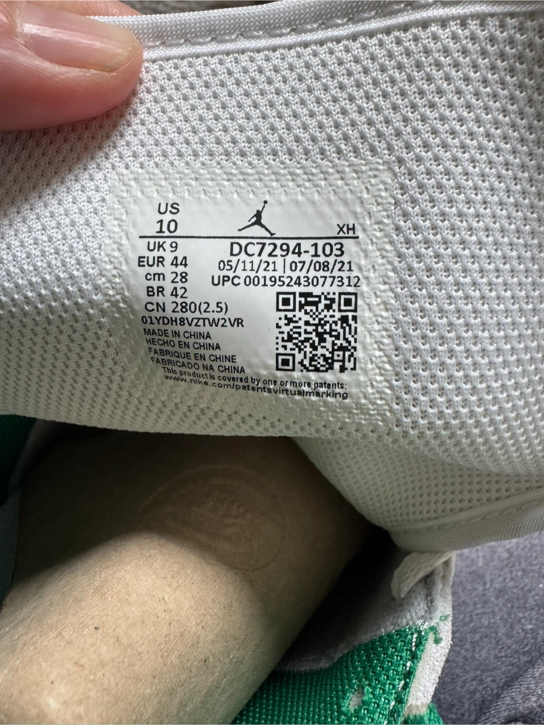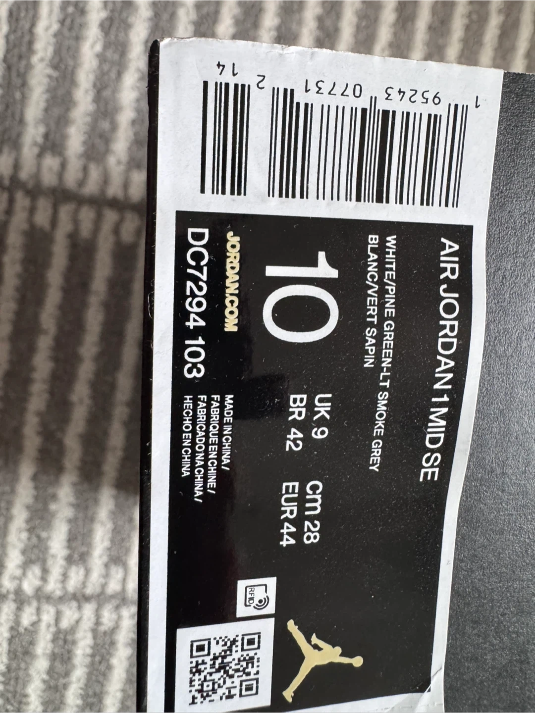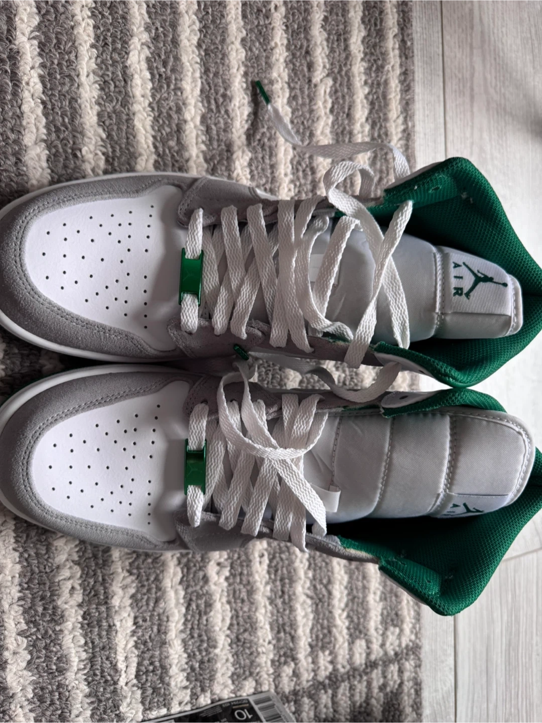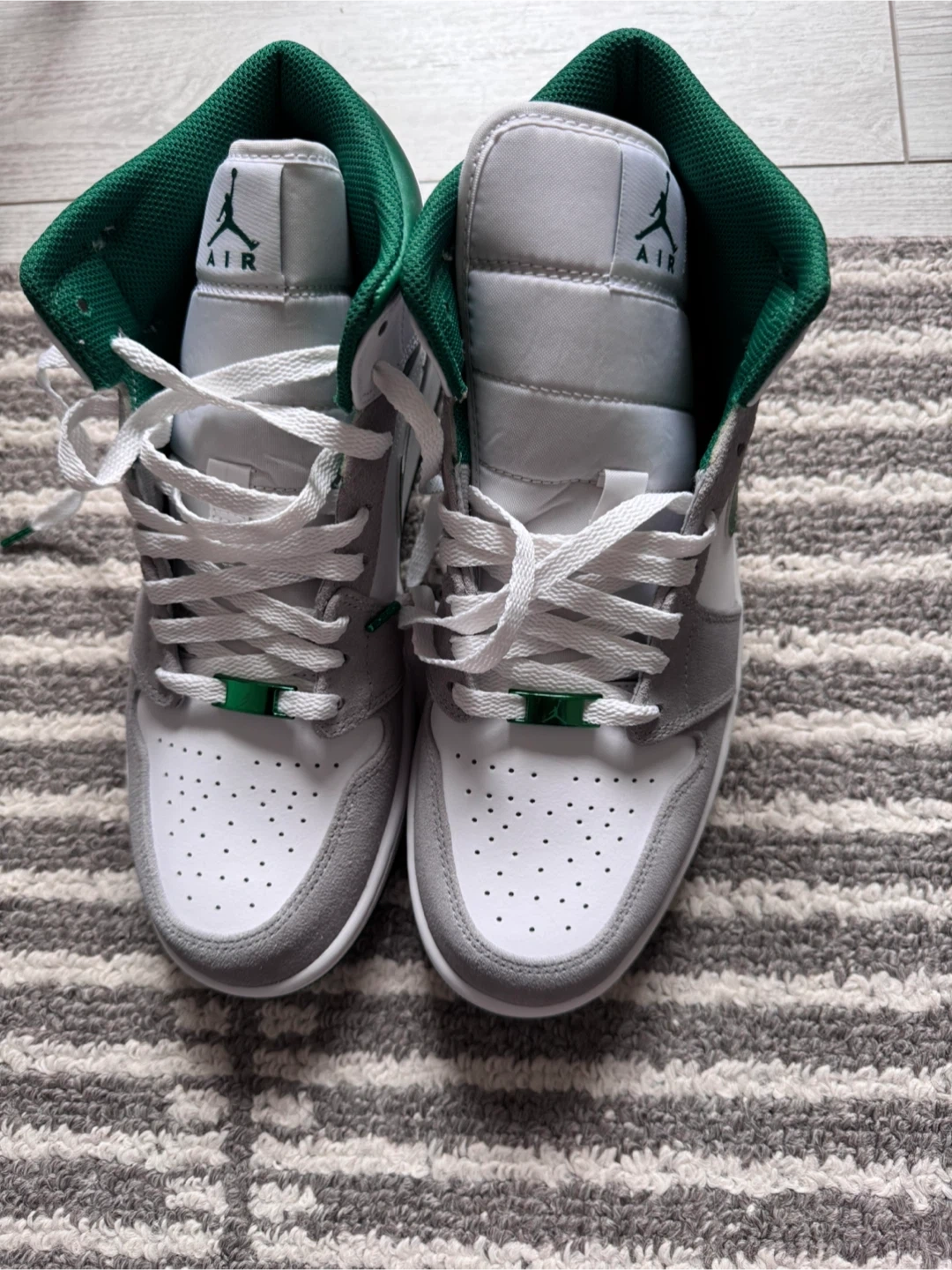 Selling a pair of Nike Air Jordan 1 mid in the Lucky Green colourway! These are in great condition and come with the original box. The shoes feature a white leather upper with grey suede accents and green detailing. A stylish addition to any sneaker collection!