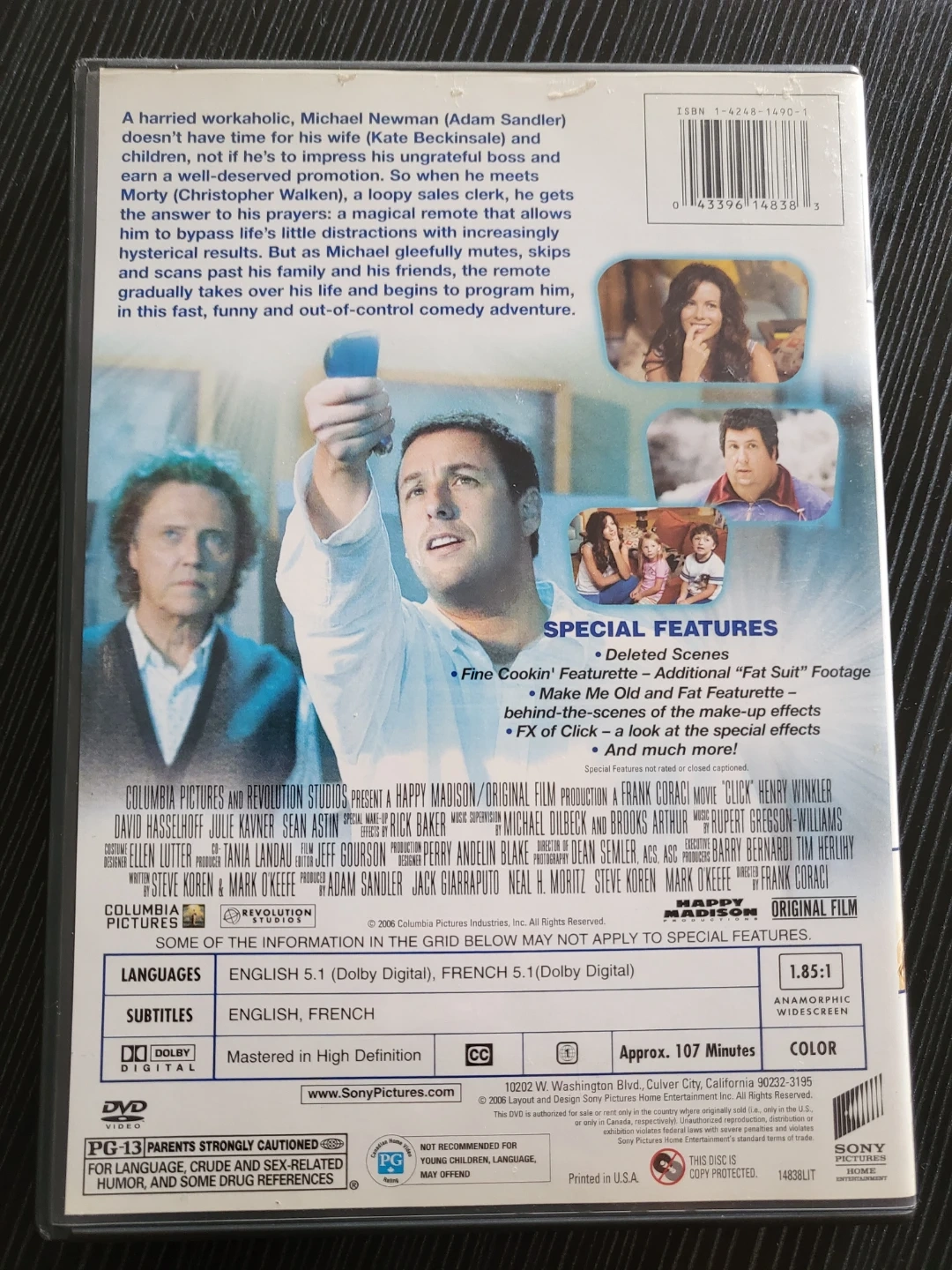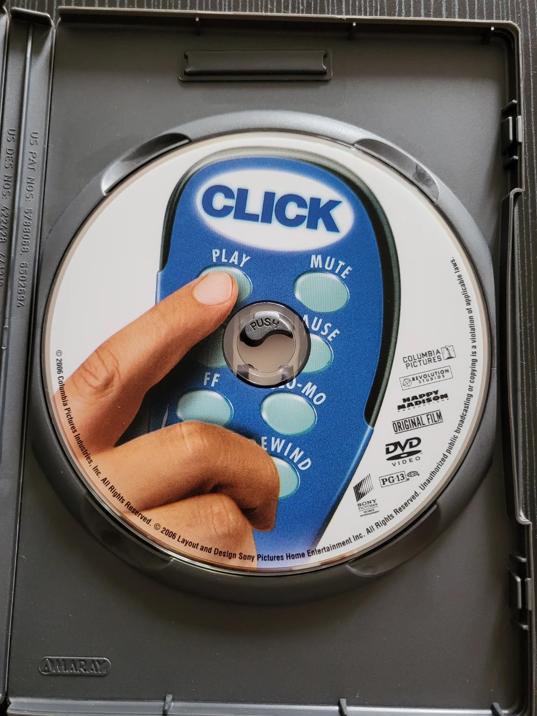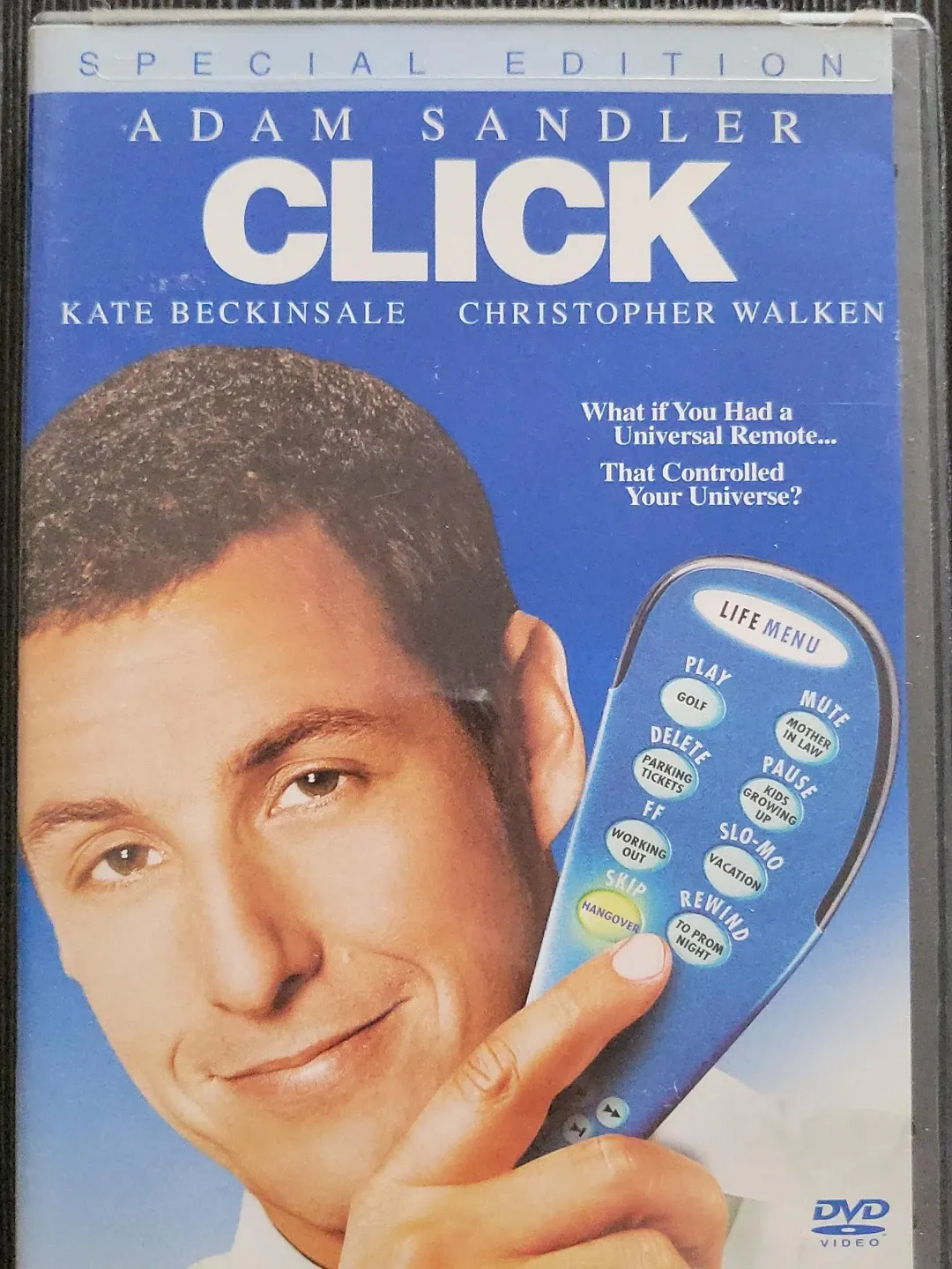 Selling the DVD movie Click starring Adam Sandler, Kate Beckinsale, and Christopher Walken! It's a comedy about a universal remote that controls your universe. Includes special features such as deleted scenes and behind-the-scenes footage