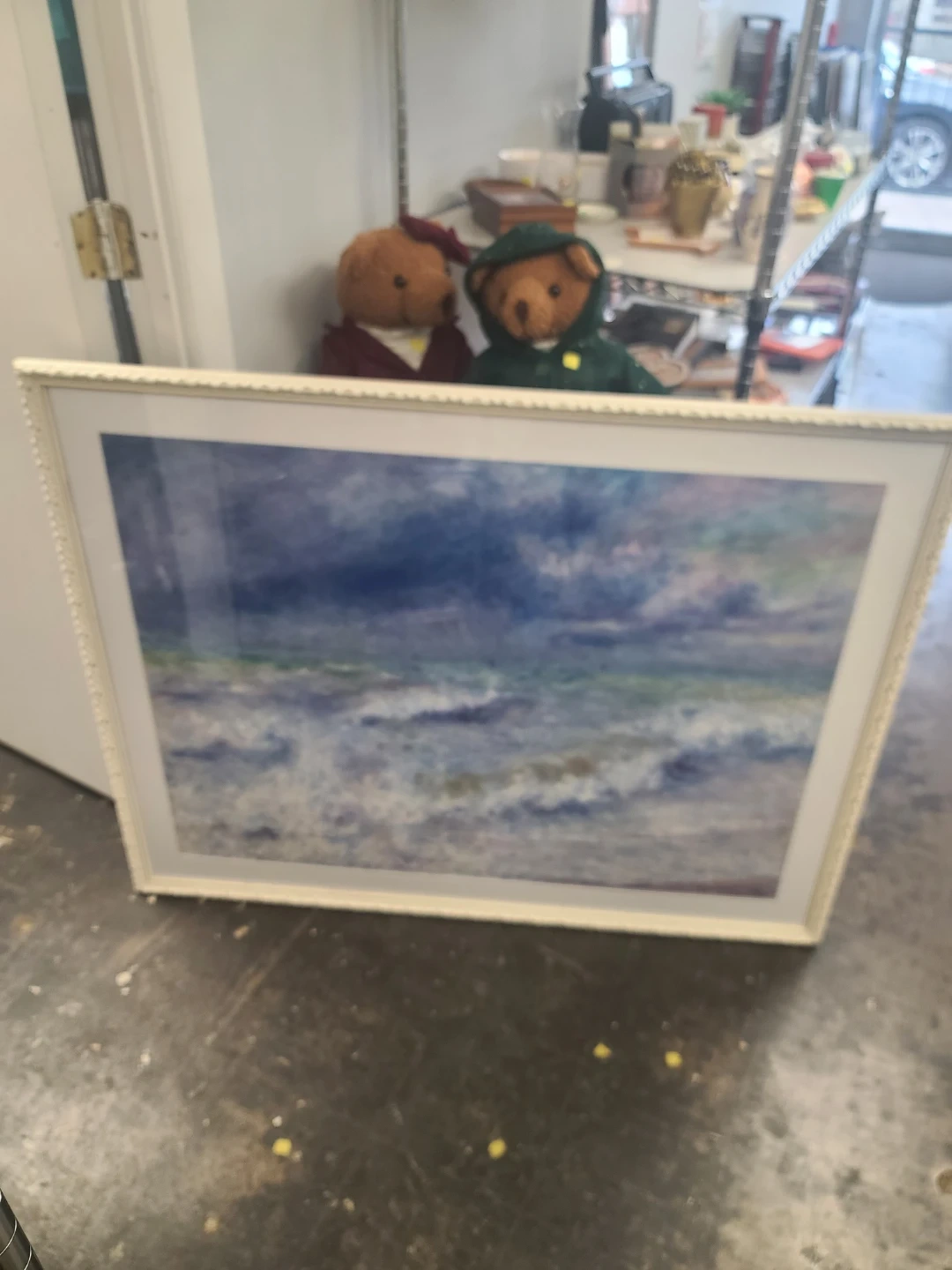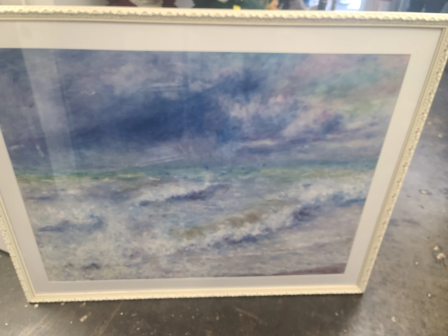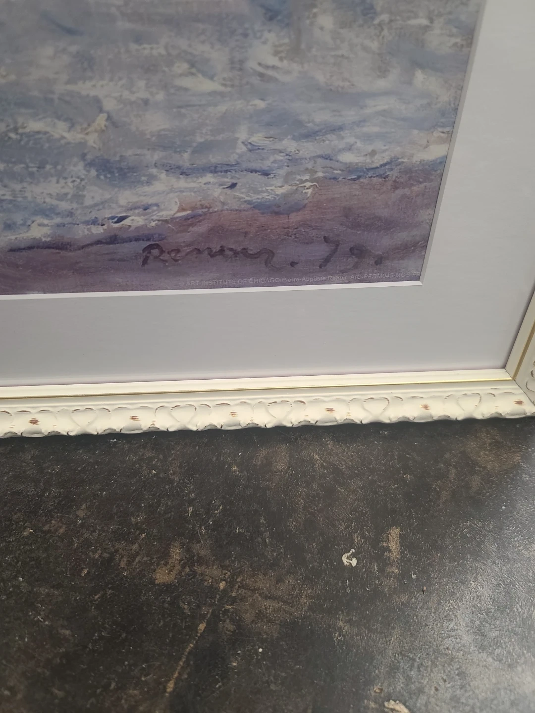 Selling a framed print of Pierre-Auguste Renoir " Renoir - Seascape 1897 " Painting Print Renoir painting. The frame is white and the print features a seascape with blue and white tones. It would make a nice addition to any room! 46 by 36 inches