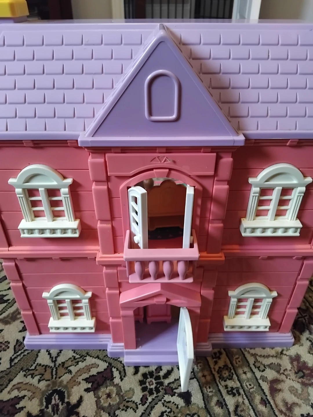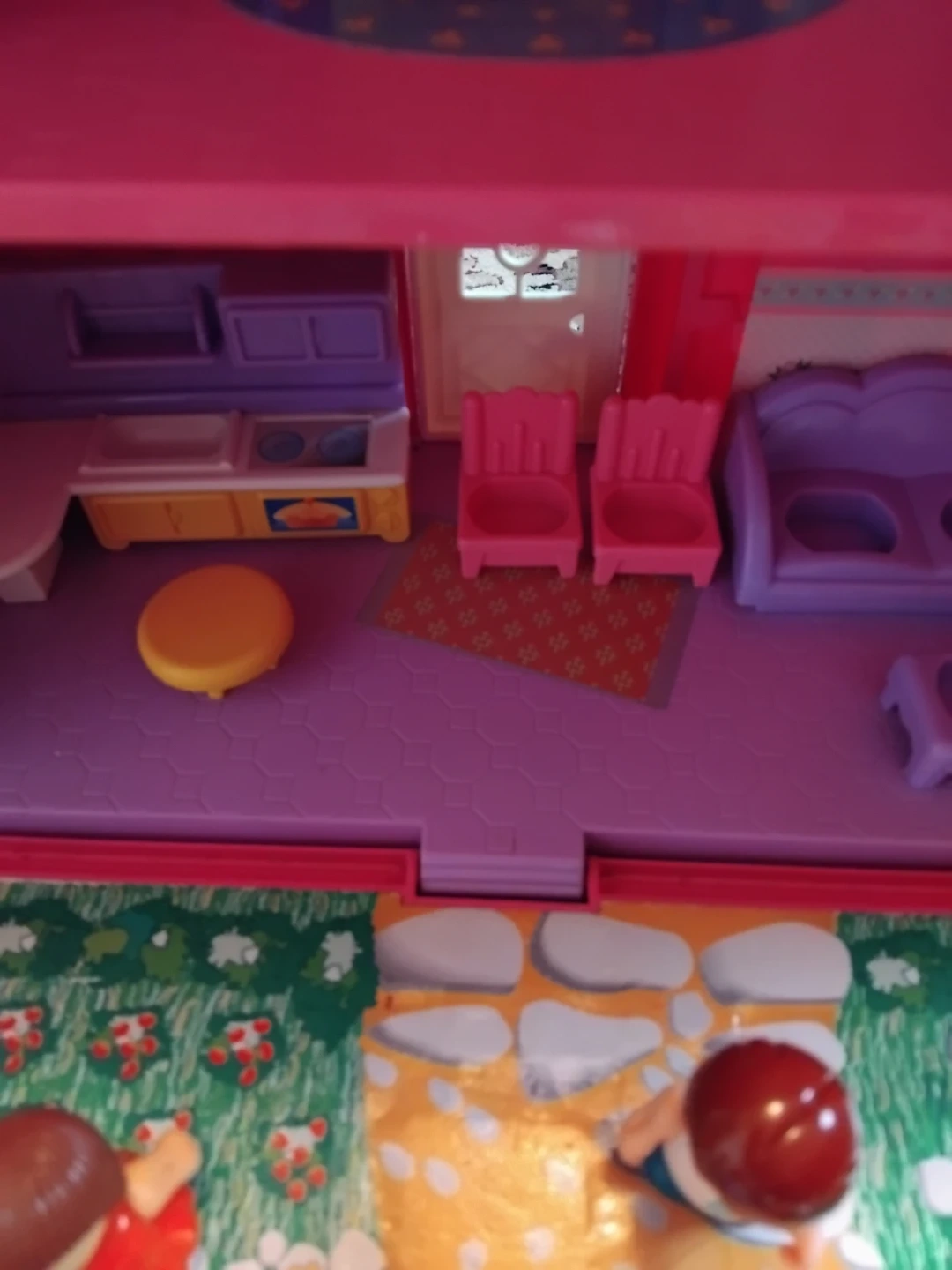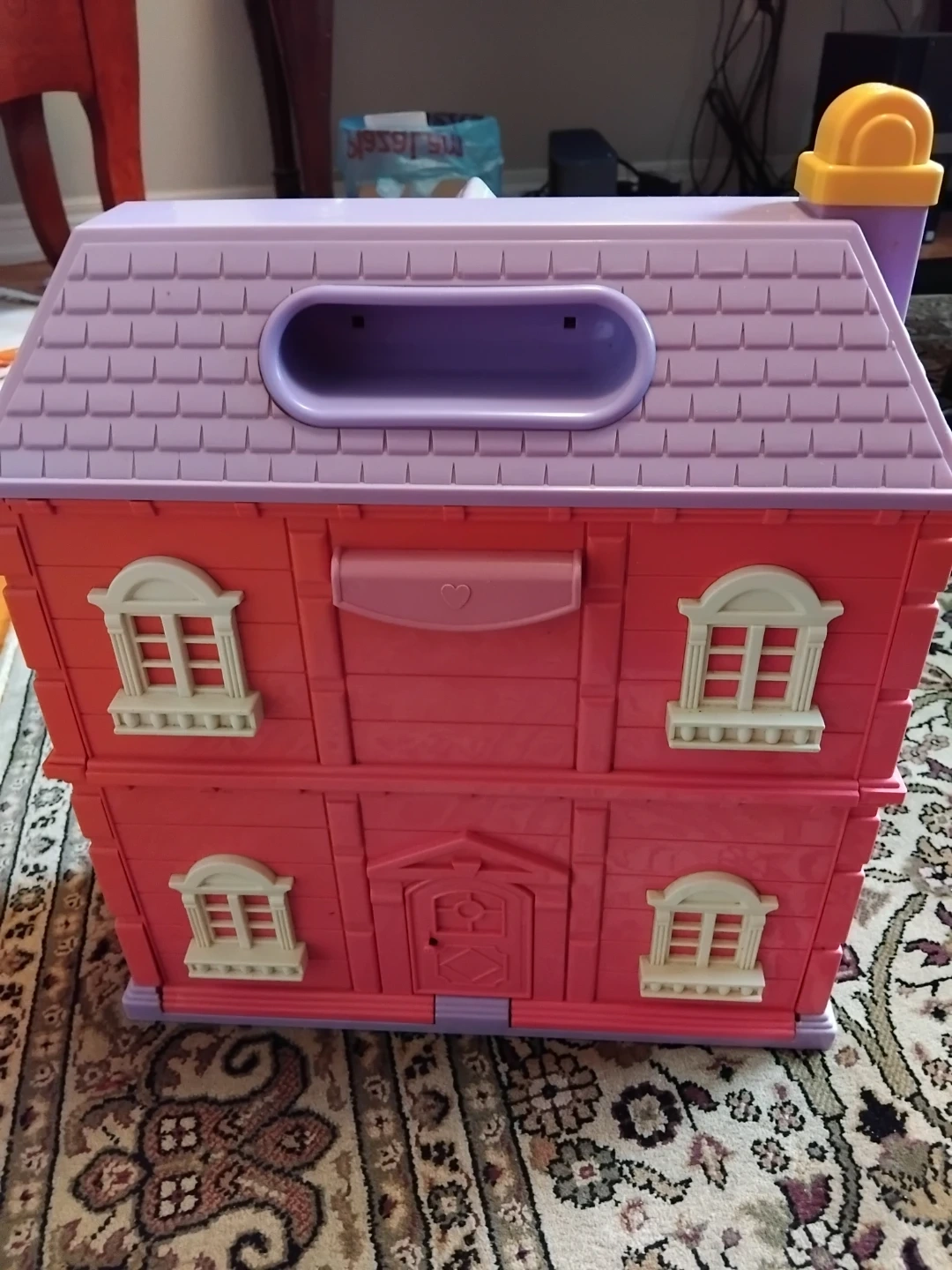 Selling a dollhouse that comes with furniture and figures. It features a pink and lavender colour scheme. Perfect for imaginative play!