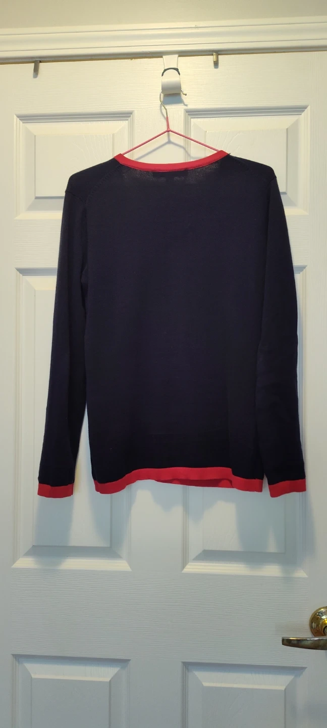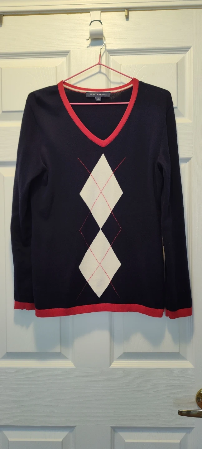 Tommy Hilfiger sweater with an argyle pattern! It's a navy blue colour with red trim and white diamonds in the argyle pattern. Perfect for layering on cooler days.