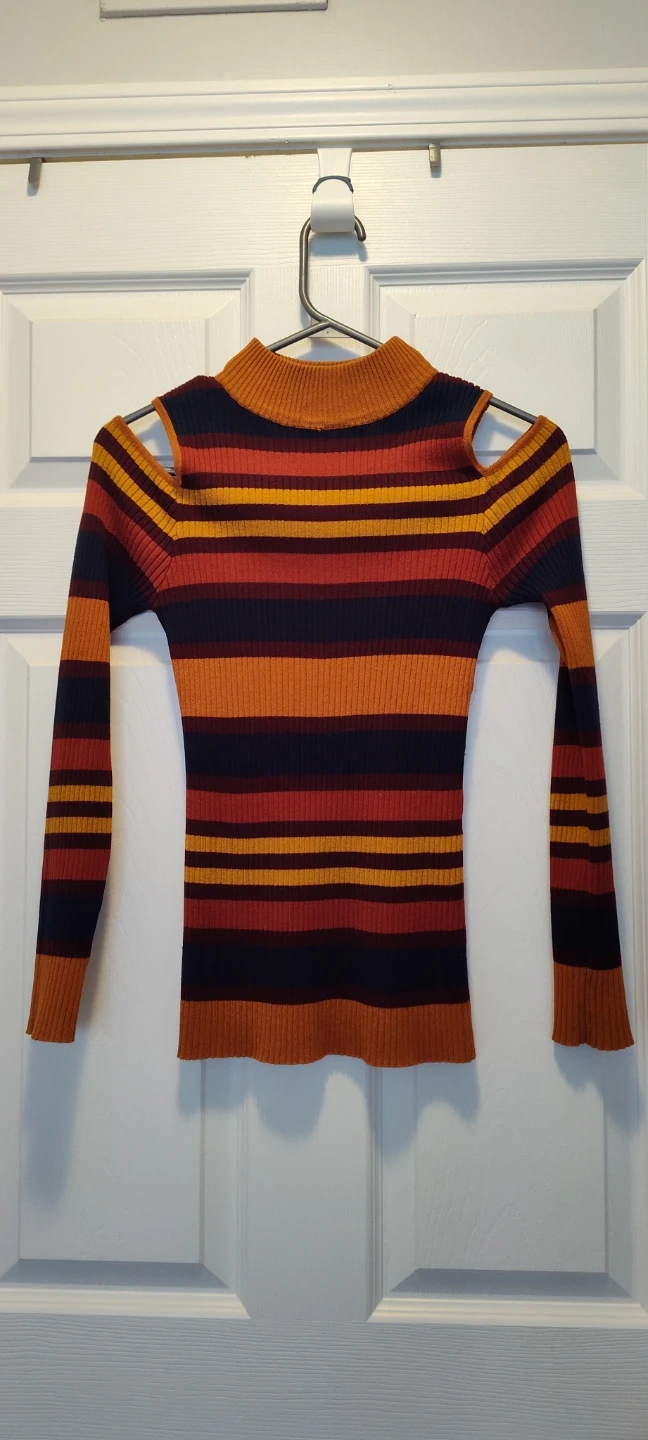 Here's a fun and stylish striped long sleeve top with a cold shoulder design! The colours are a mix of orange, red and navy blue stripes, making it a great piece to add some colour to your wardrobe.