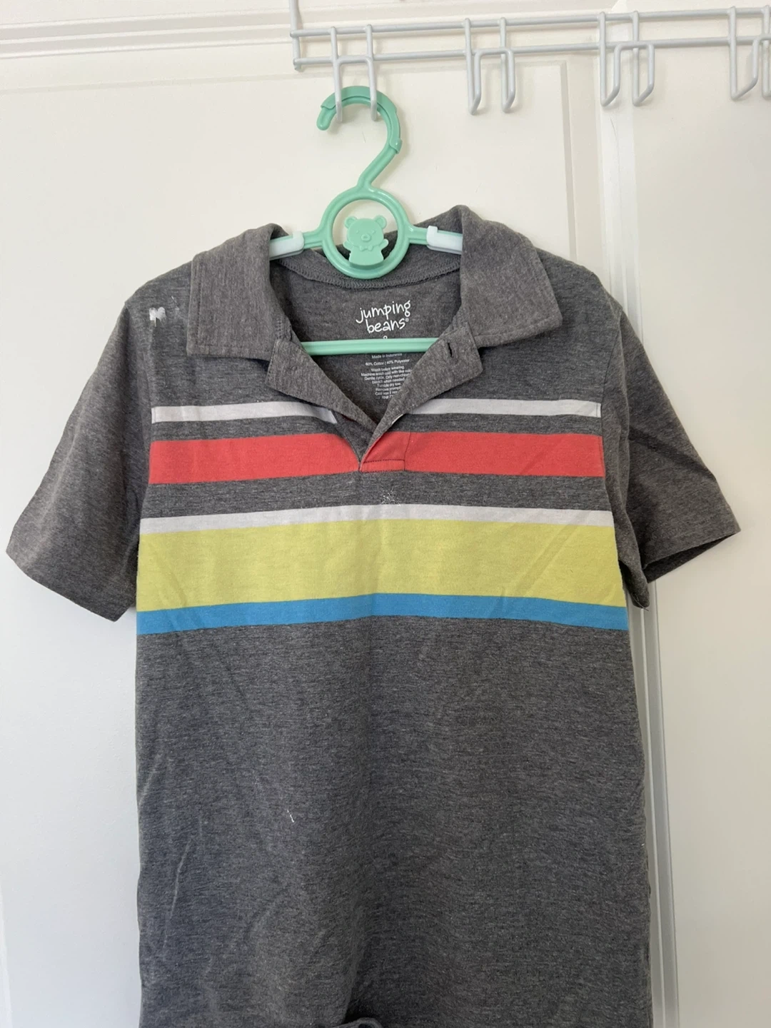 A cute polo shirt from Jumping Beans for your little one! This is a size 8 featuring a grey body with red, yellow, and blue stripes across the chest. Perfect for casual wear or dressing up a bit