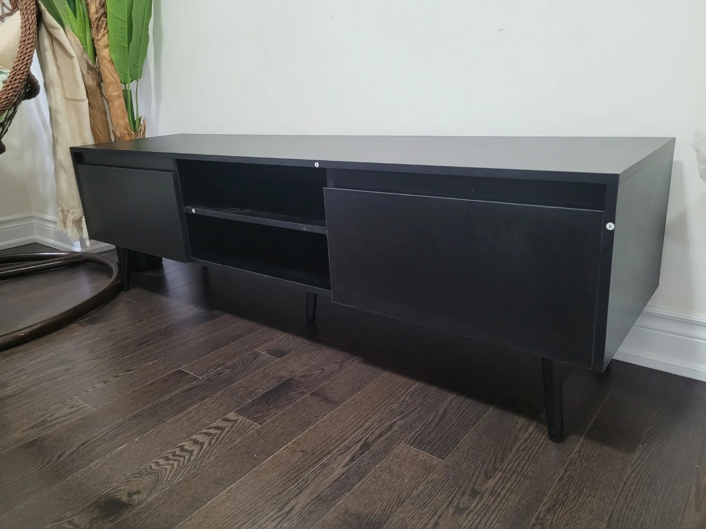 Selling a sleek black TV stand! It measures 63 inches in length, 15.94 inches in width, and 18.9 inches in height. Perfect for your living room or entertainment area
