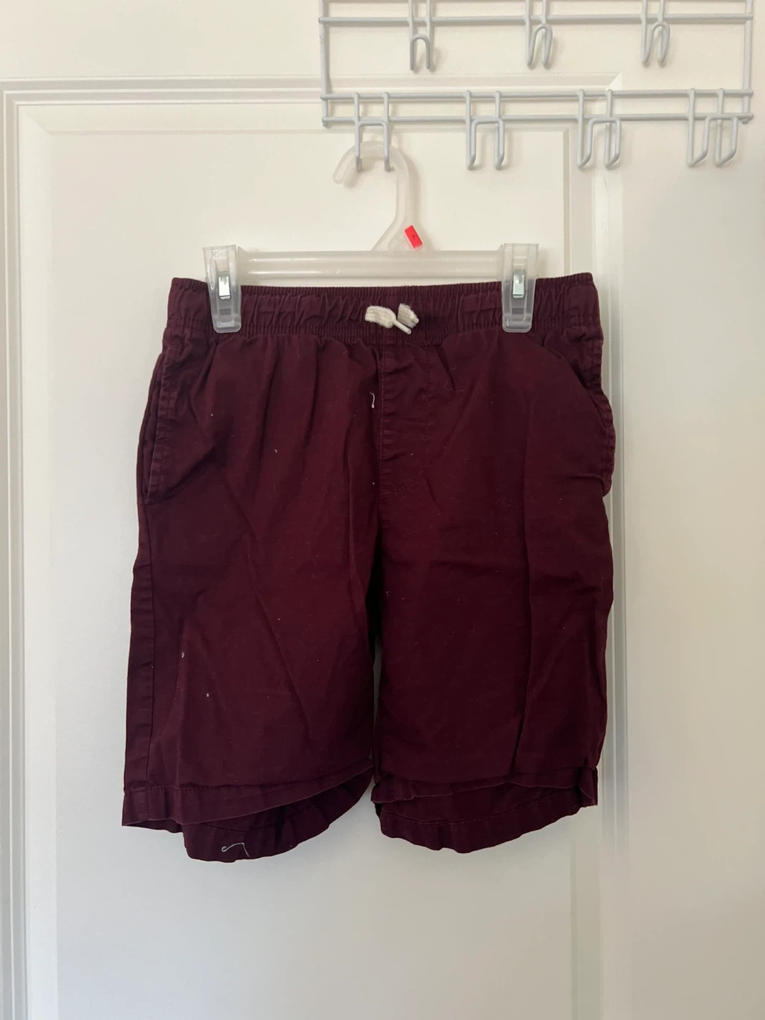 Selling a pair of boys' shorts in a nice burgundy colour. They have a comfortable elastic waistband with a drawstring. Perfect for casual wear!