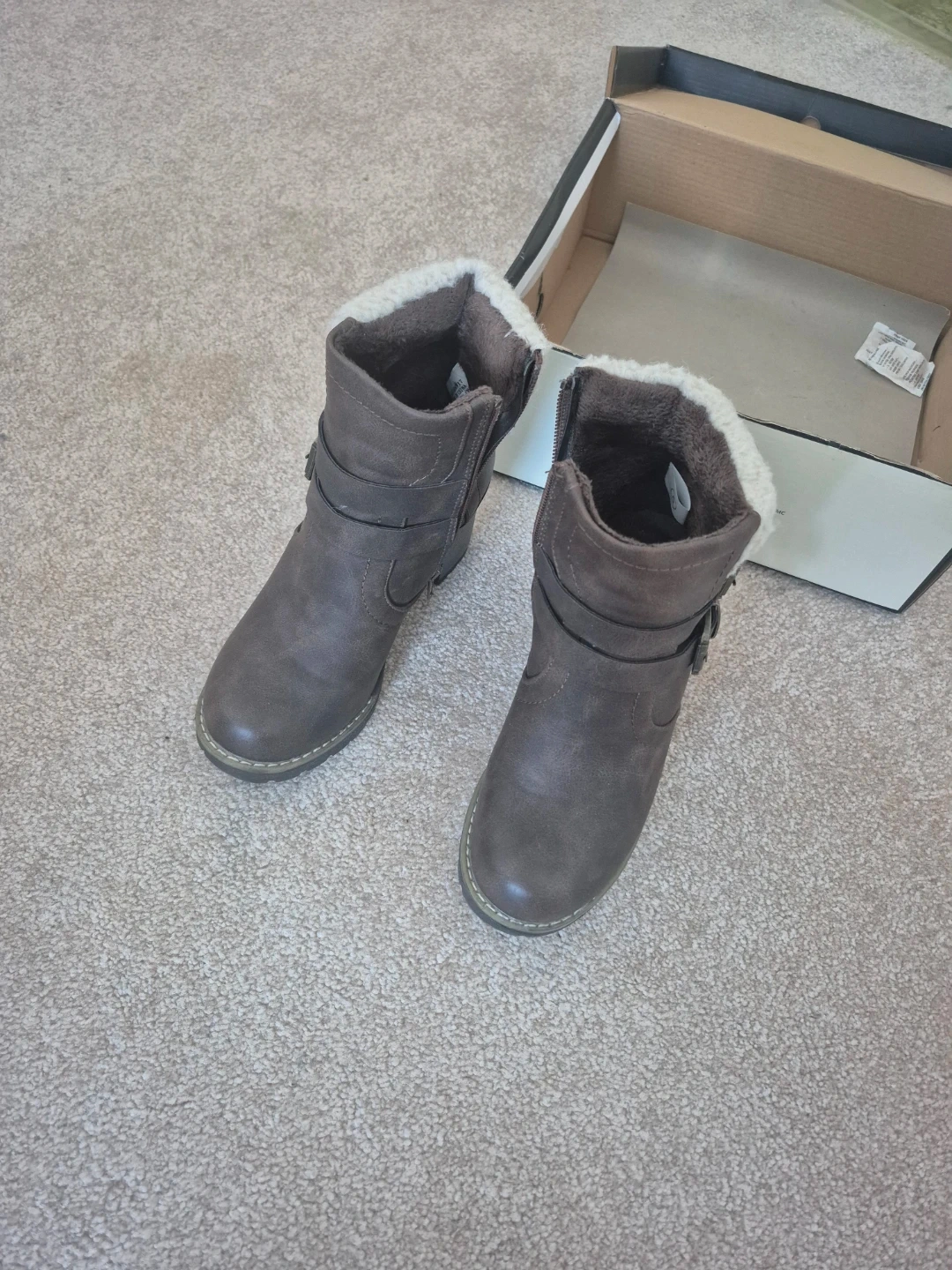 These cute brown heeled ankle boots are in great condition and ready for a new owner! They feature a side zipper and buckle detail, with a cozy faux fur lining. They come in the original box and are a size 5.