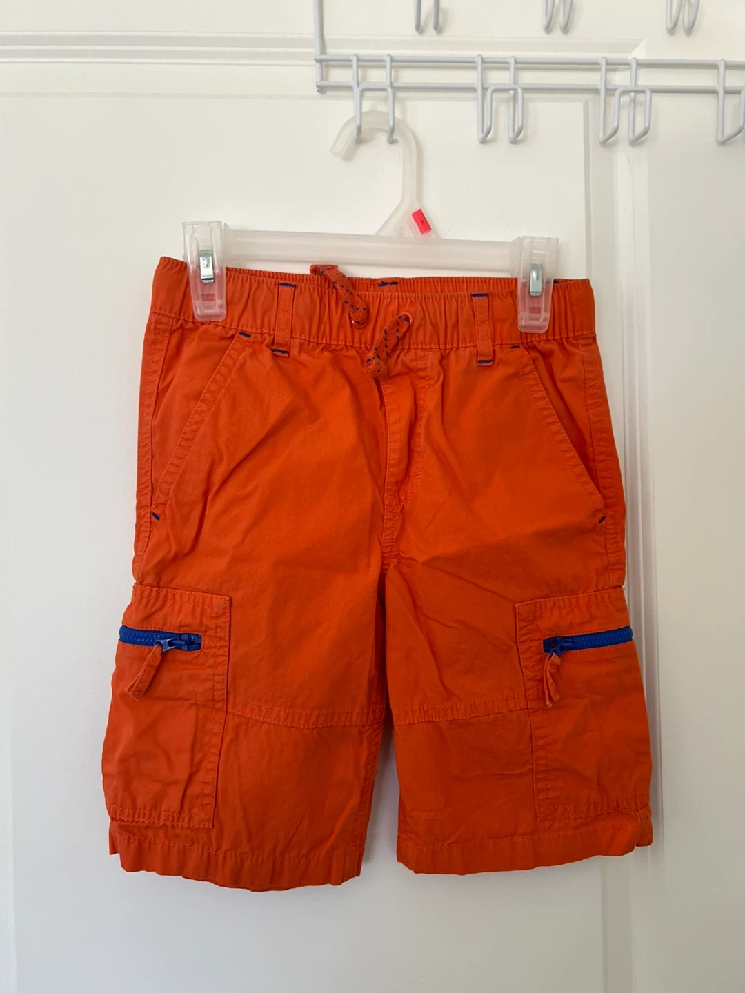 Bright orange cargo shorts in size 7! These shorts are perfect for any little adventurer. They feature a comfortable elastic waistband with a drawstring and cool blue zipper accents on the cargo pockets